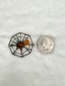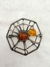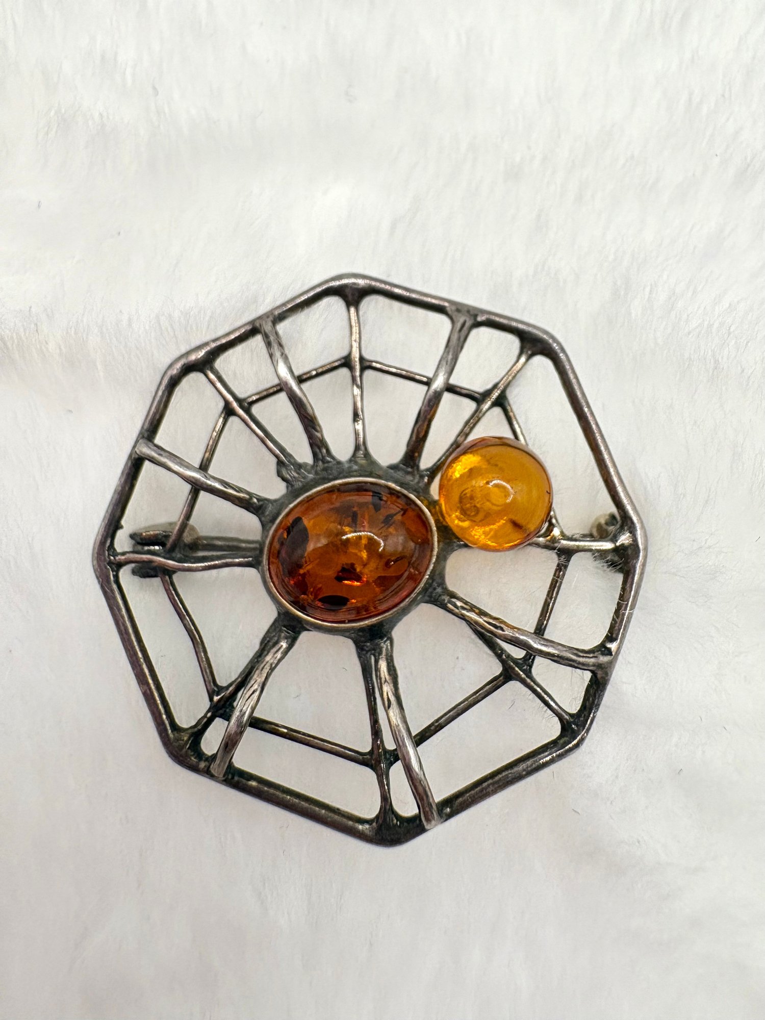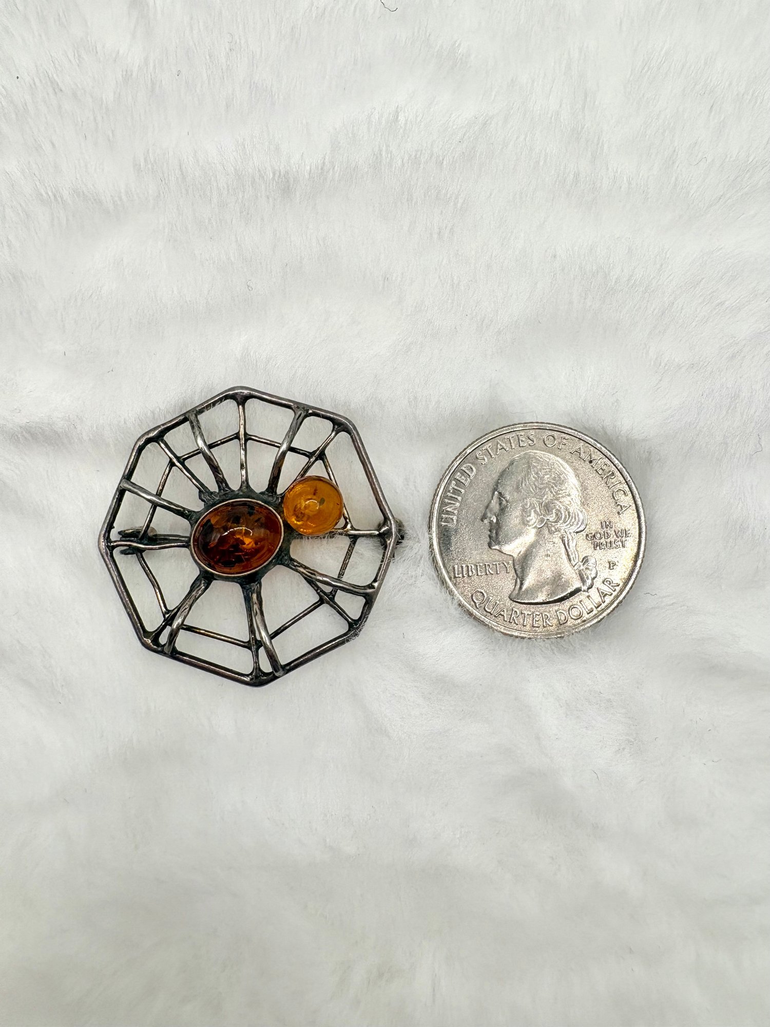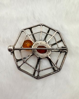 Cool translucent amber set in sterling silver spider in a web brooch pin . It measures 1 1/4 inches long and weighs 4.3 grams. Good quality. Good condition.