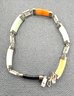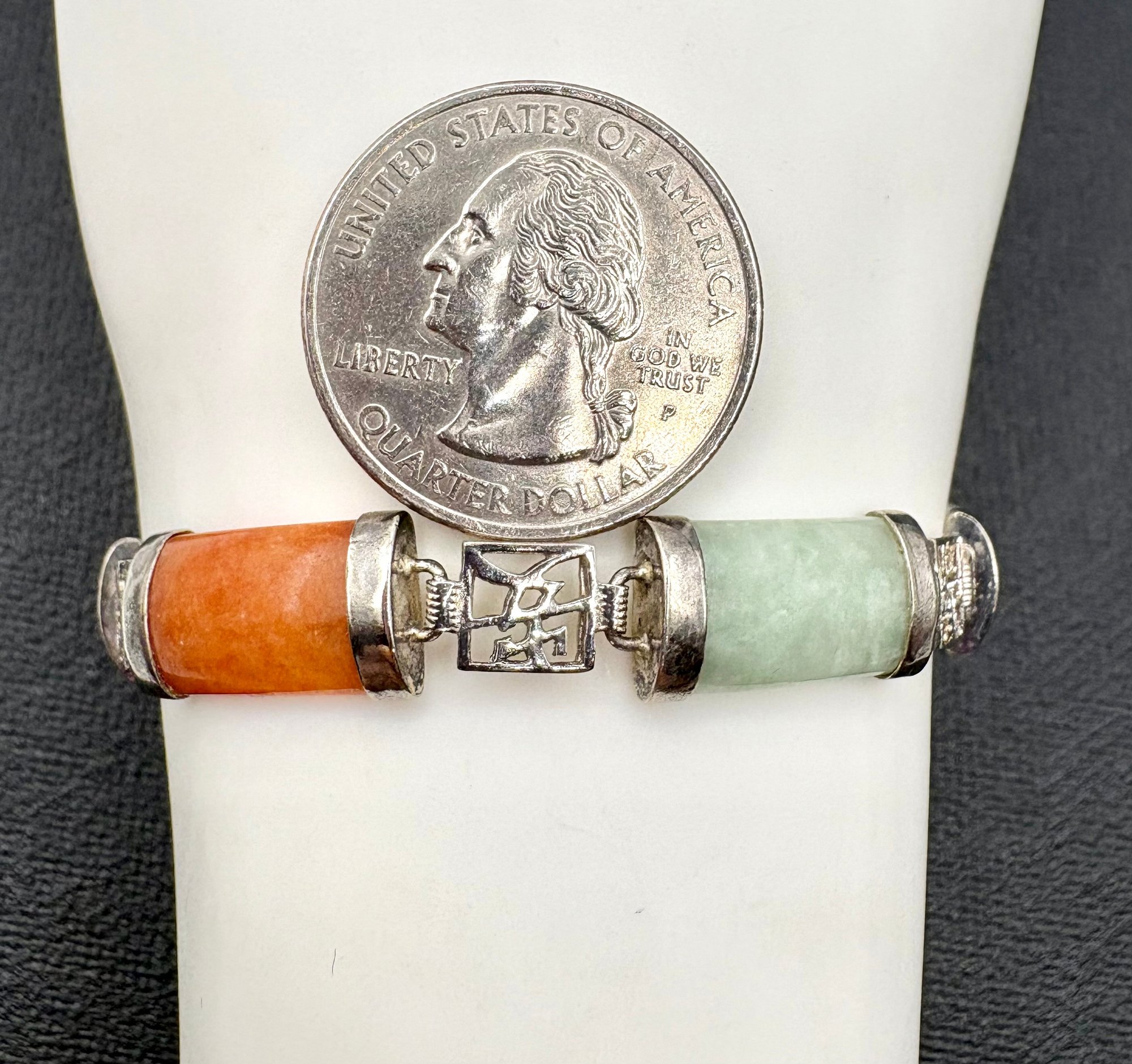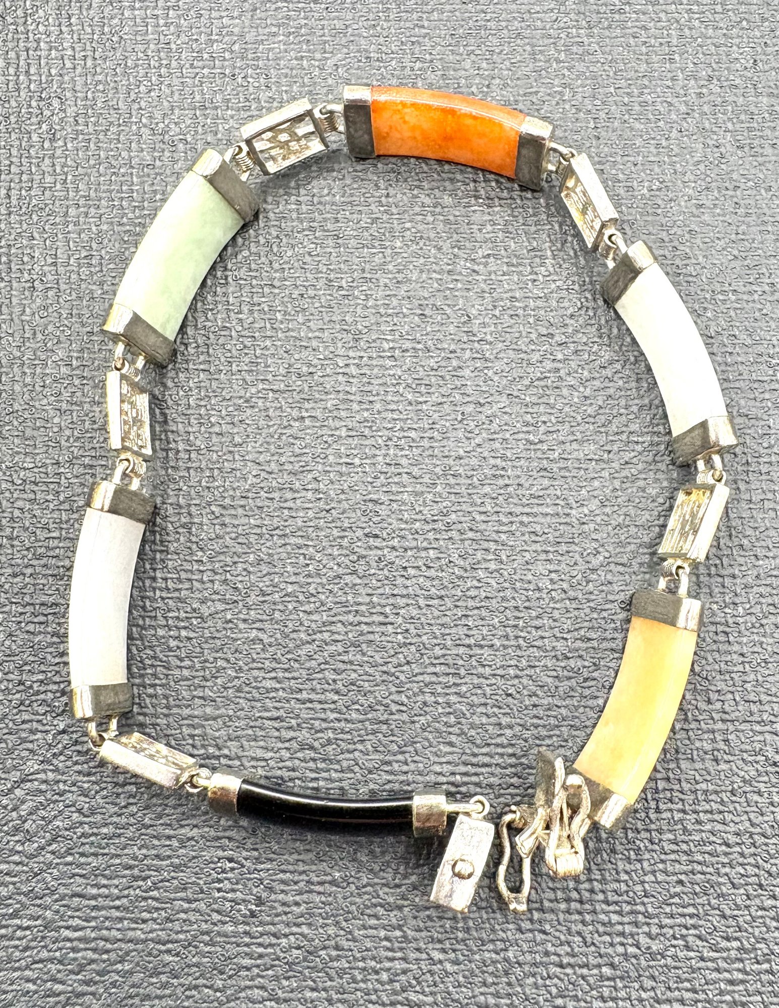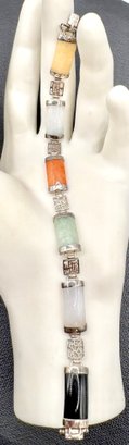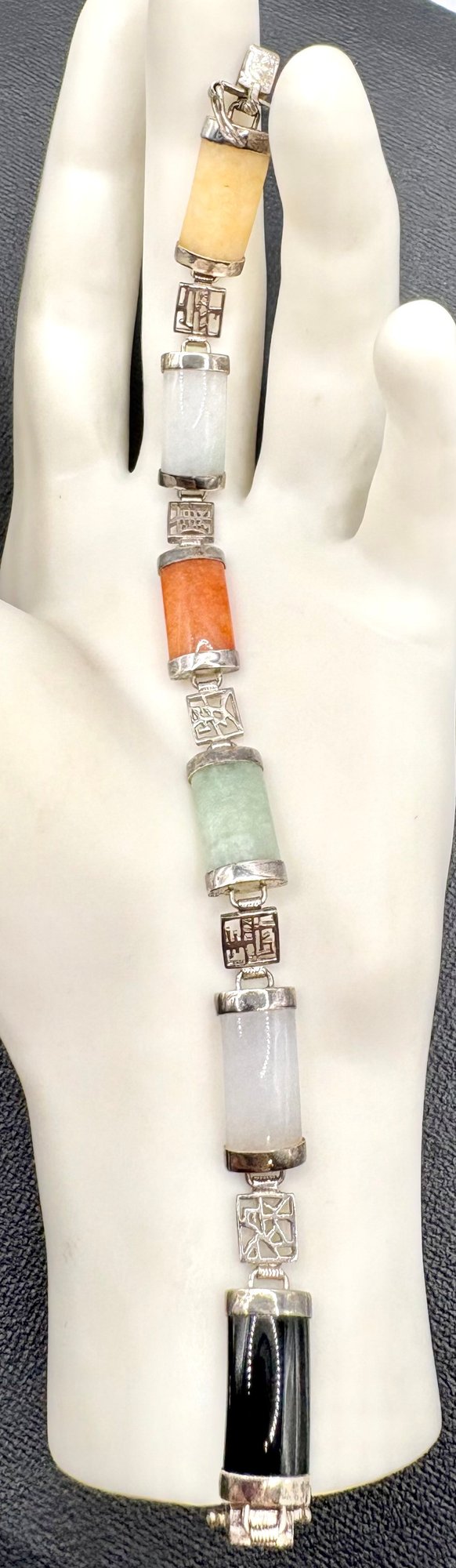Lovely sterling silver bracelet with multi colored jade. Measures 7 1/2 inches long and weighs 13.2 grams. Good condition. We work with UPS to get your purchases shipped . We drop off your order and they will contact you . You pay them directly and they deliver to your address.
