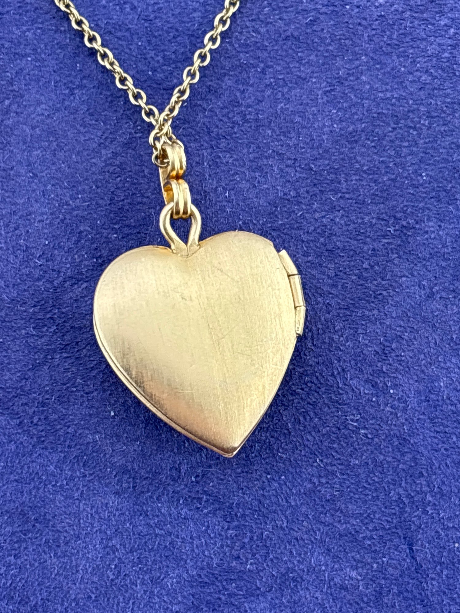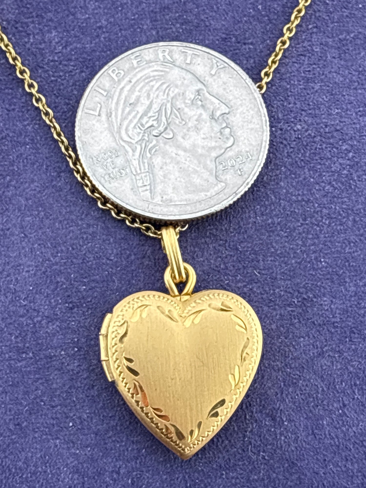 Vintage gold filled engraved heart locket on an 18 inch gold plated chain and weighs 2.8 grams . Good condition. We use UPS for shipping. We drop off the Monday after the auction and they will contact you and you pay them directly.
