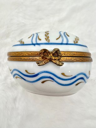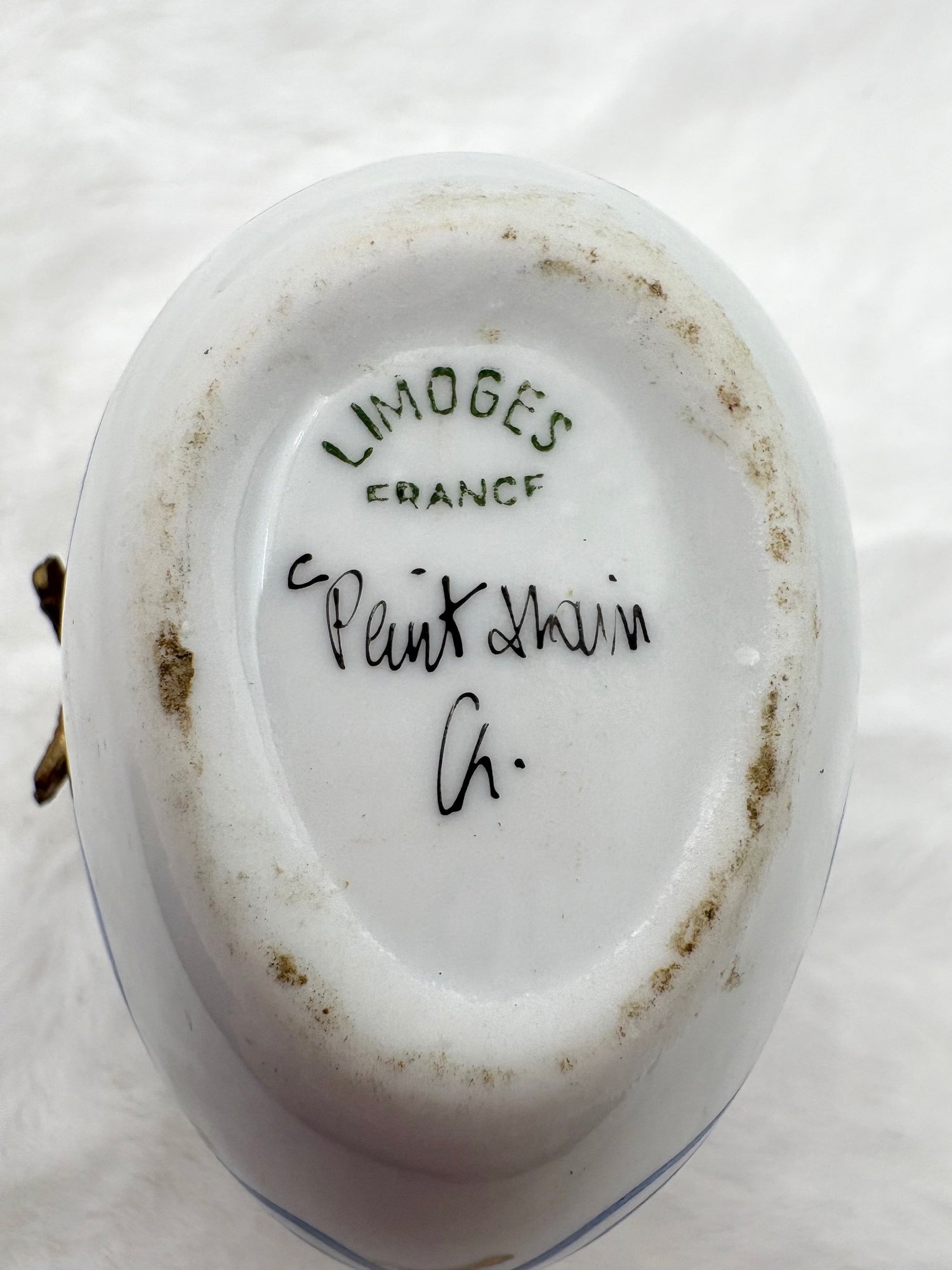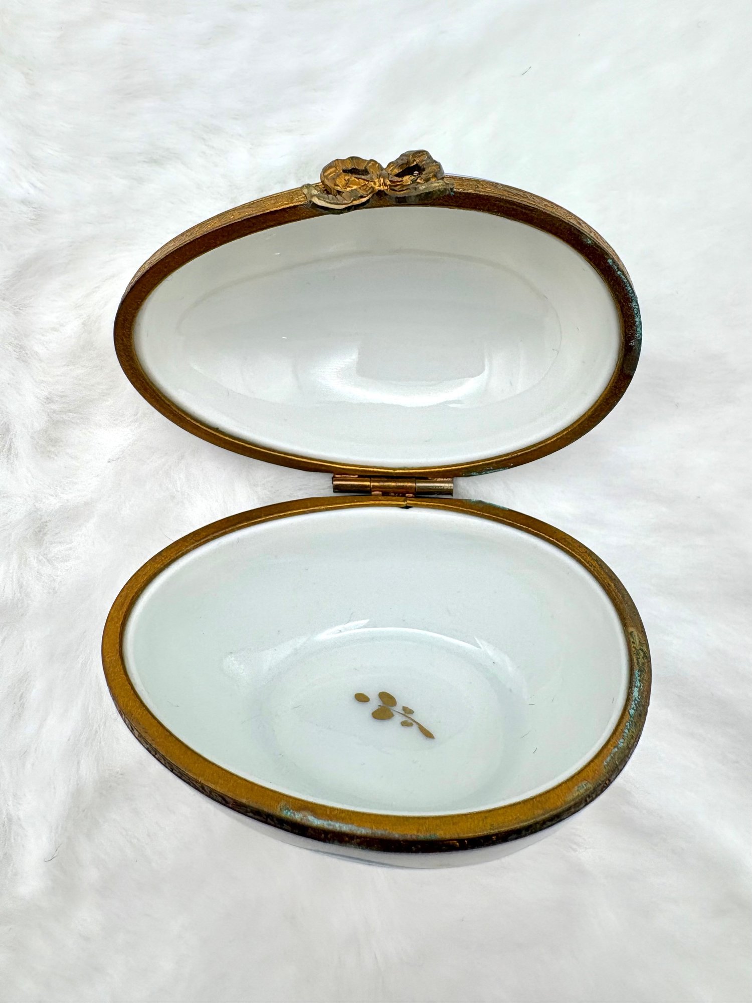 Sweet hand painted Limoges porcelain egg box . Measures 3 1/2 inches long. Good condition. We work with UPS to get your purchases shipped. We drop off your order . You pay them directly and they deliver to your address.