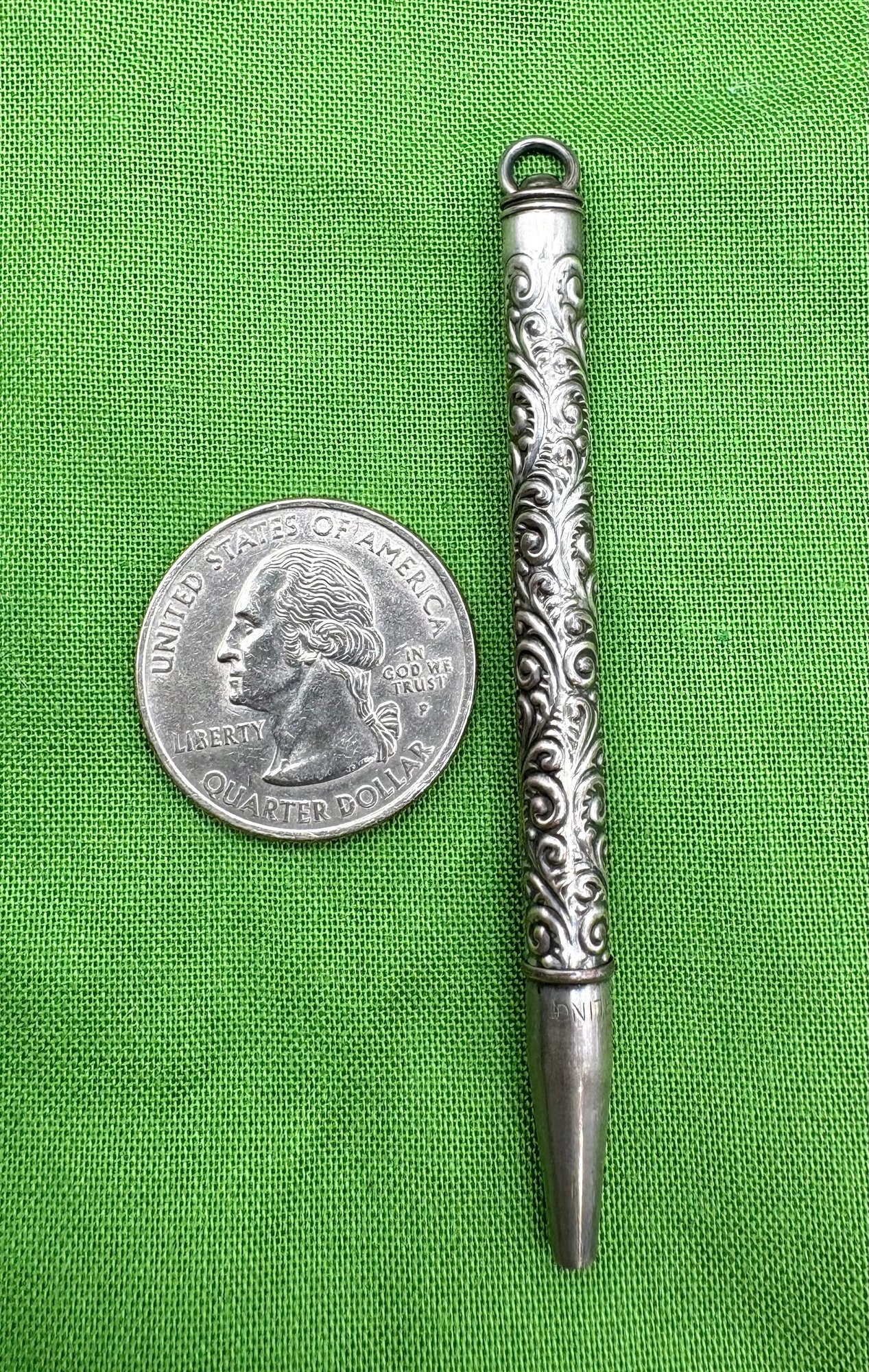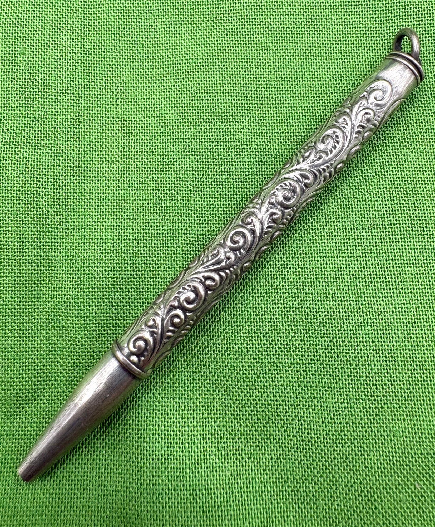 Unusual sterling silver Victorian chatelaine pencil pendant . Pencil is 3 inches long. Has original pencil in it . Good condition. We use UPS for shipping. We drop items off and they notify you and you pay them directly.