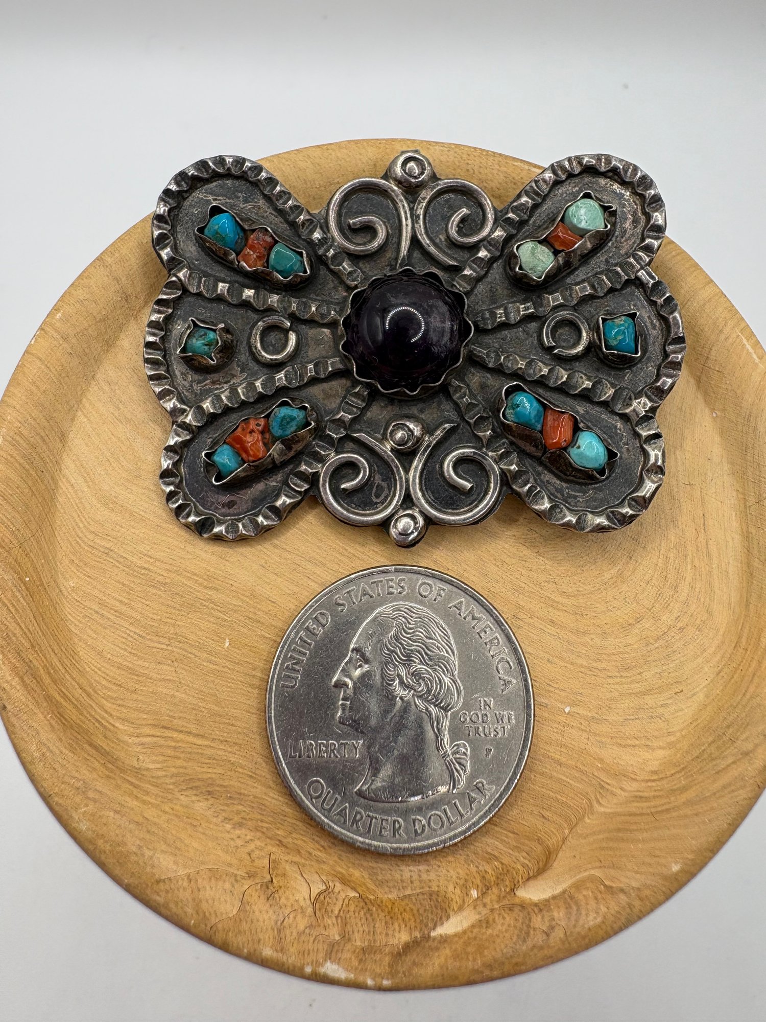 Large MATL STYLE sterling silver with amethyst, turquoise and coral brooch, pin , has bale to be worn as a pendant. It weighs 17.4 grams. Good condition. We work with UPS , we drop off and they call you and you pay them directly.