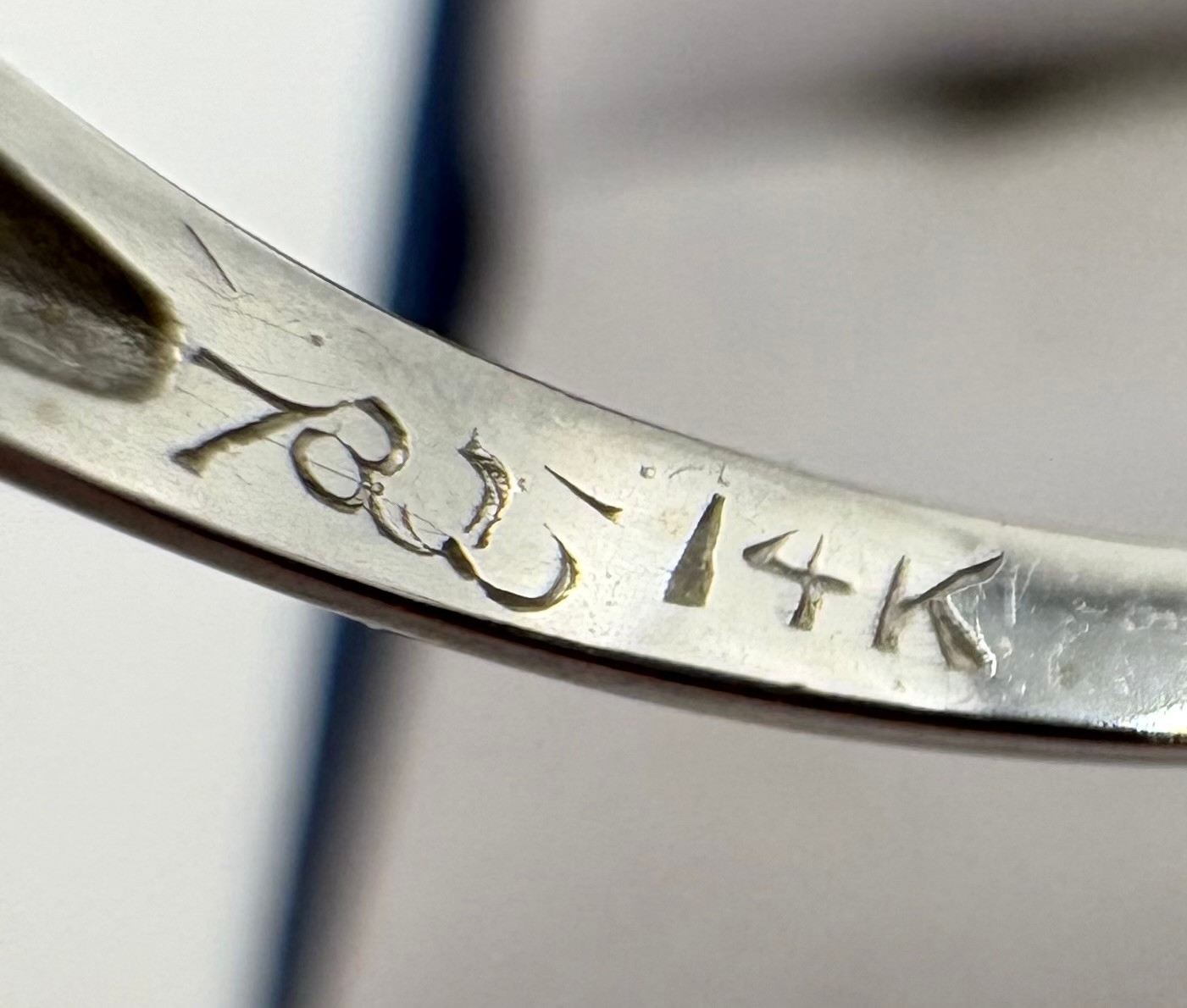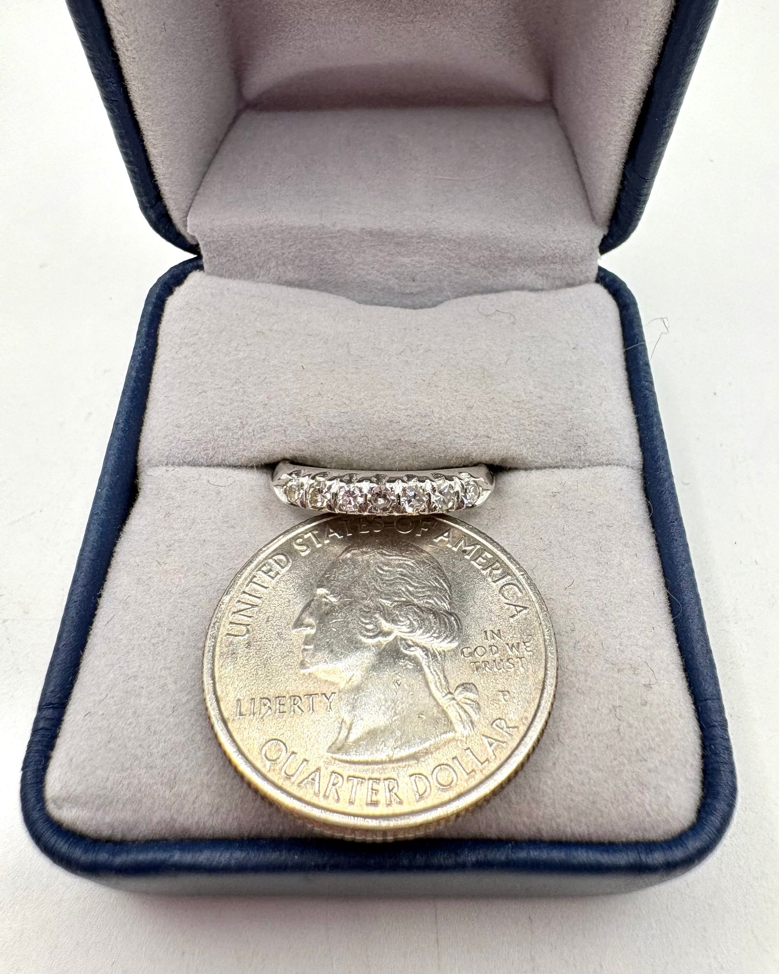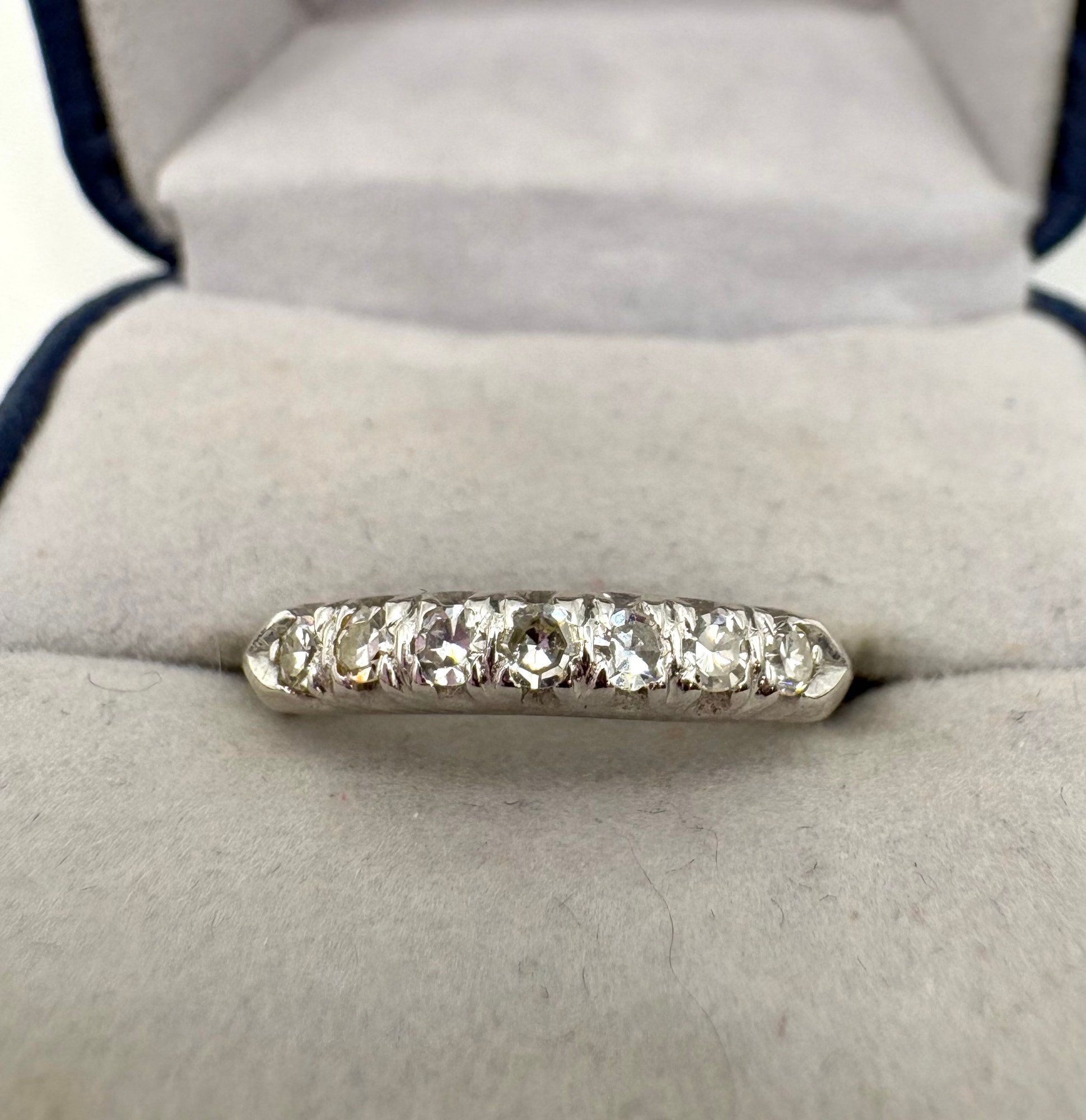 Beautiful vintage ring with 7 genuine diamonds set in a 14 kt white gold fishtail setting. Dates from the 1950s . Size 6 and weighs 2 grams. Good condition. We use UPS for shipping. We drop off the Monday after the auction and they will contact you and you pay them directly.