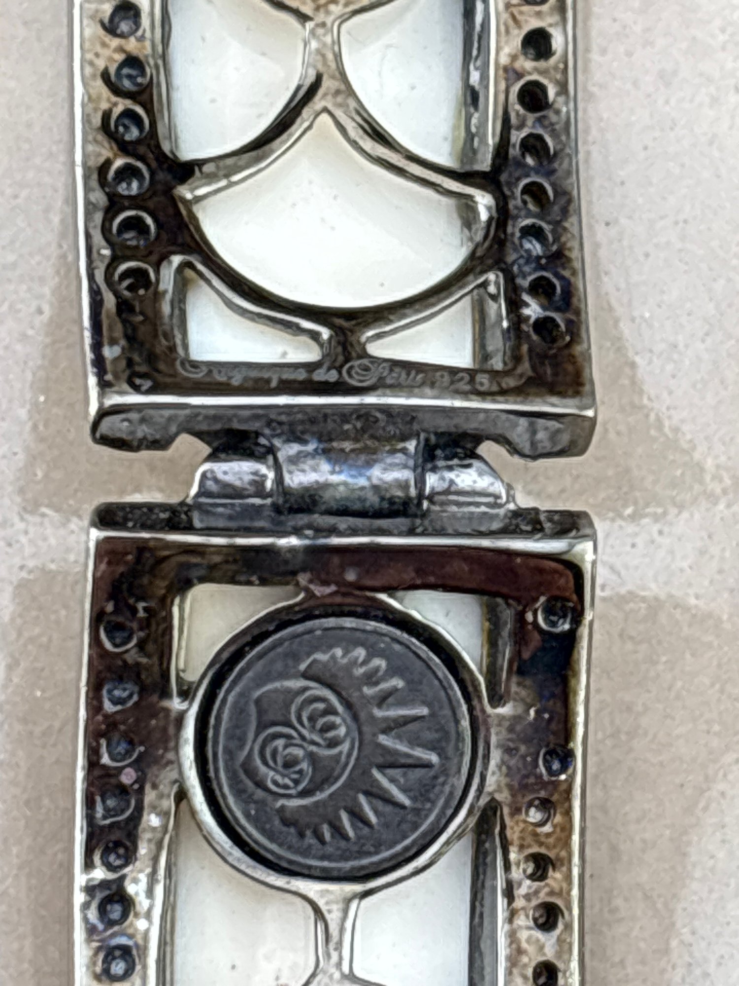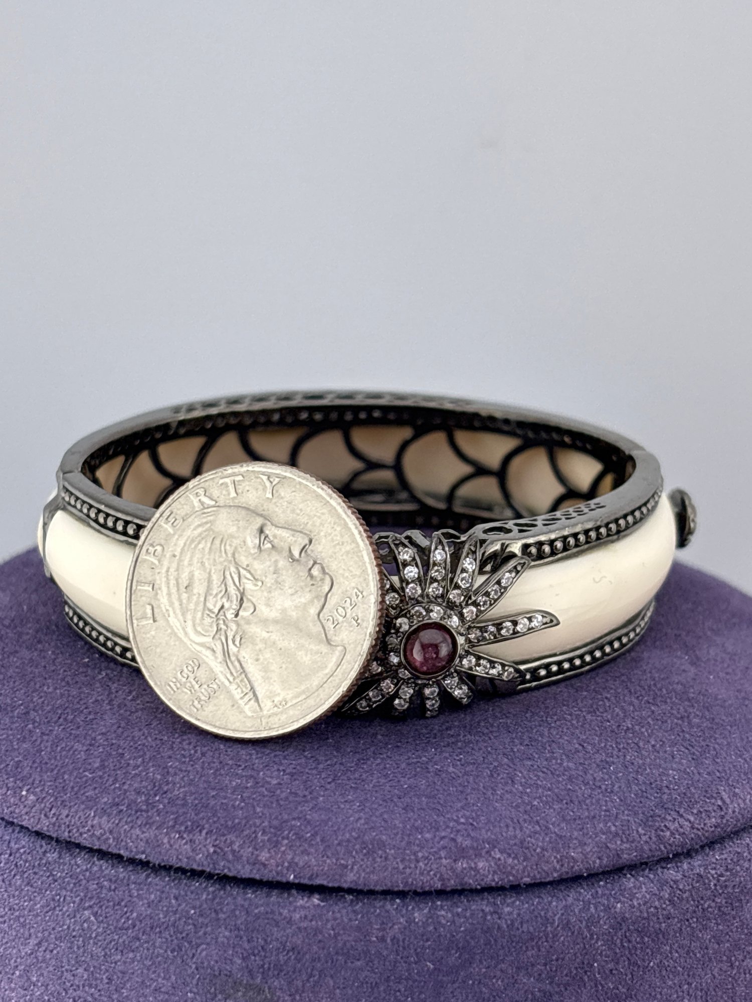 Angelique de Paris Beautiful vintage sterling silver bracelet with a tourmaline and crystals and lucite inside. Wonderful quality signed Measures 6 inches inside and weighs 37 grams. Good condition.