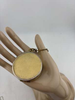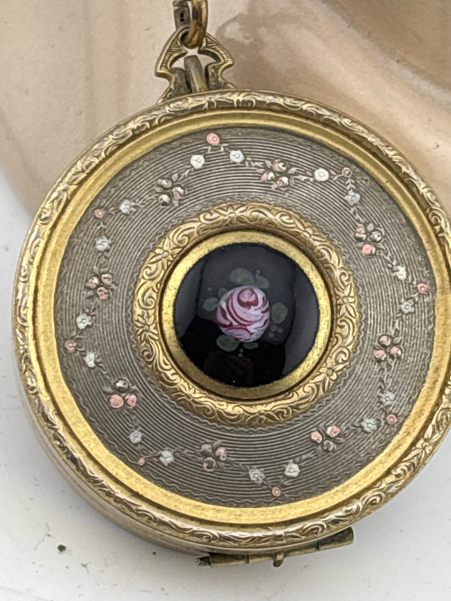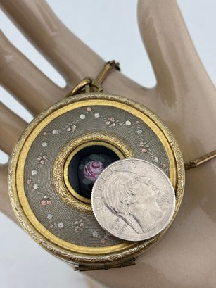 Cool powder compact with enamel rose and chain for dancing . Dates from the 1920s . Good condition .
