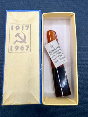 Cool 2 color amber cigarette holder from Russia in original box with tag. Measures 2 3/4 inches long and weighs 8 grams. Excellent condition.