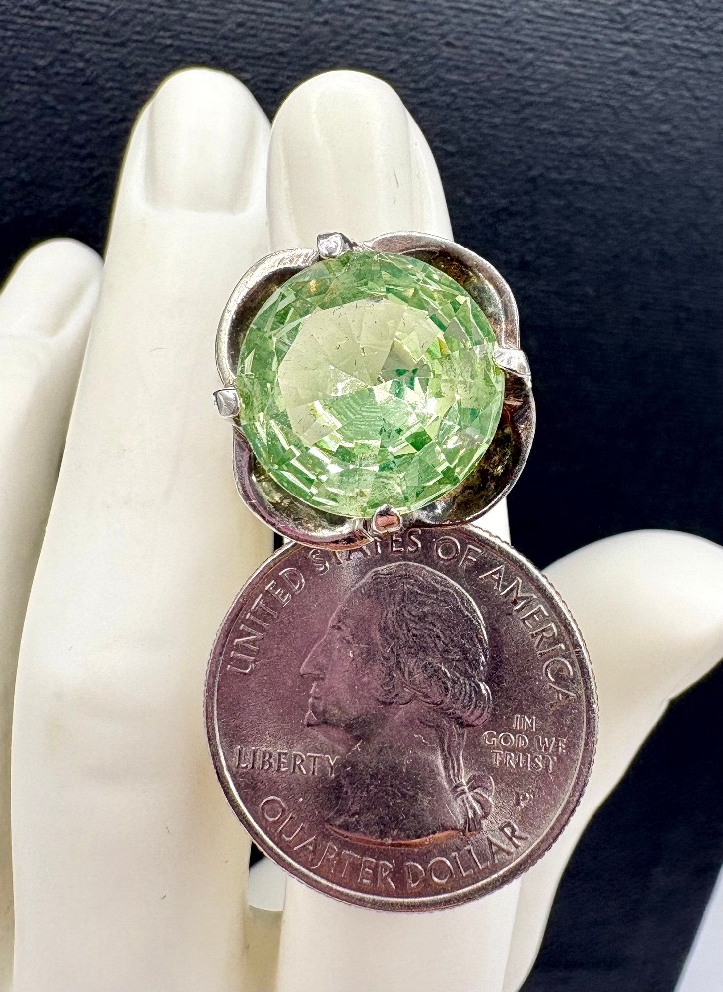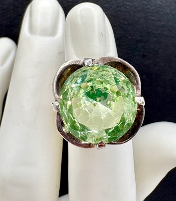 Beautiful ring dates from the 1960s . It has a large set Vaseline , uranium glass in sterling silver. Fabulous glow! . Size 5 and weighs 10 grams. Excellent condition.