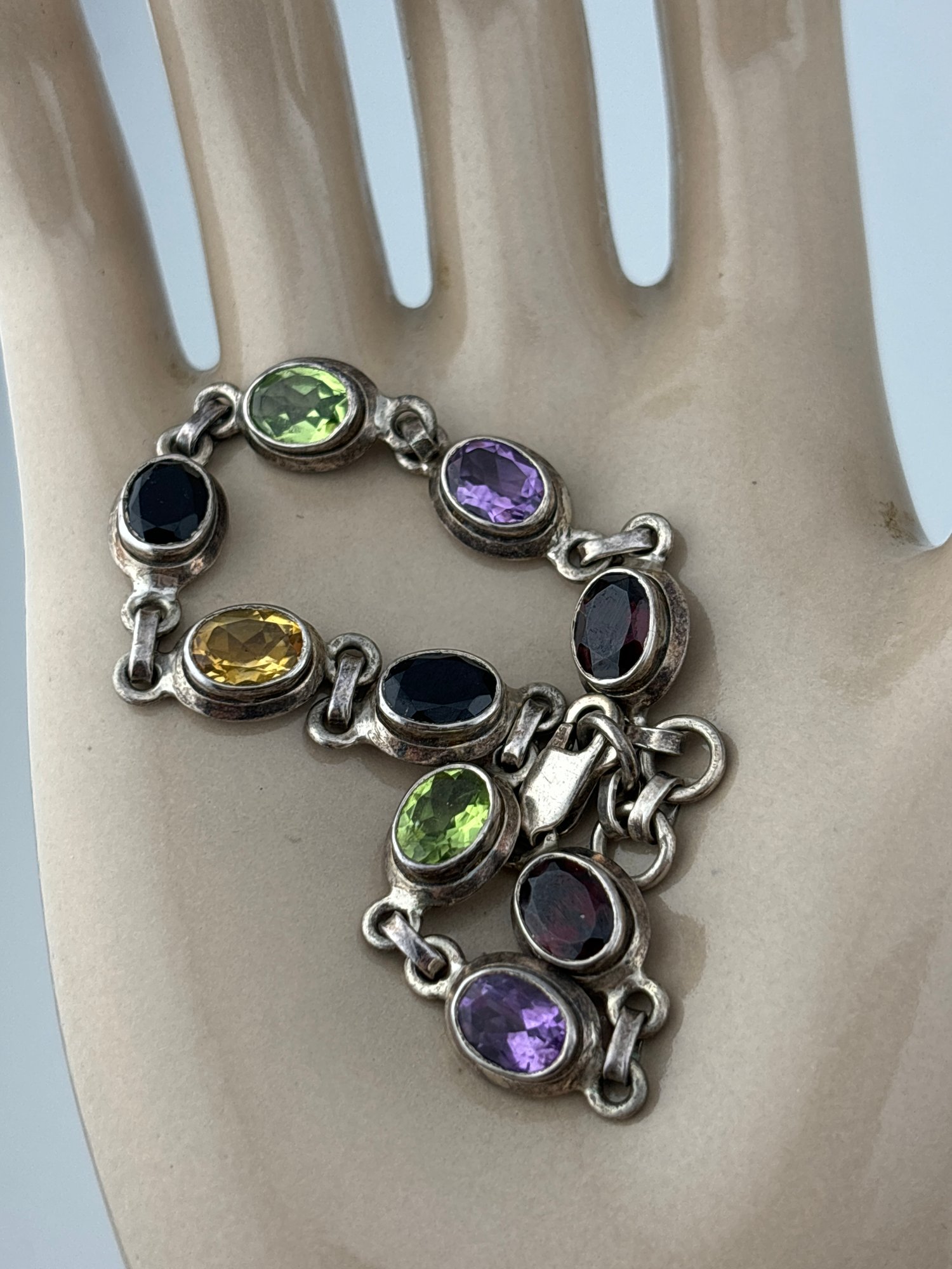 Vintage bracelet with garnets , citrine, peridot , amethyst and iolite bezel set in sterling silver. Measures up to 8 1/2 inches long and weighs 17.8 grams. Good condition.