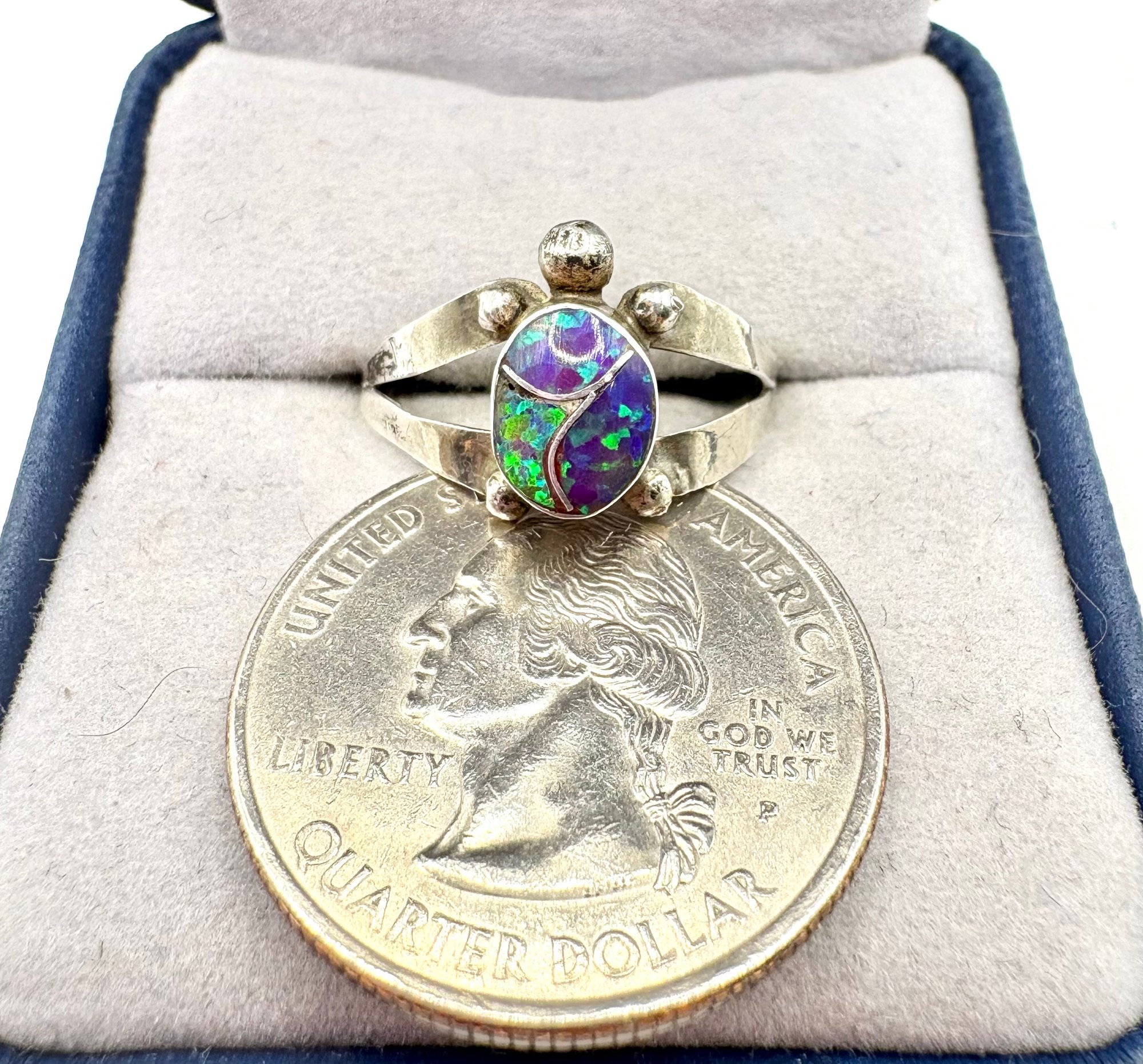 Sweet little sterling silver synthetic opal turtle ring . Size 7 1/2 and weighs 1.5 grams. We work with UPS to get your purchases shipped. We drop items off and they contact you . You pay them directly and they deliver to your address.