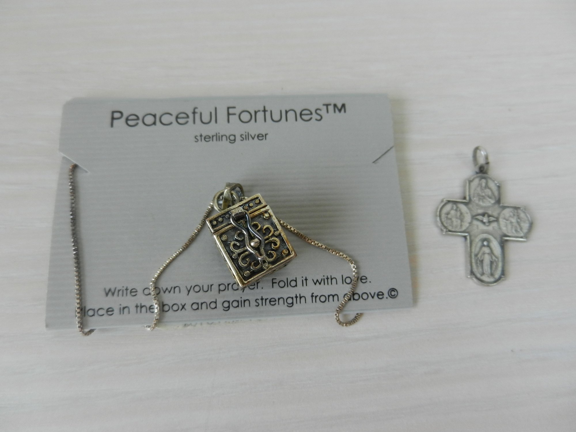 The prayer box is approx ½” cube. The crucifix is marked 925 on the back and it is approx 1 ¼” high inc bail.
