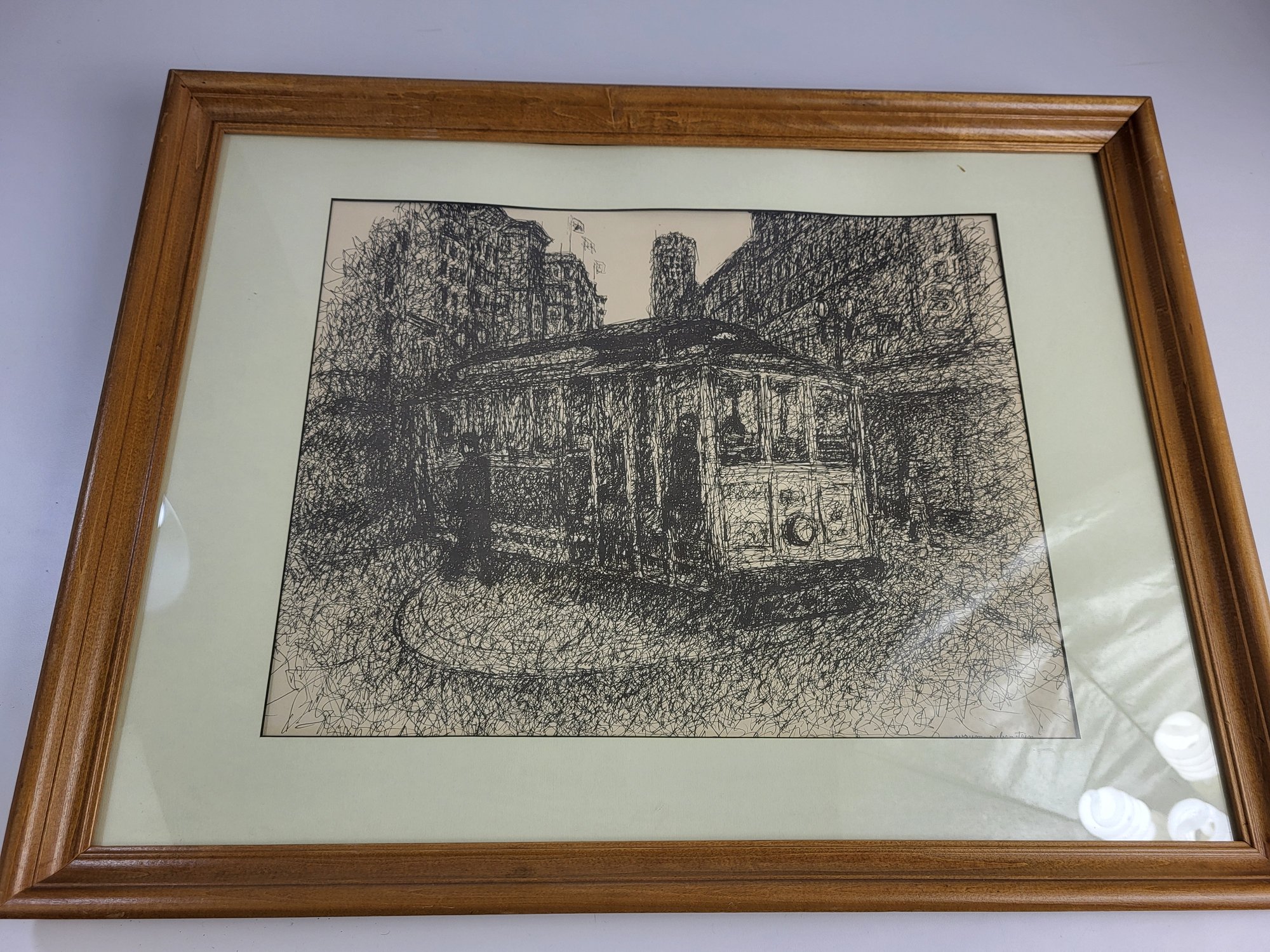 Abstract Trolley Scribble Pen Picture Glass/ Wood Frame 26" X 20" Inches