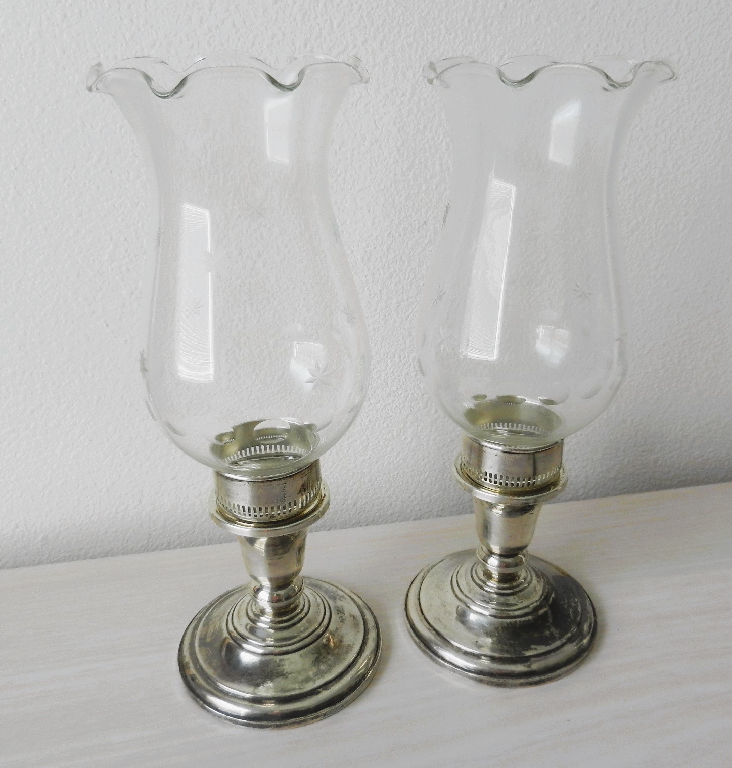 These are in a very good condition, and I can see no dents. There is only a light tarnish here and there. The glass has a pretty pattern in it. There is a teeny tiny fleabite on the bottom of one of the chimneys and a slightly bigger one on the other. These are, as I said, on the bottom, and you can’t see them when the chimneys are in place.