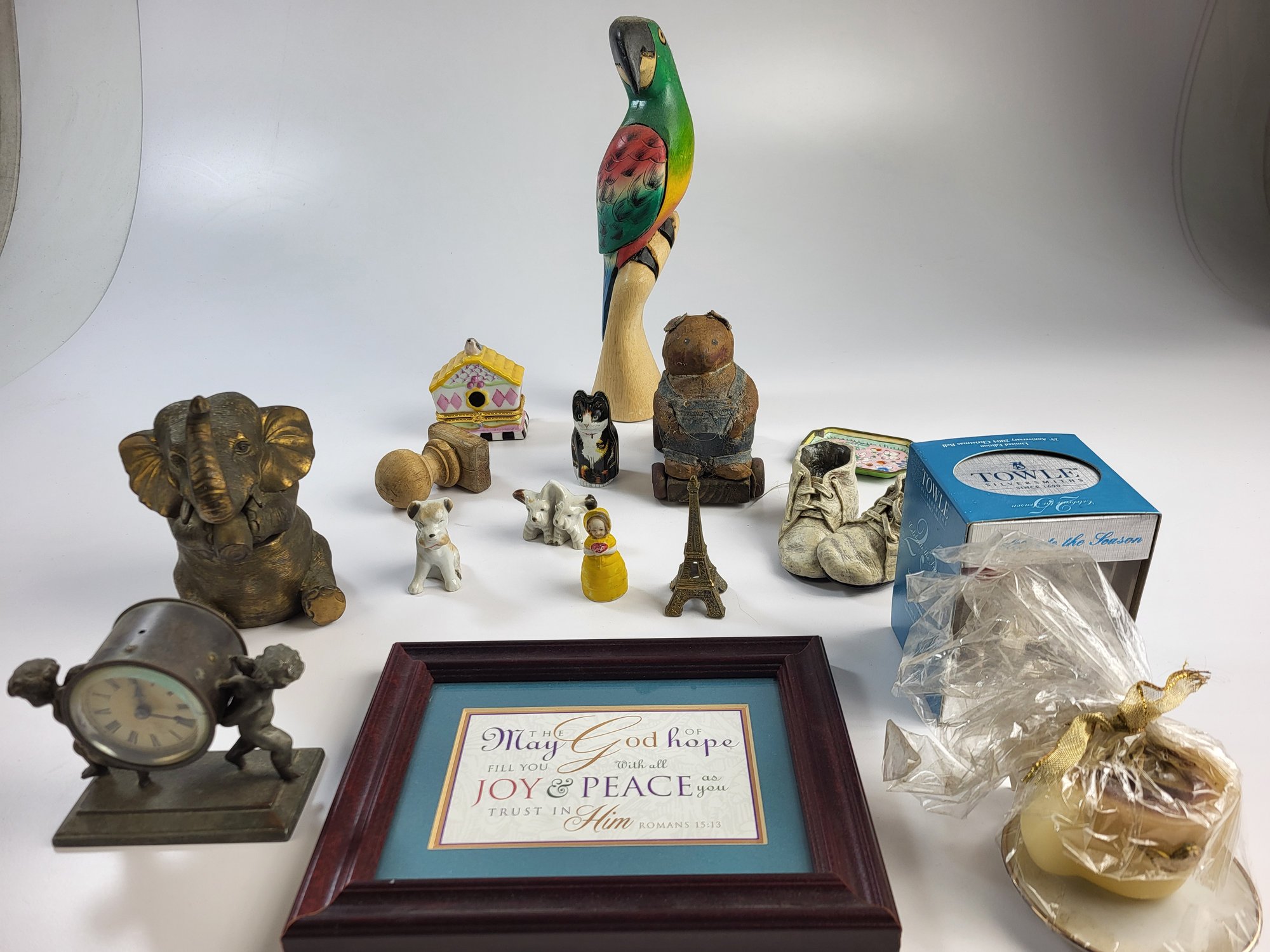 Box Lot H - Towle Silversmith Brass Elephant Wooden Parrot Metal Clock Different Tower Etc
