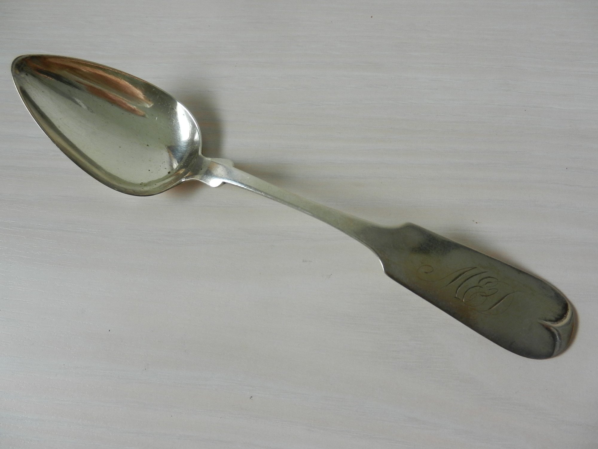 I believe this is coin silver. It has a monogram – possibly MED but it is hard to make out.