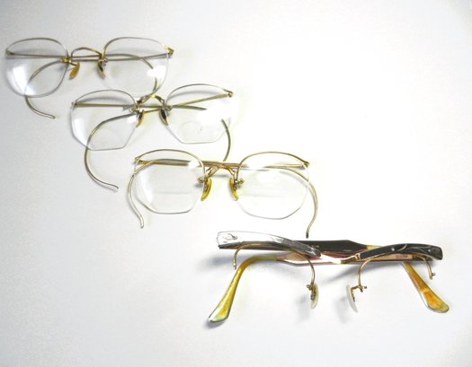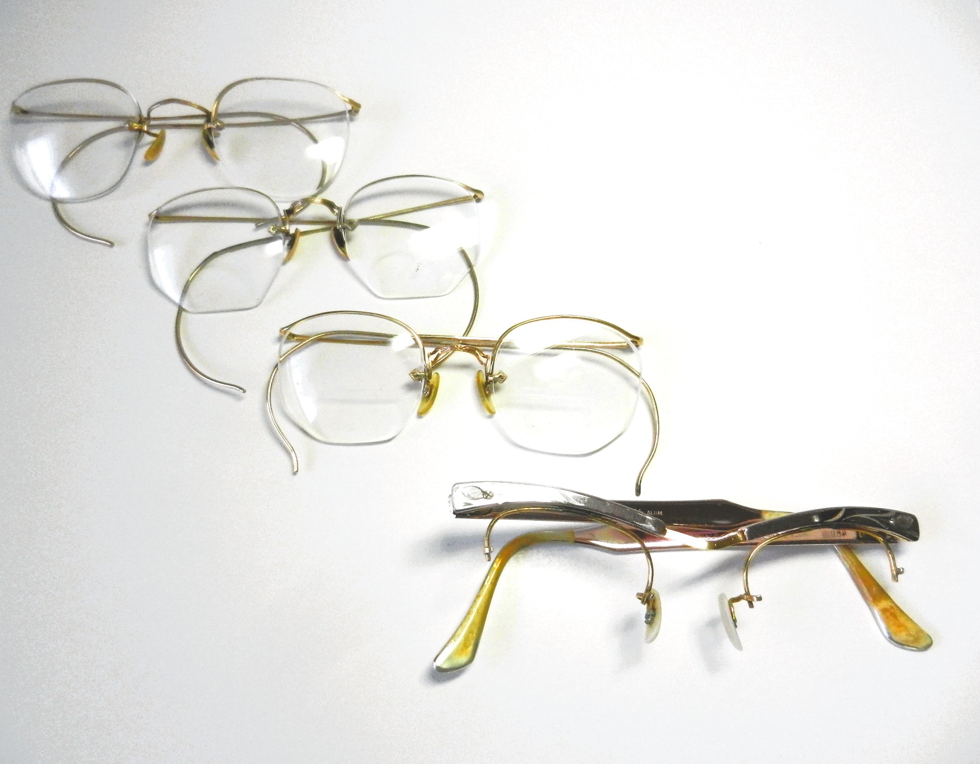 The bottom pair has no glass. I think the ear ends have a plastic piece on them which has discolored. These all look in a goodish condition.