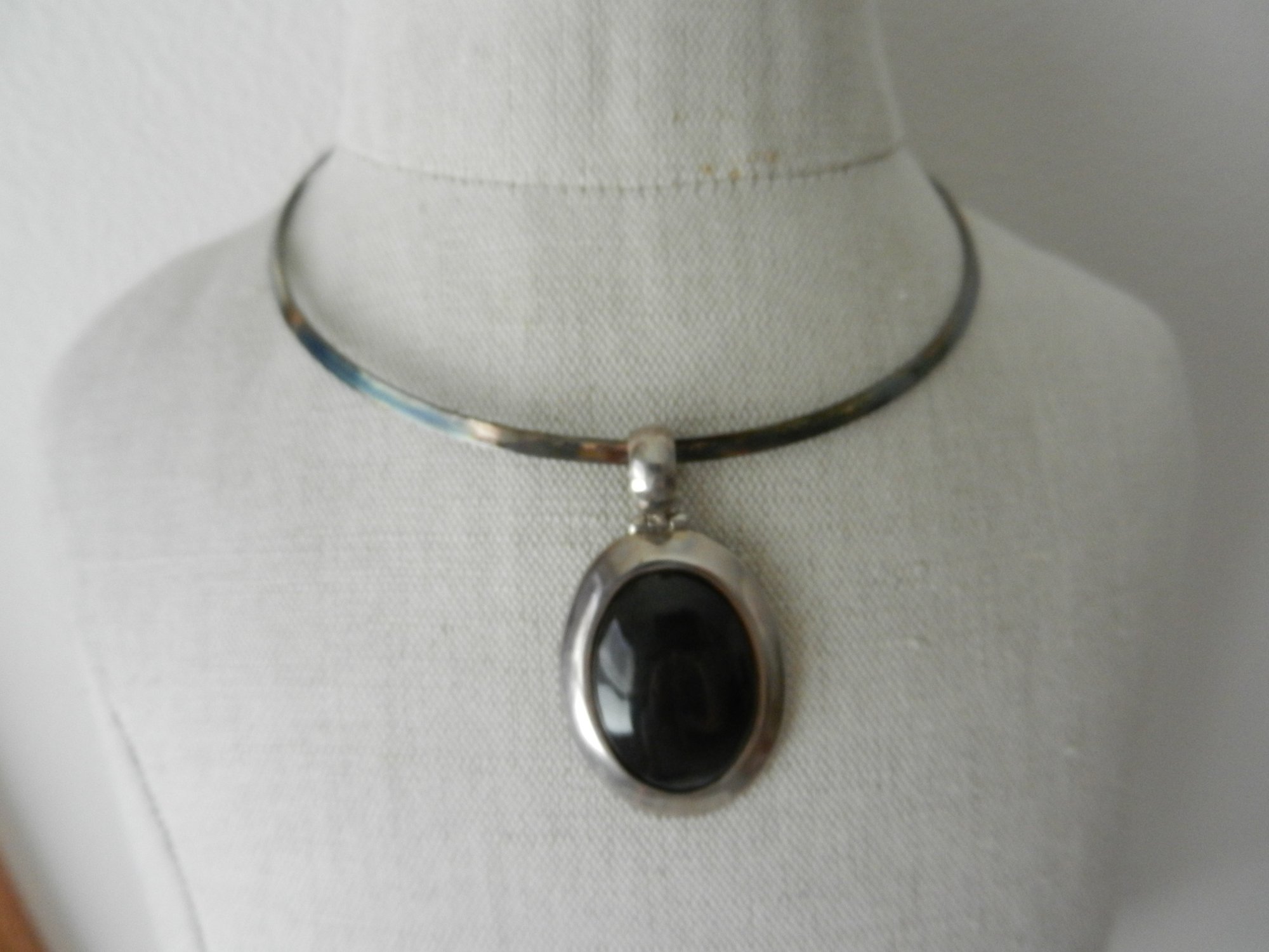 (E6) Vintage Sterling Silver choker Collar with black Onyx pendant