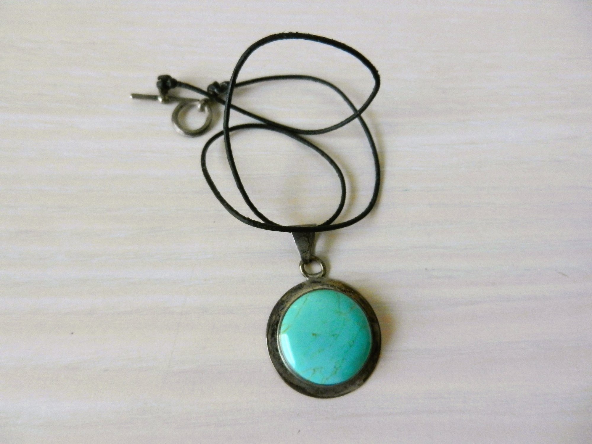 (E9) Vintage Sterling silver and Turquoise pendant Mexico on leather cord