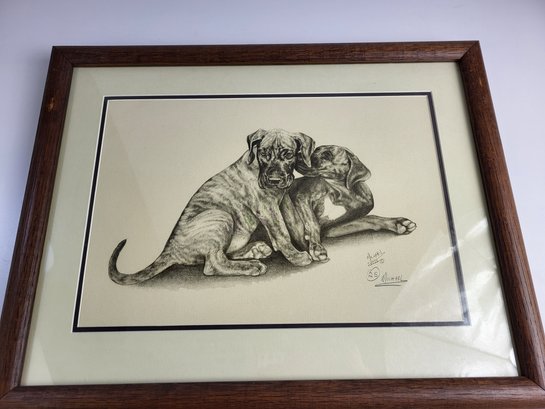 Michael 1973 Hound Dog Pencil Shade Drawing Wooden Frame Glass Front 18" X 14" Inches
