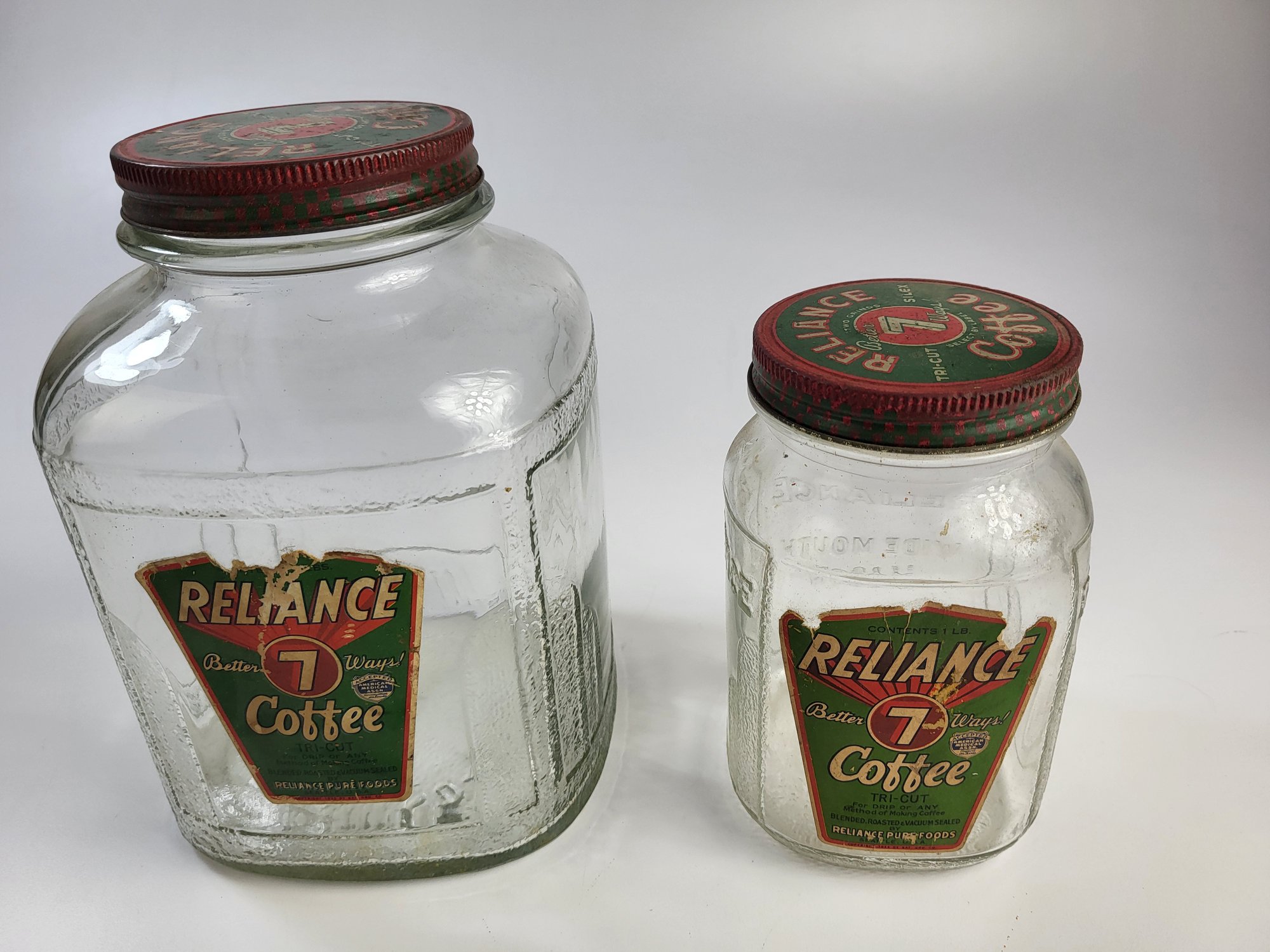 O - Vintage Reliance Coffee Glass Jars Metal Screw Cap Seattle 1935