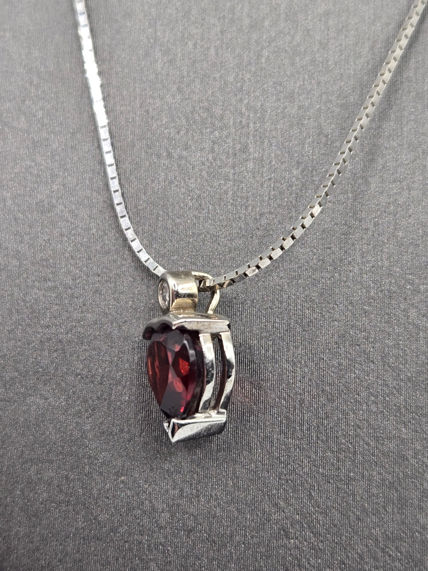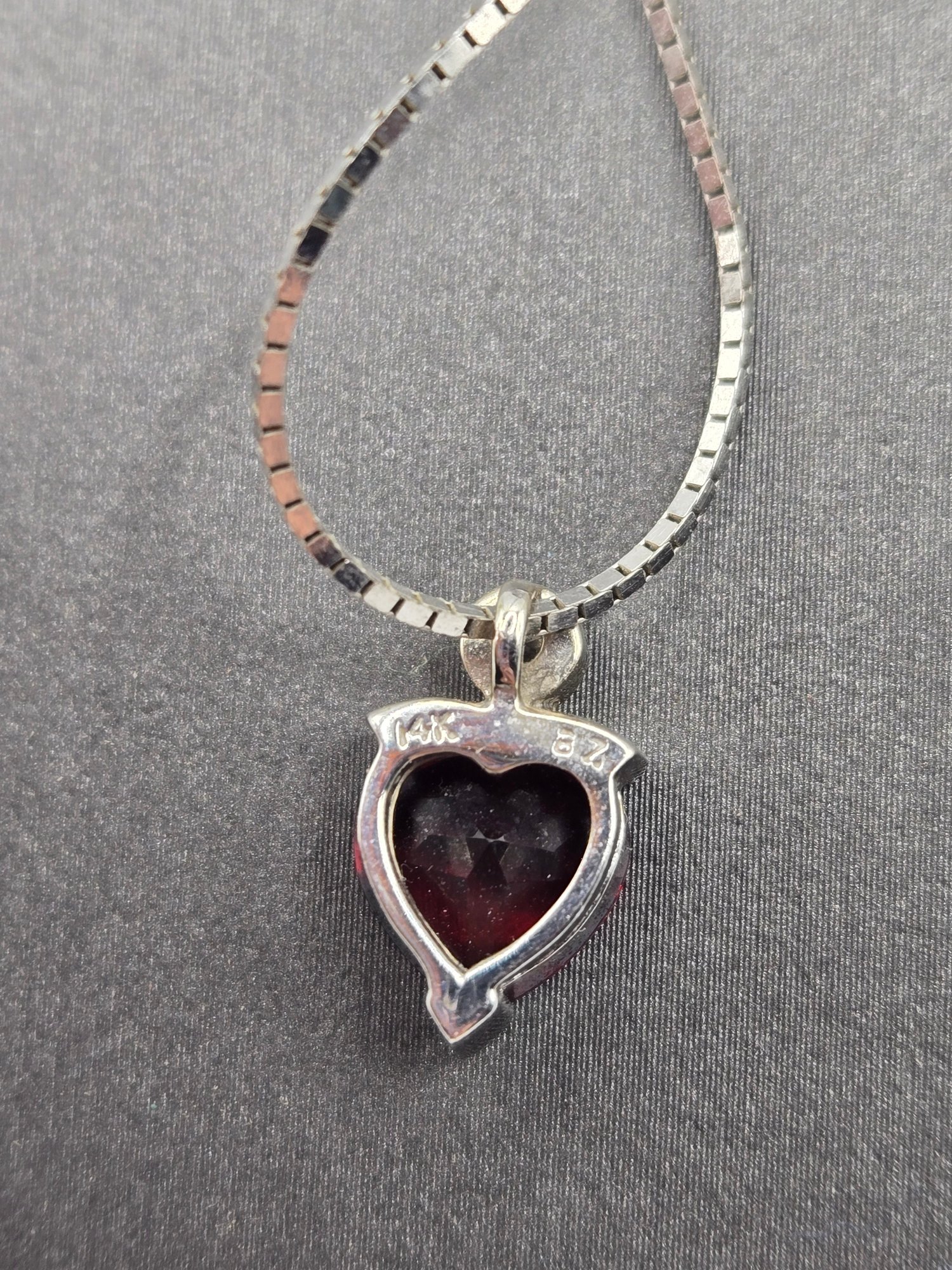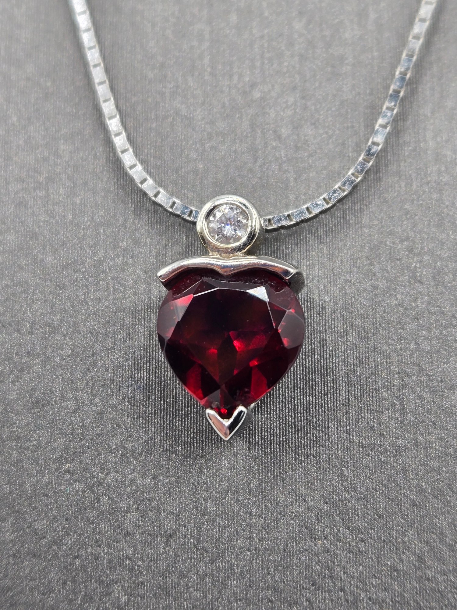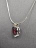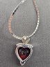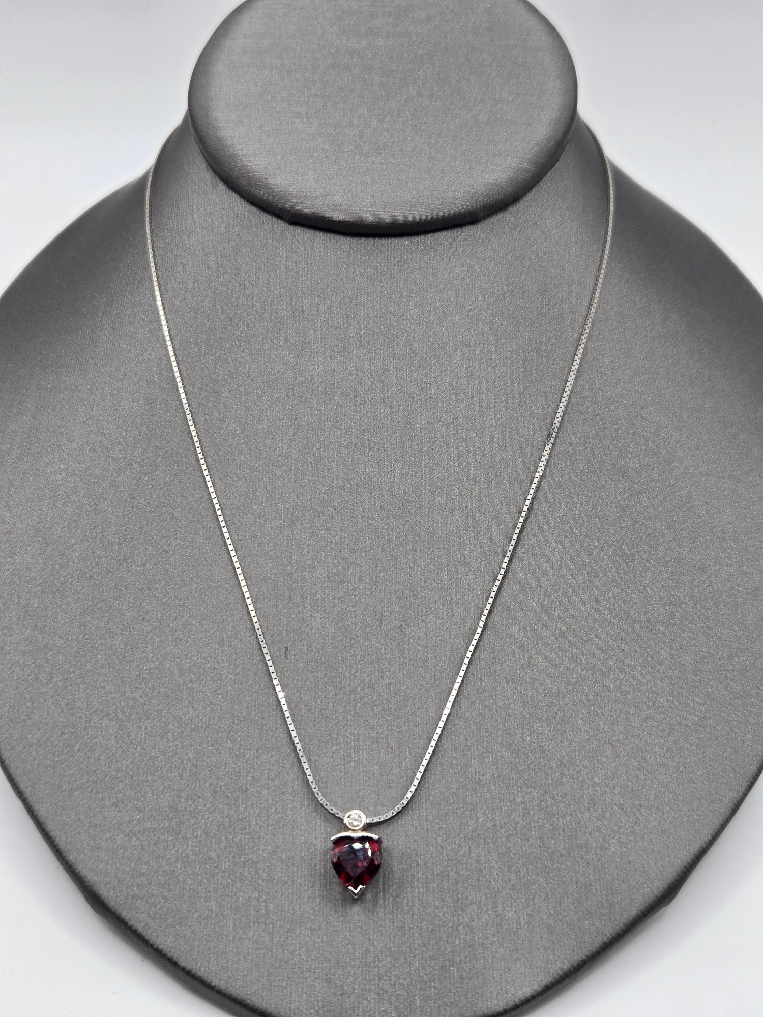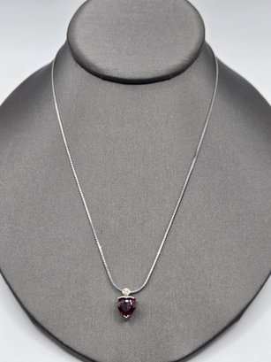 14K white gold Garnet and Diamond Necklace. Heart shaped garnet with diamond above