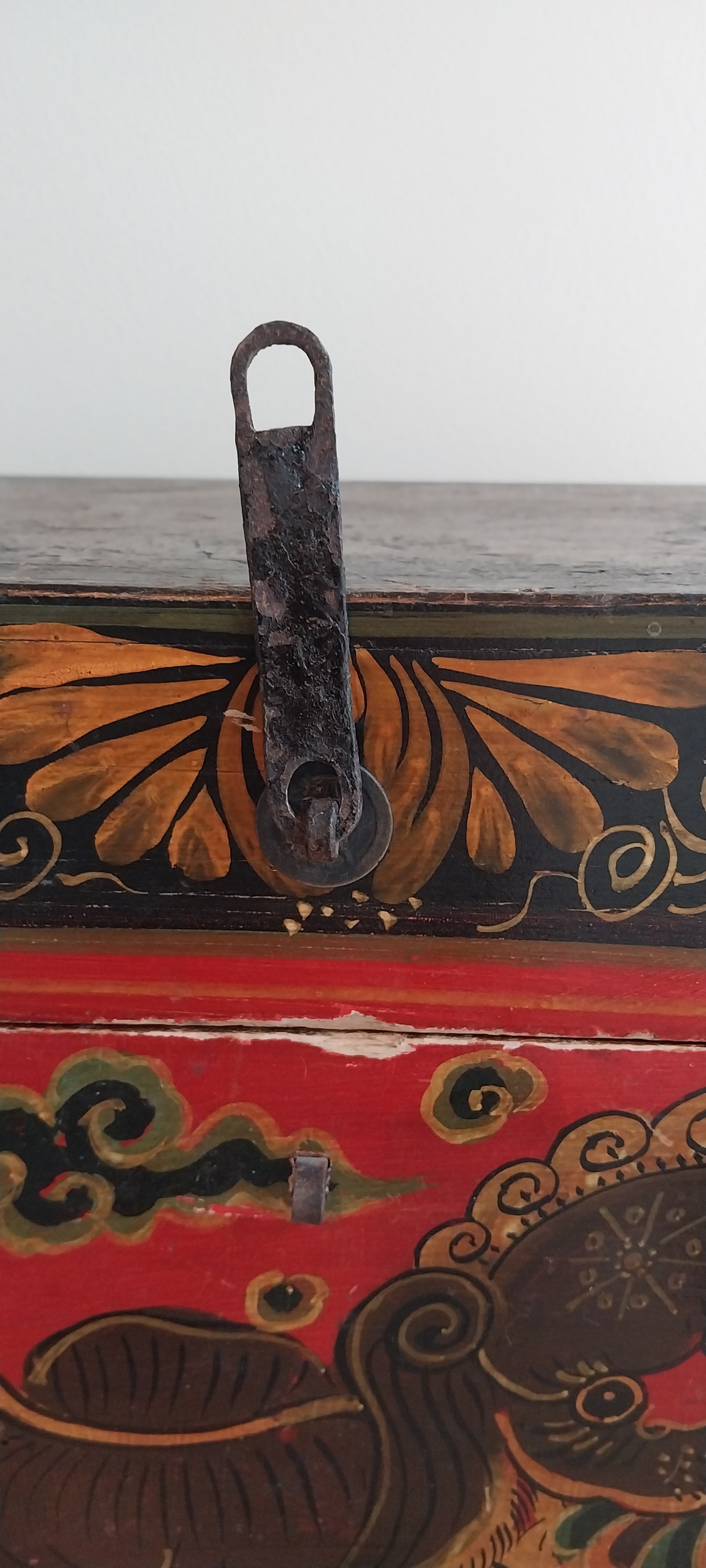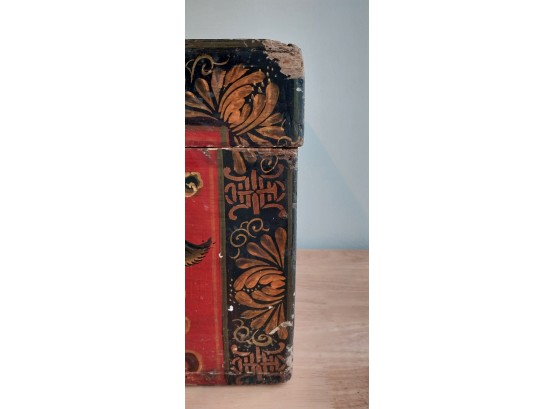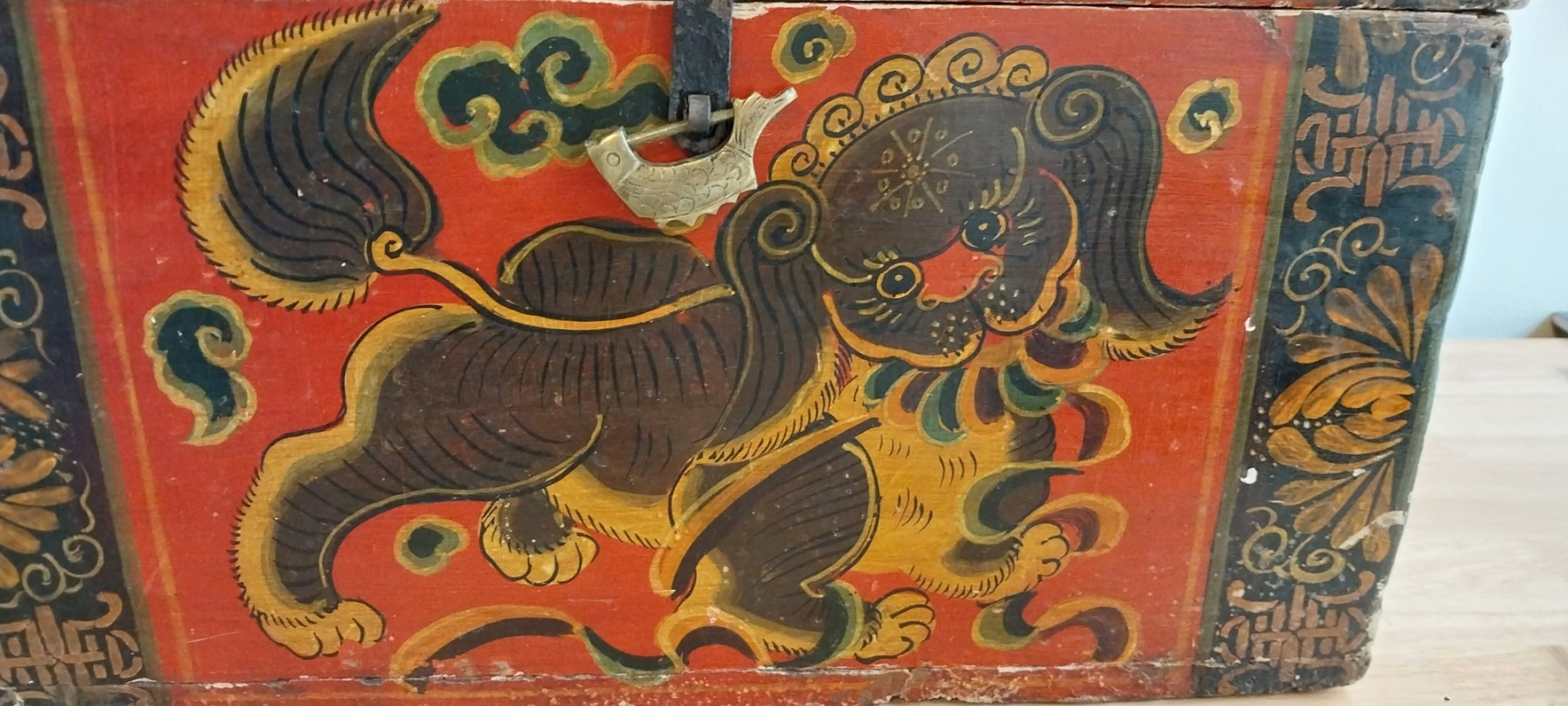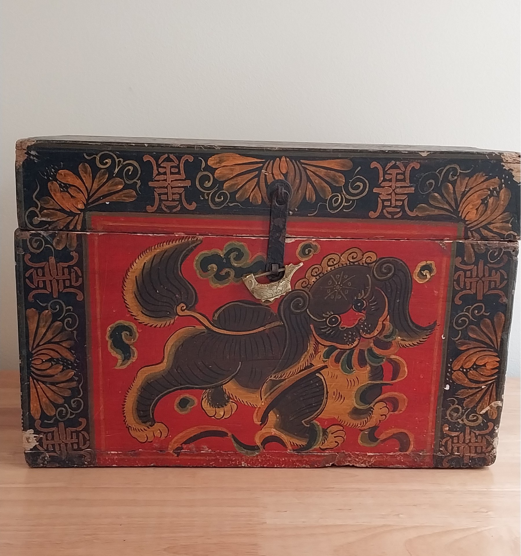19th - 20th Century Tibetan Painted Trunk. Lacquer with foo dog desig.
