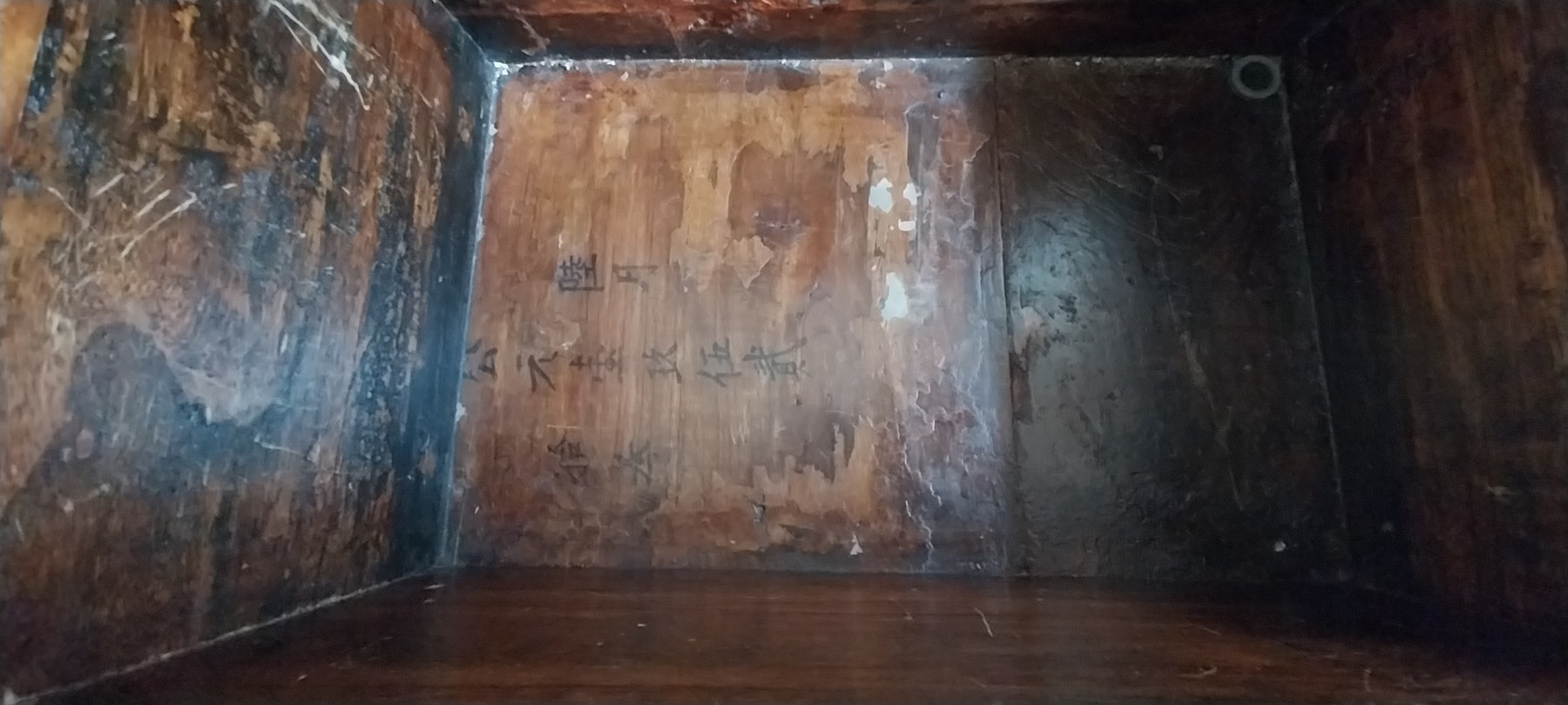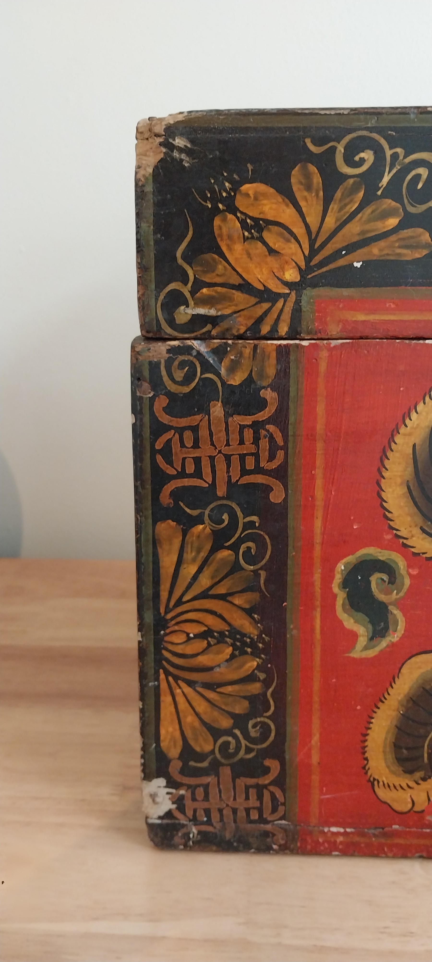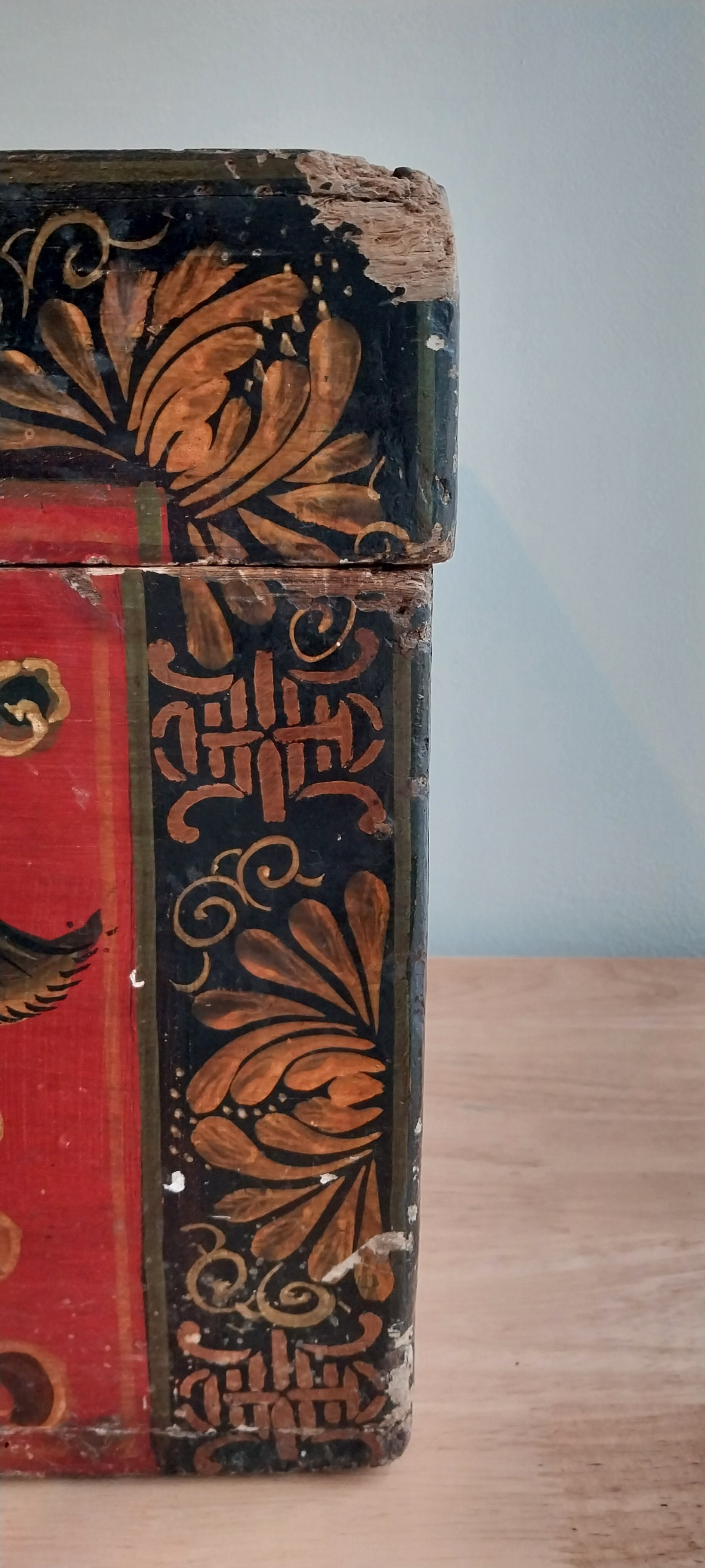 19th - 20th Century Tibetan Painted Trunk. Lacquer with foo dog desig.