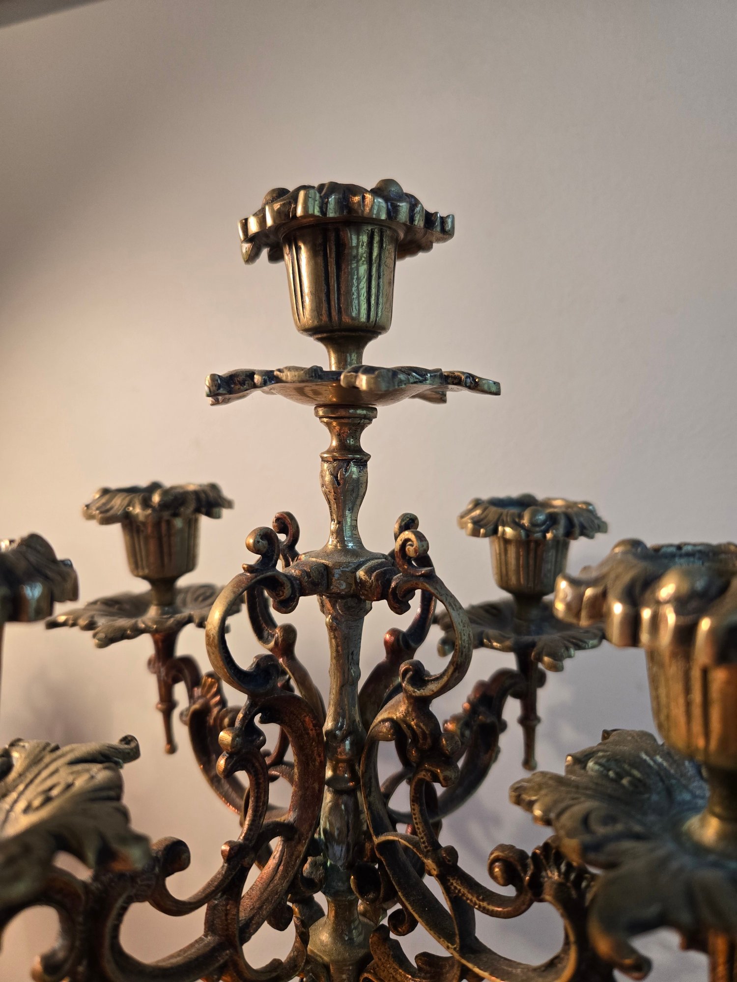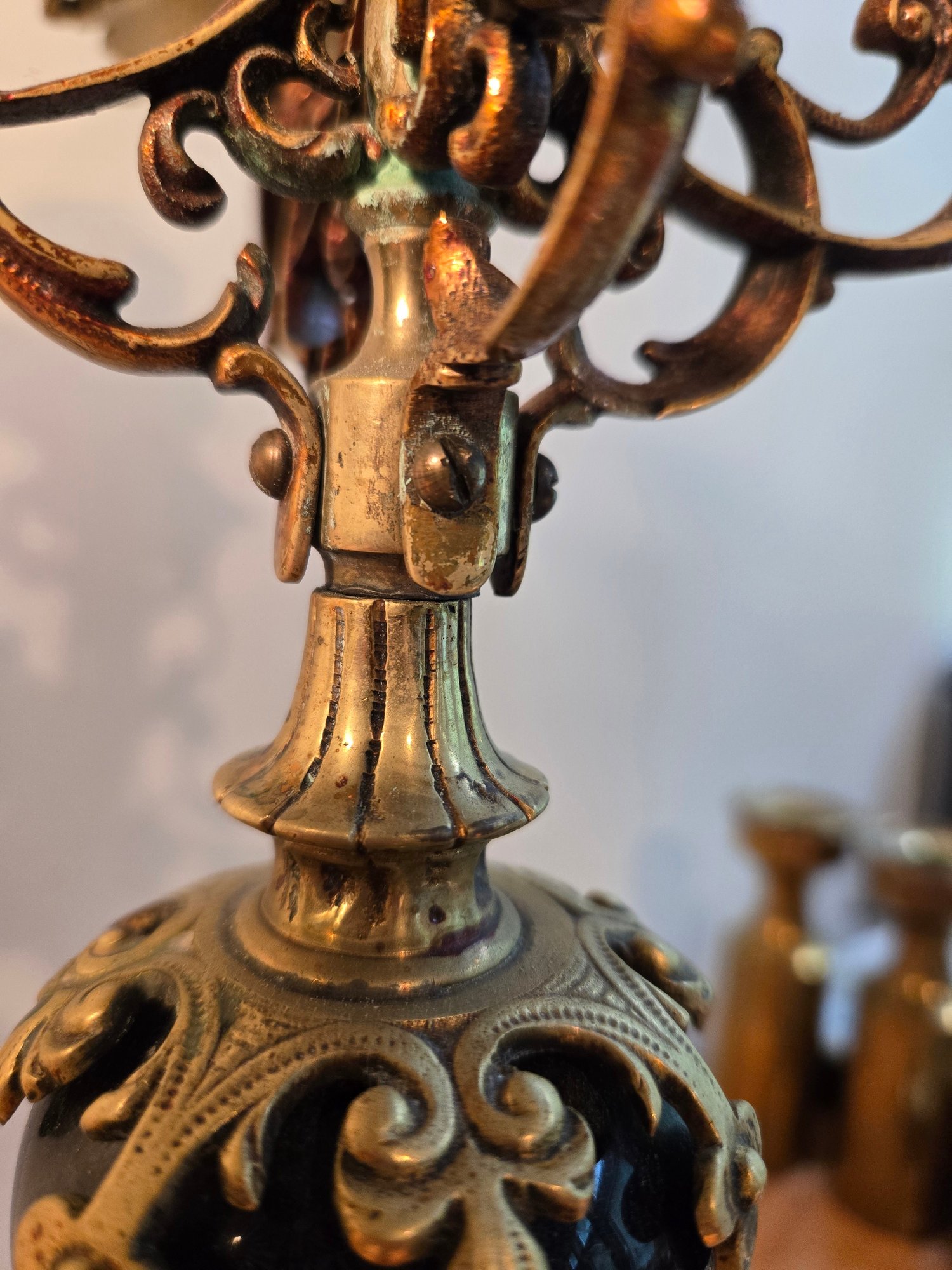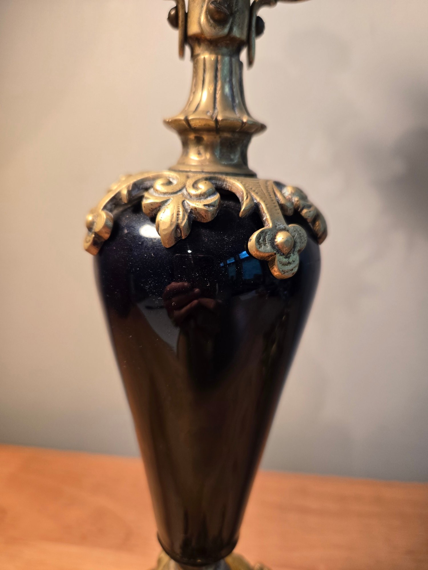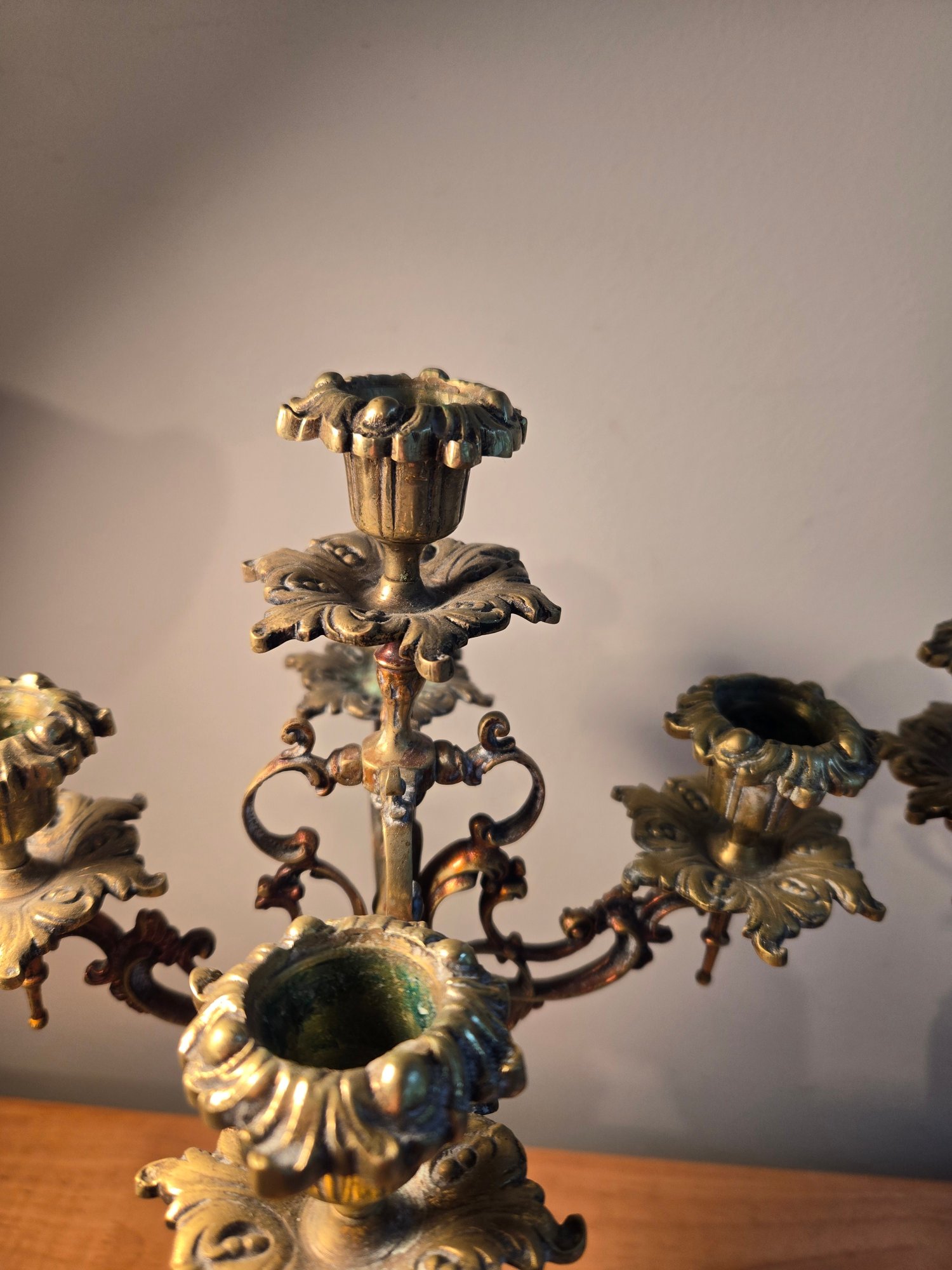 Antique Golden Brass And Black Rococo Decorative Candlesticks.
