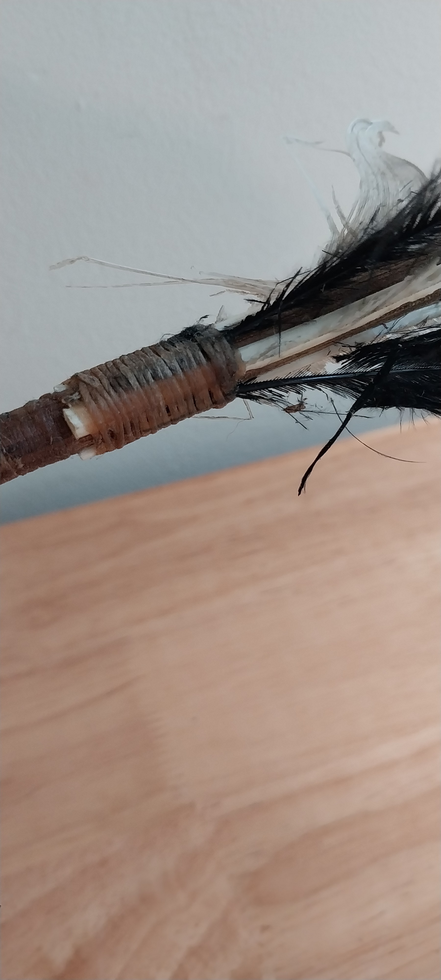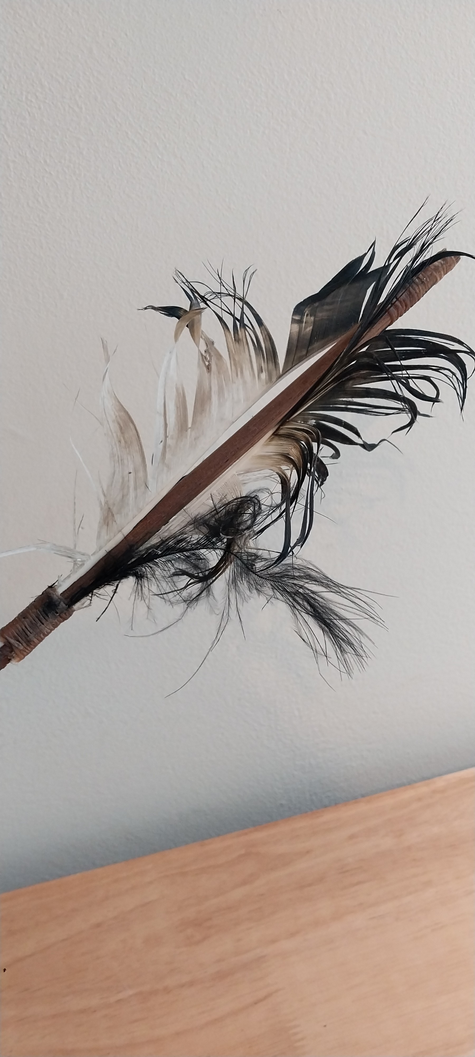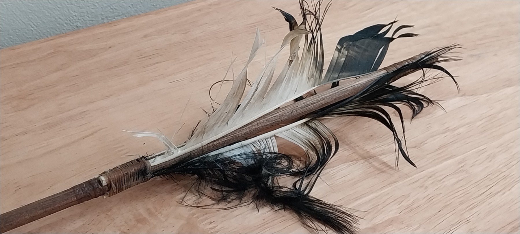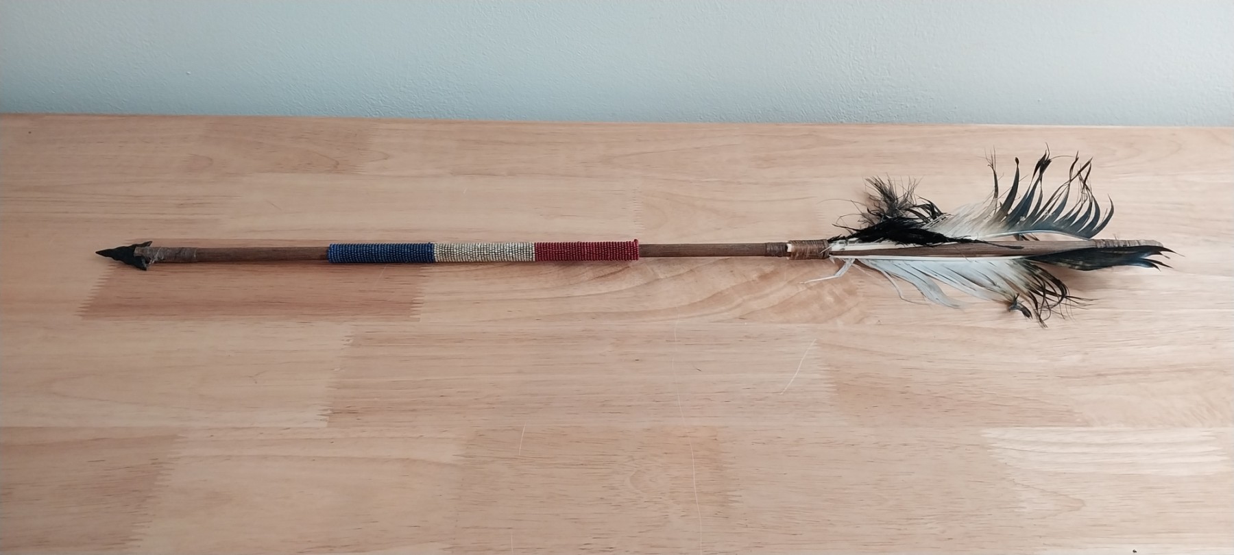 Native American Wooden Arrow with Feathers, Arrowhead and Beading
