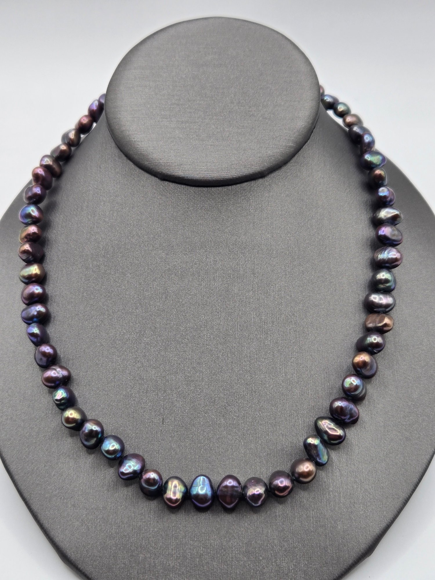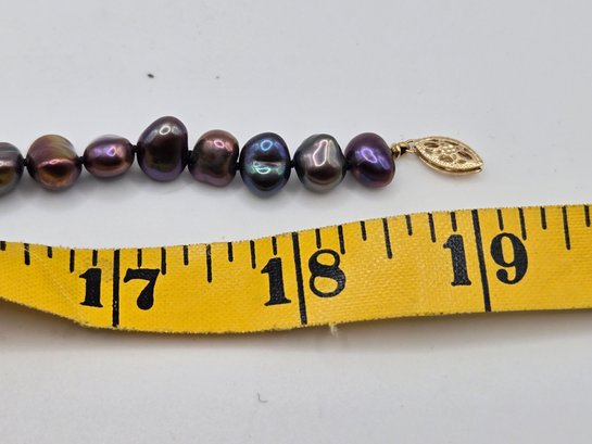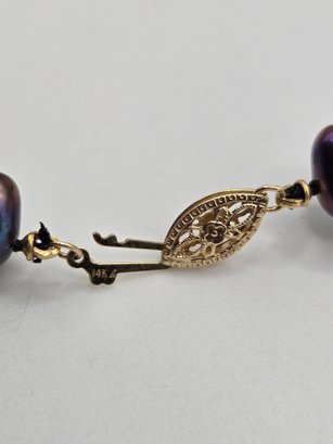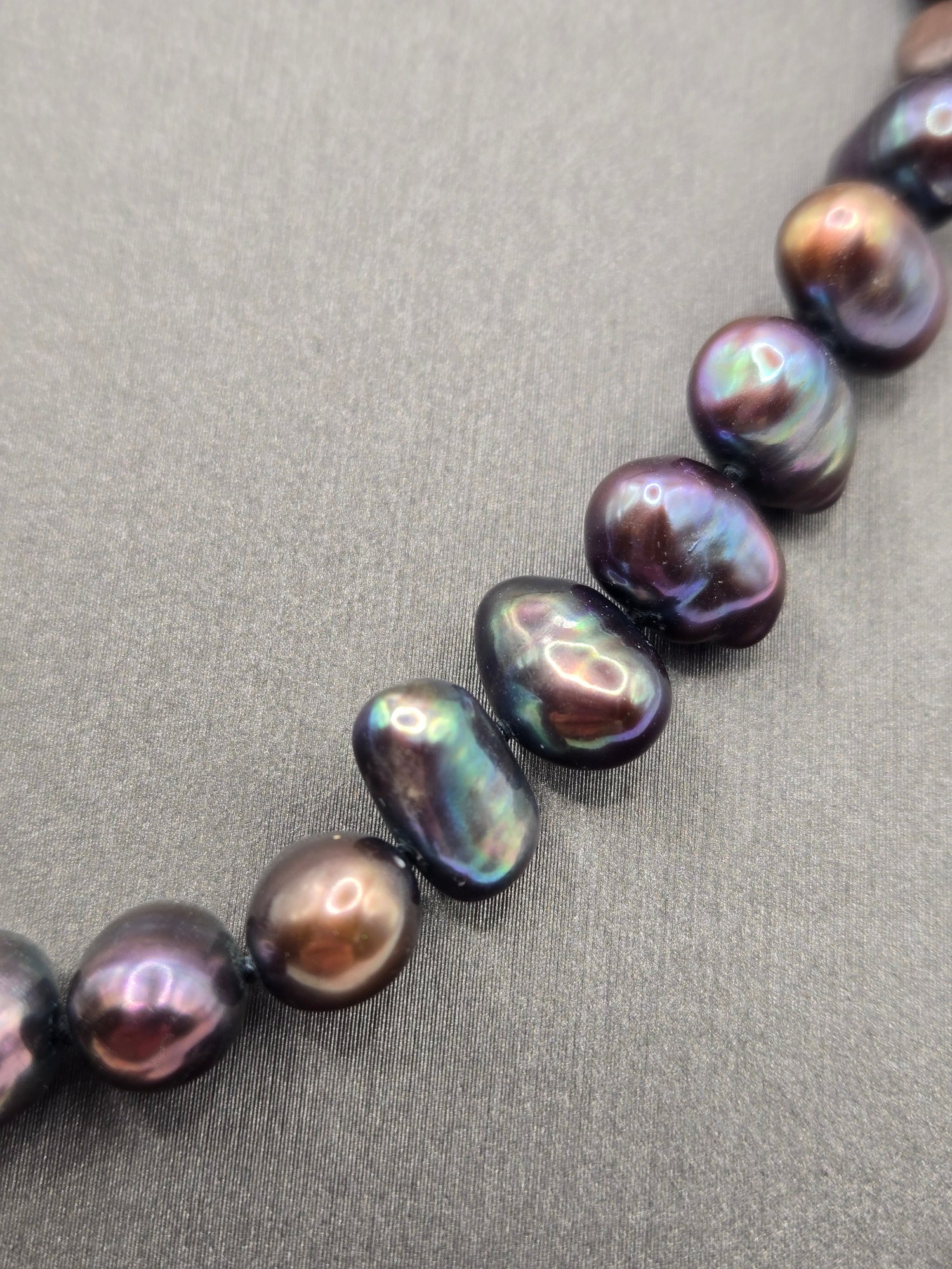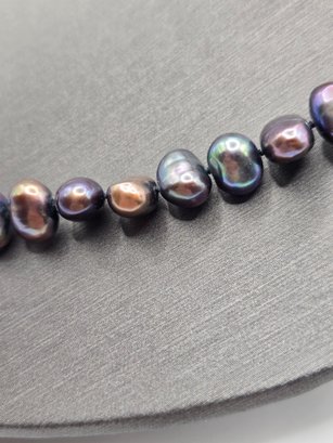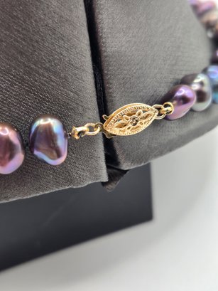 Natural peacock gray freshwater pearls with 14K gold clasp. Beautiful iridescent color