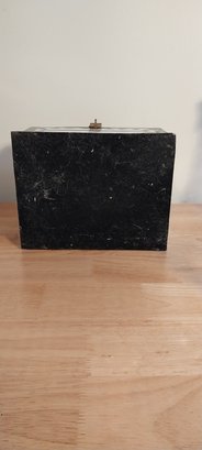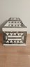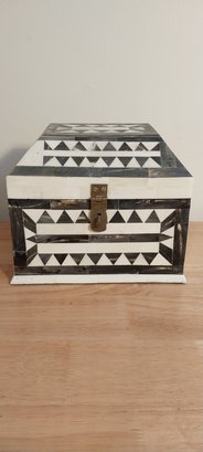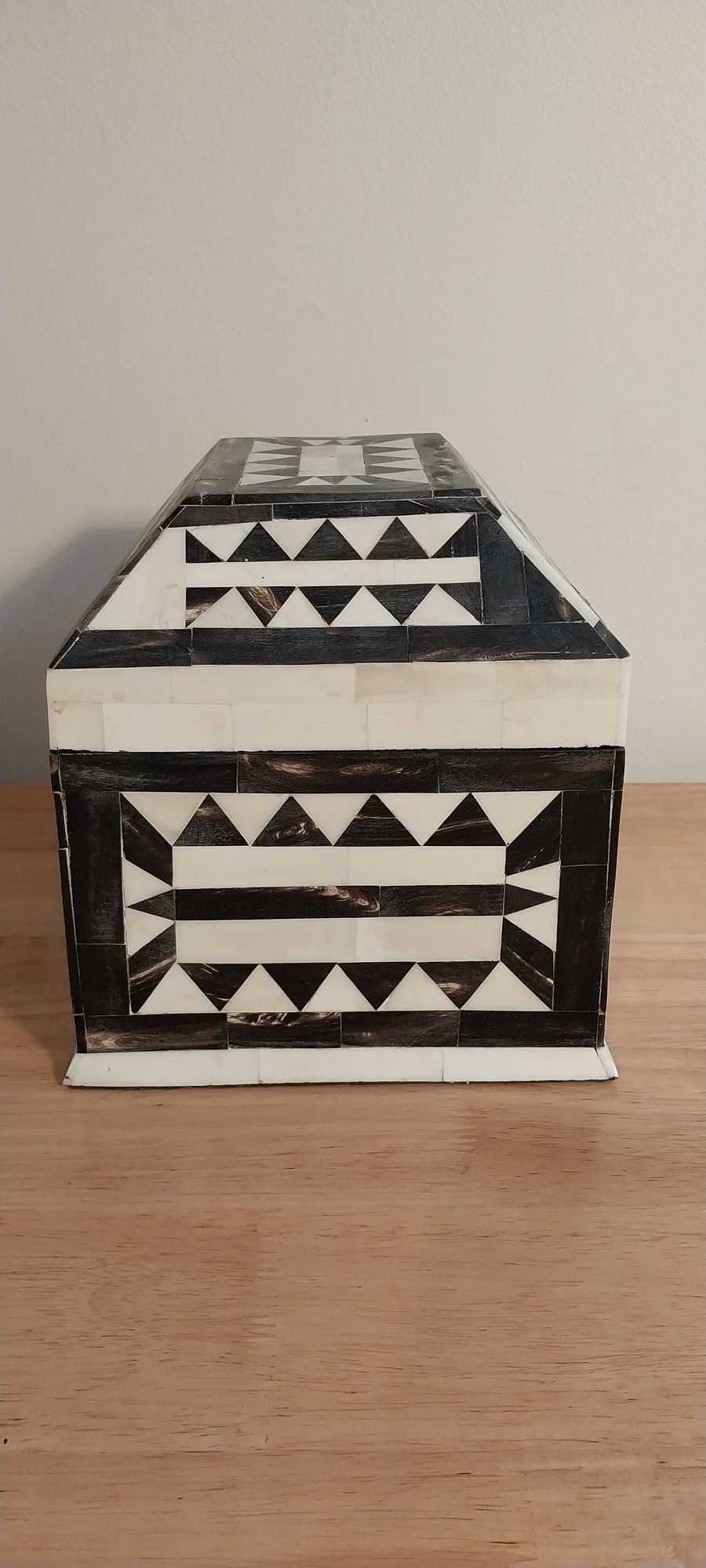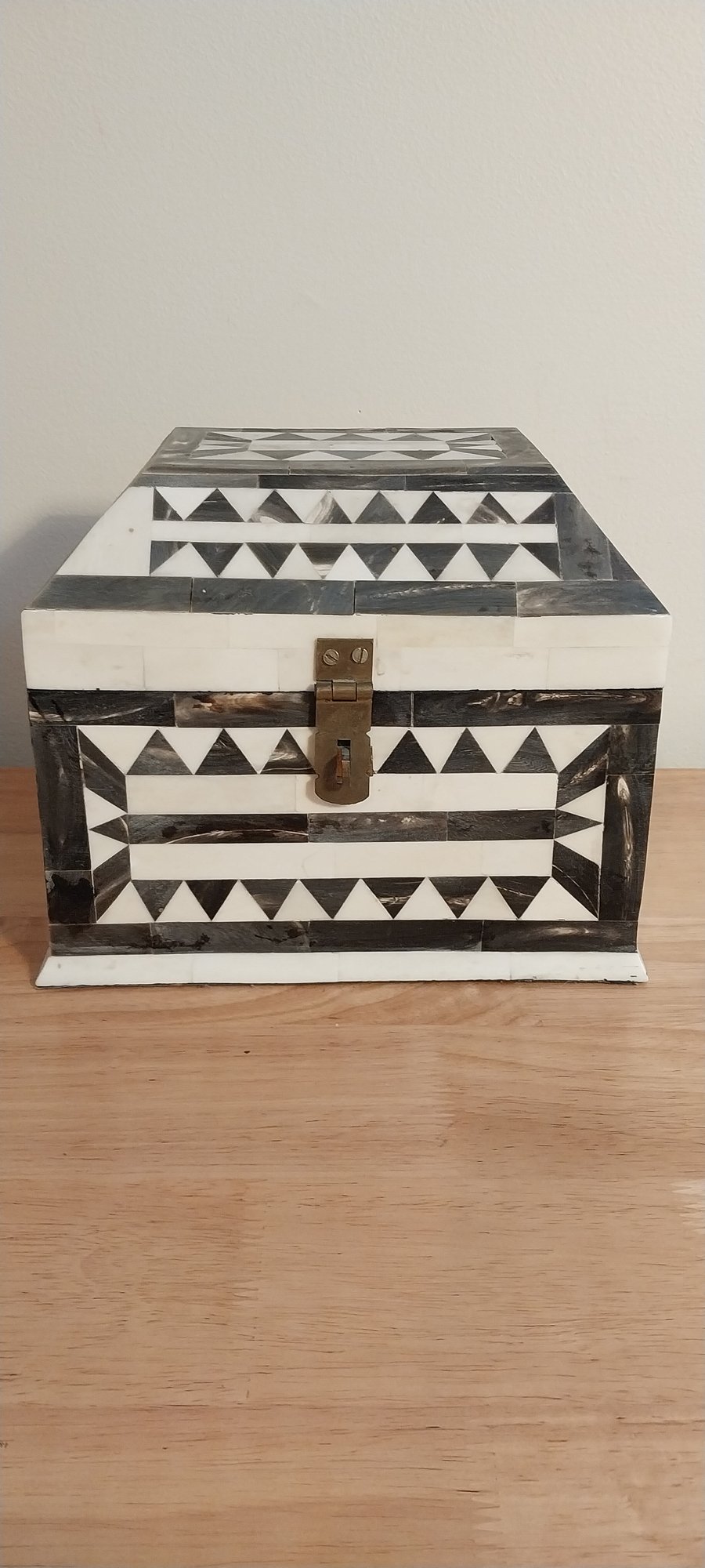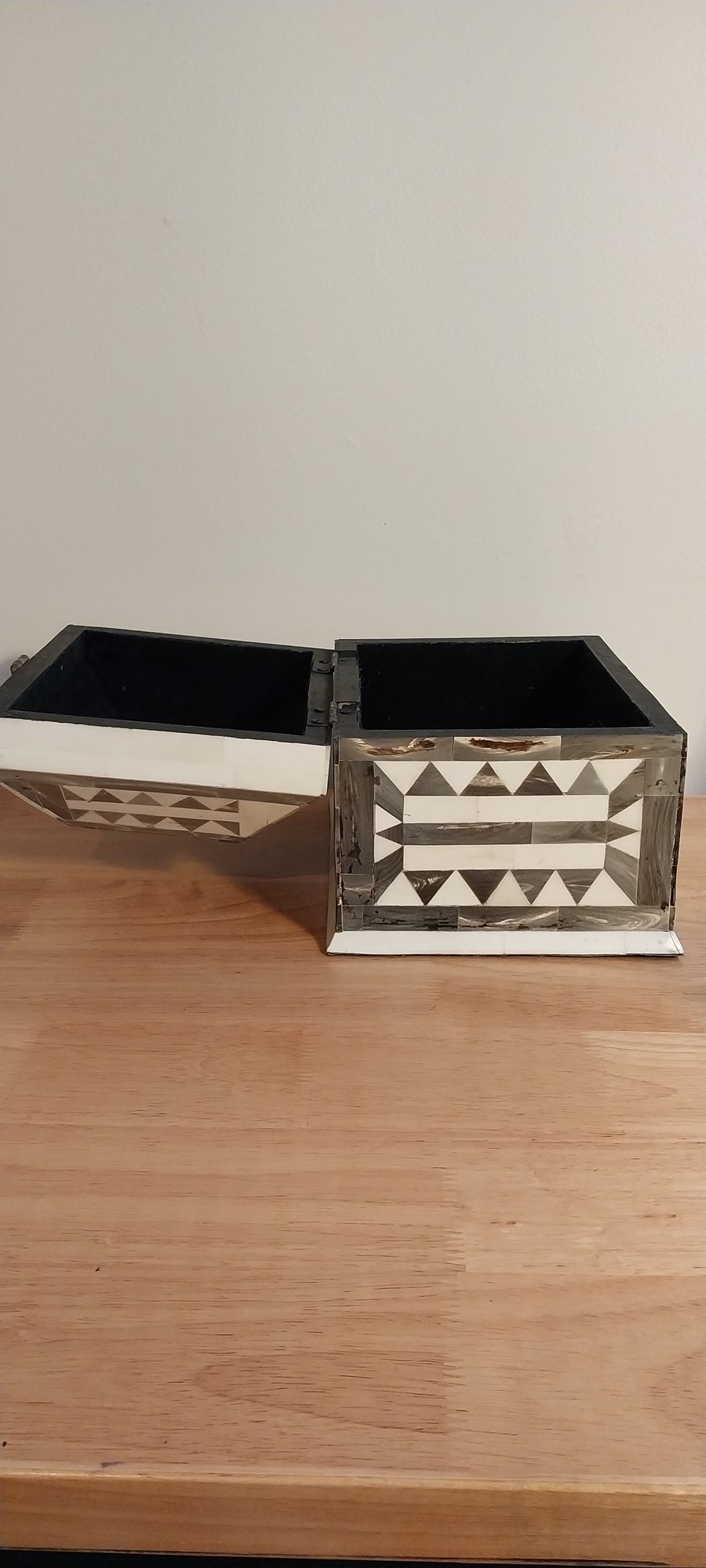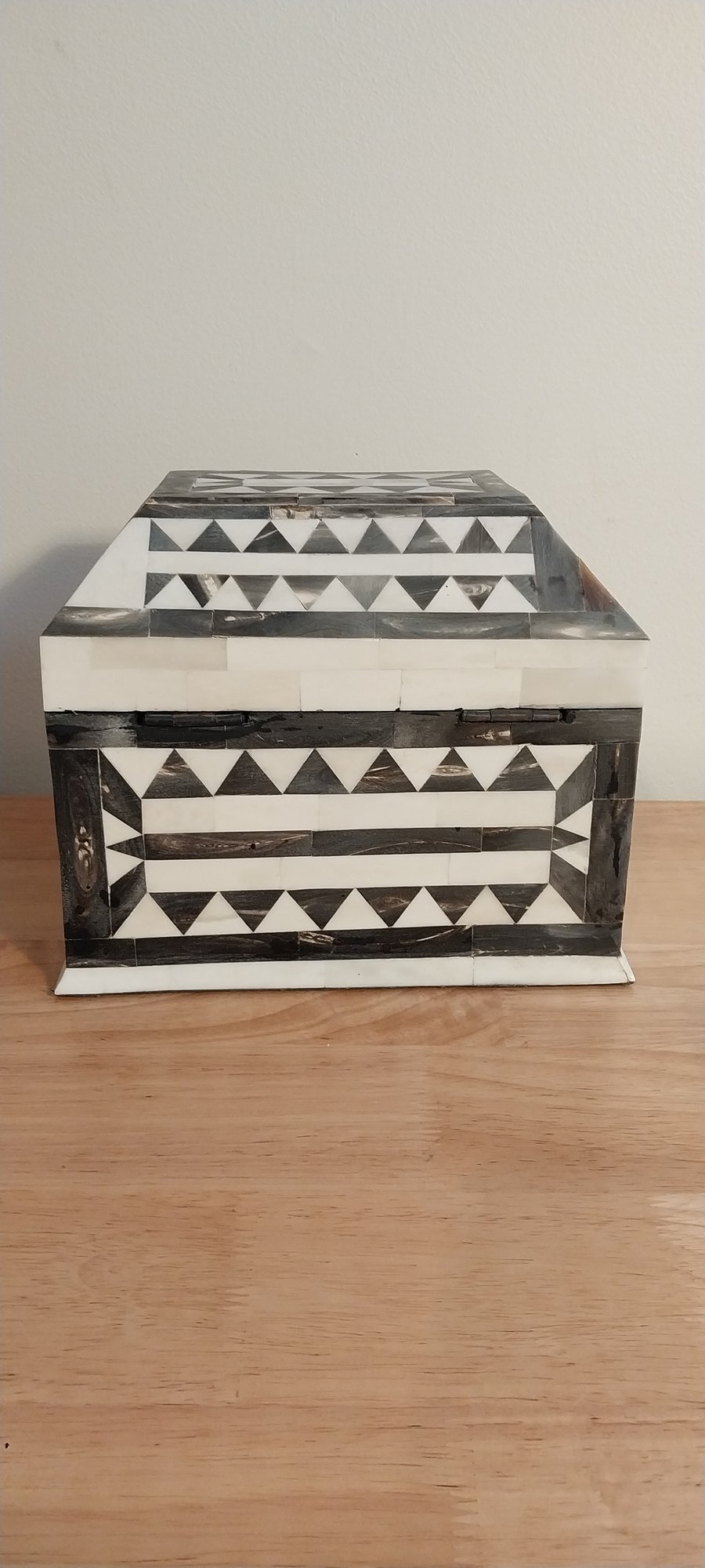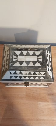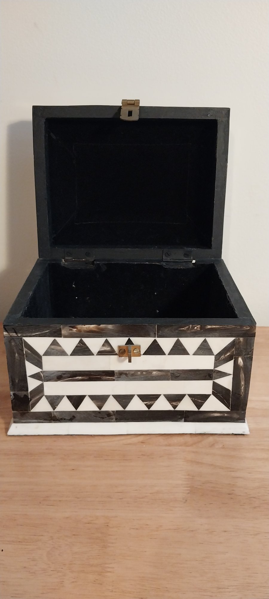 Bone/horn inlaid storage box. Felt lined with brass hinges.