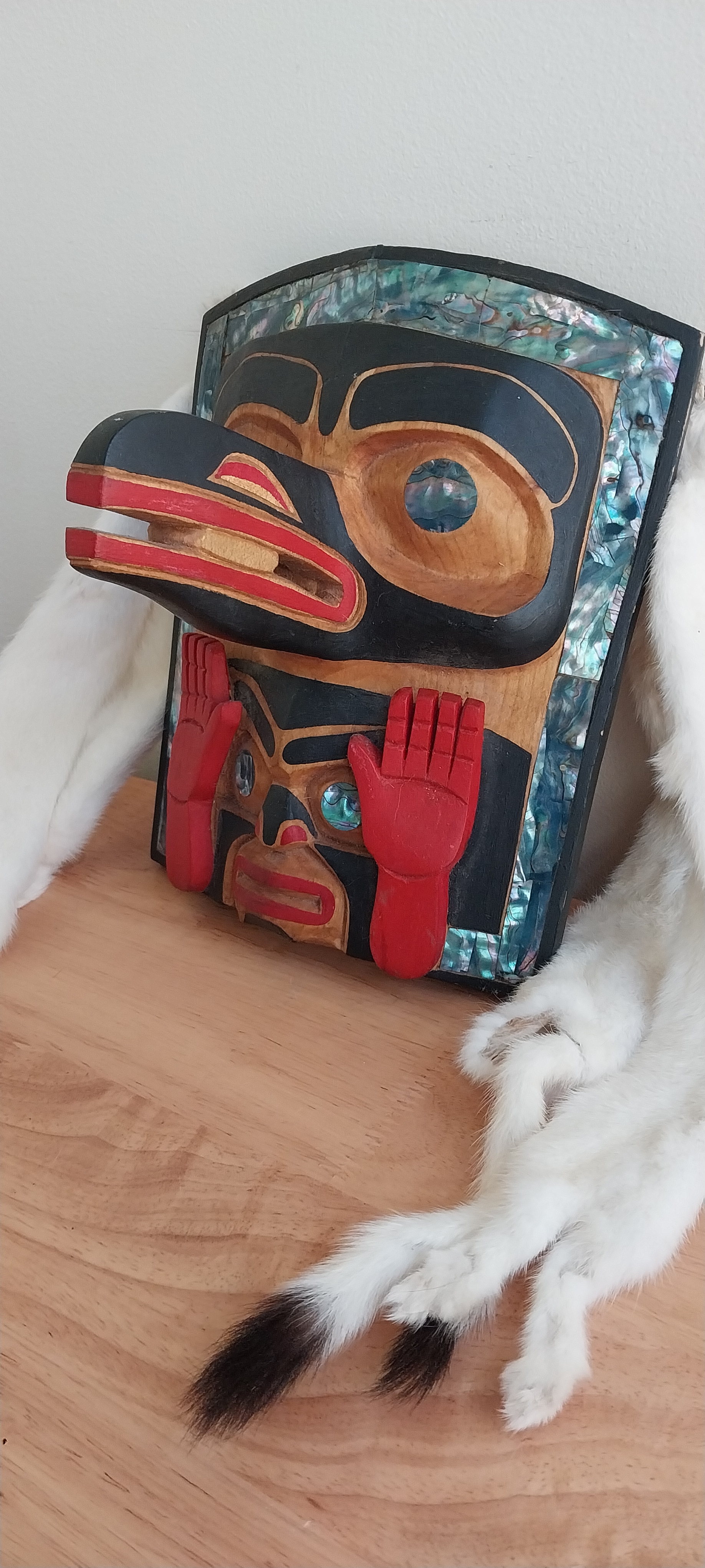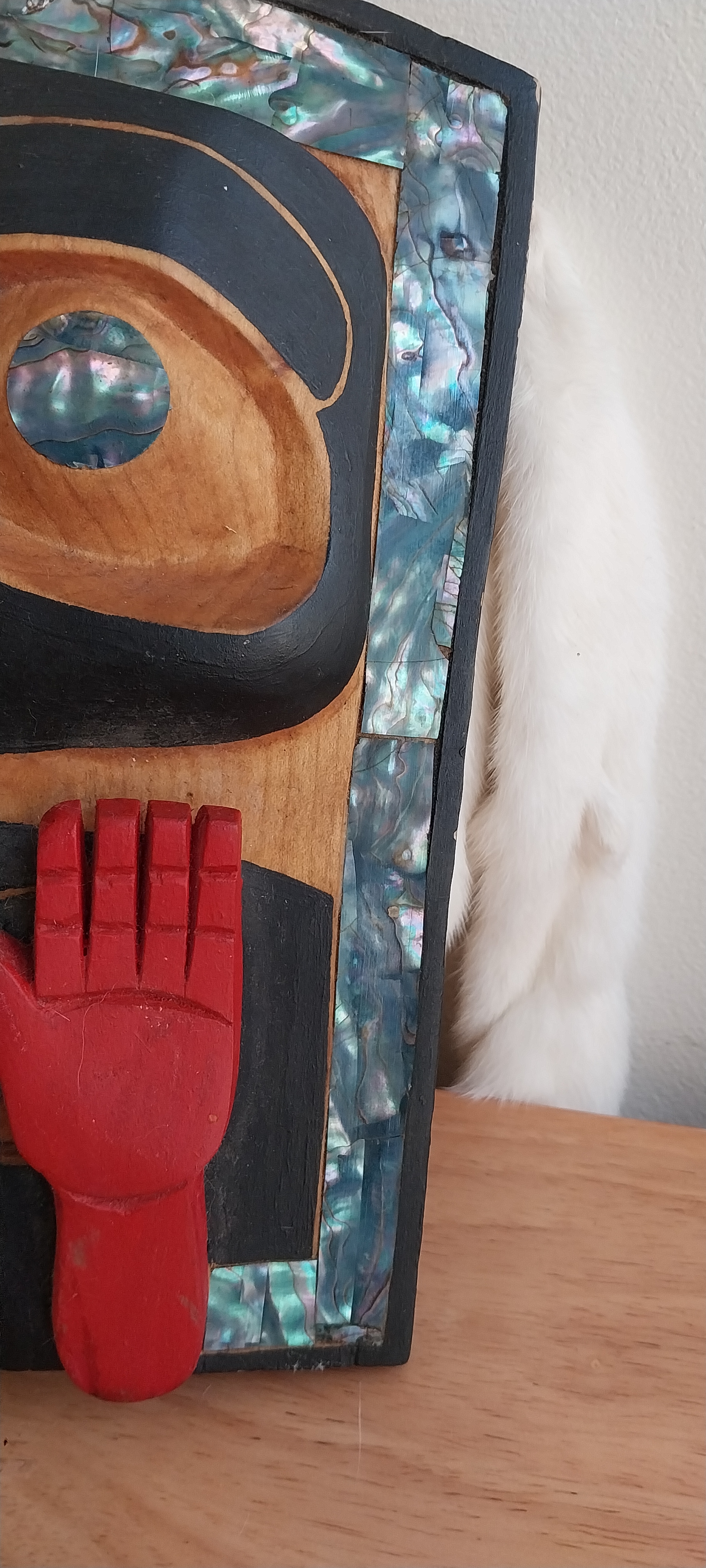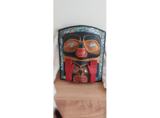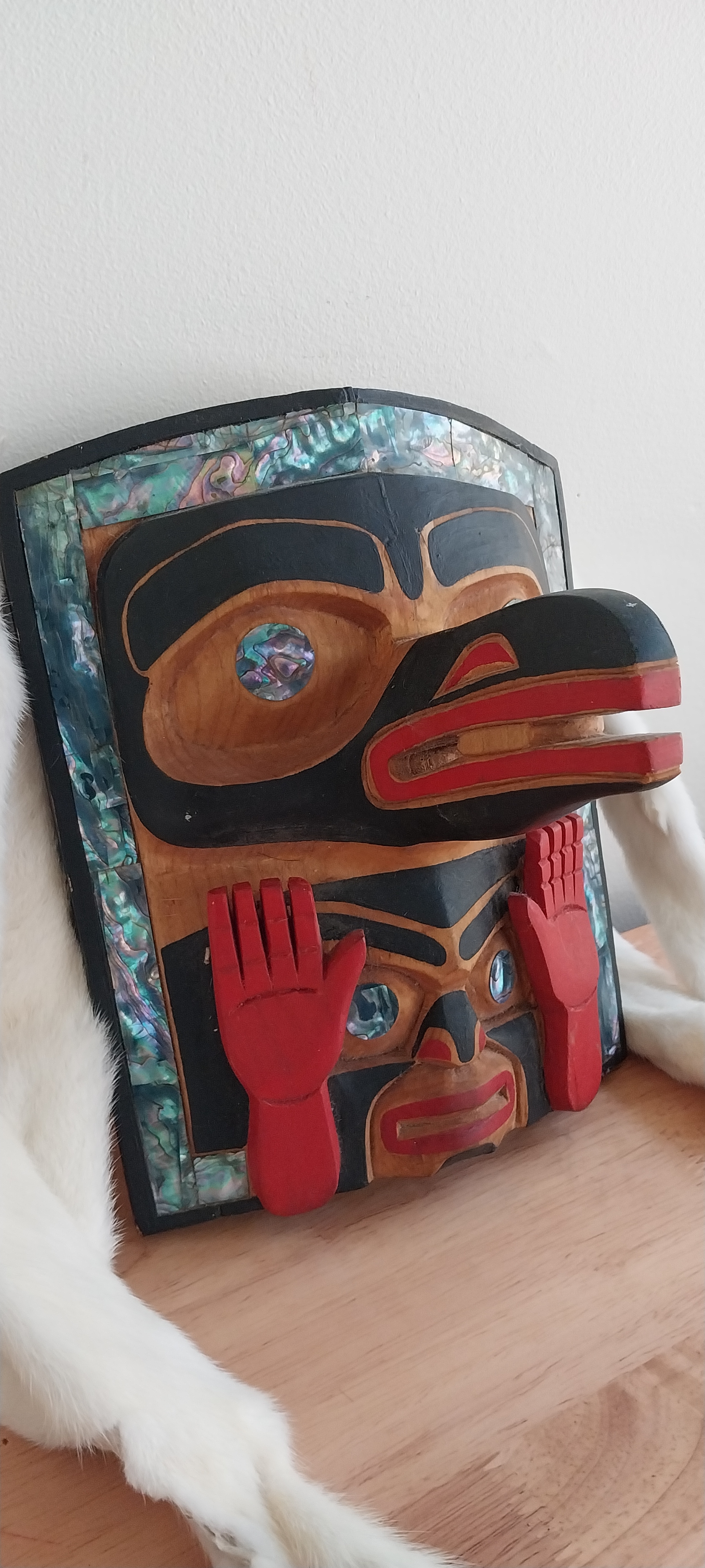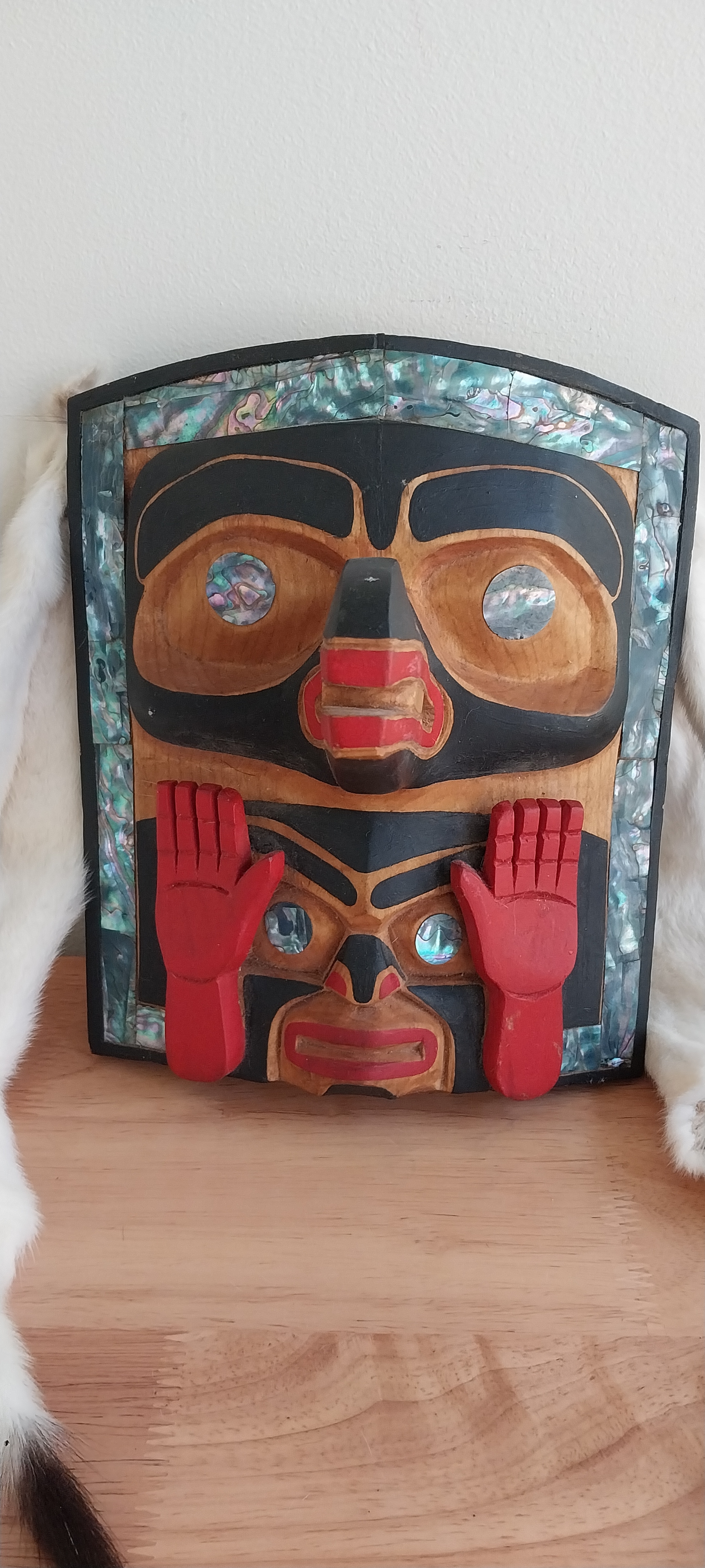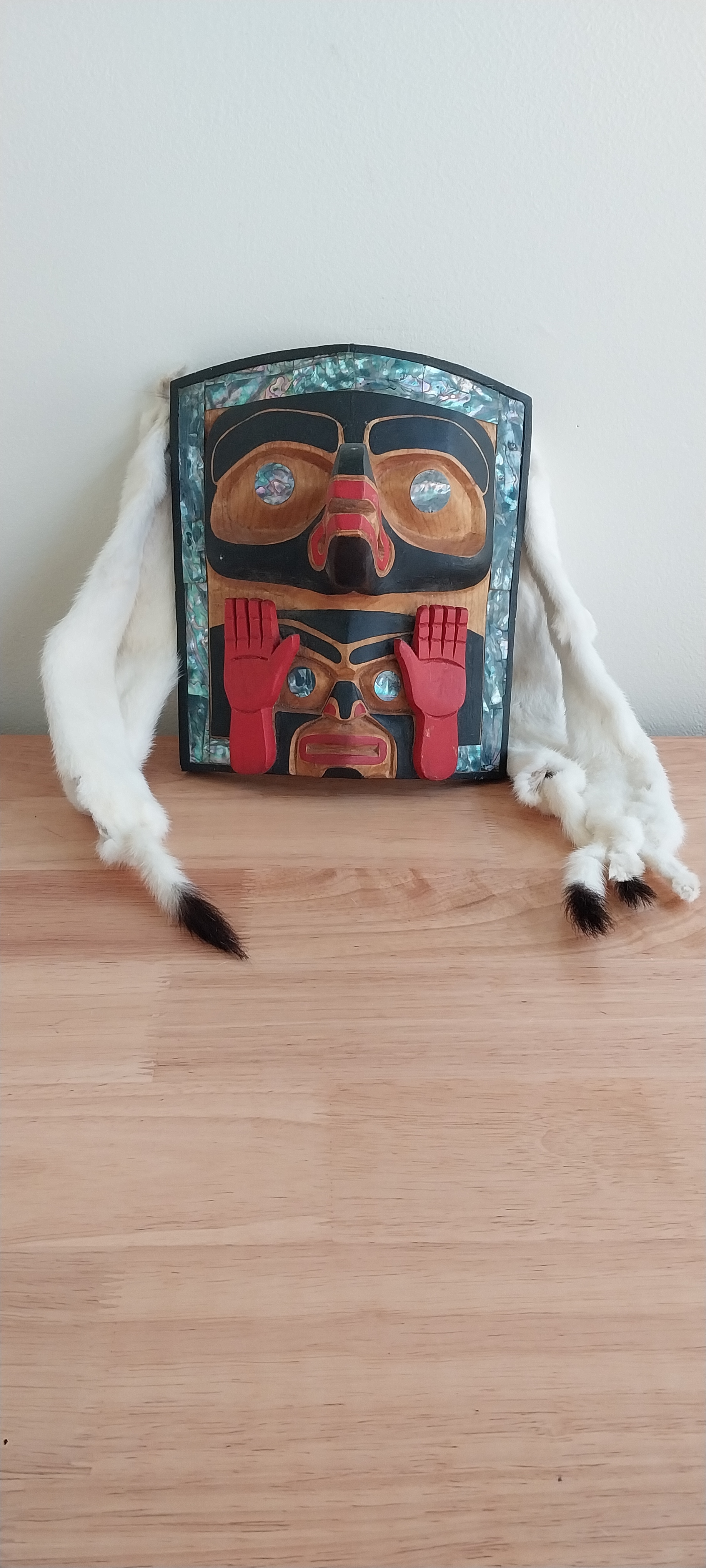 Carved wood with inlay of abalone. Fur pelts hang from both side of the face.