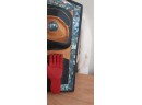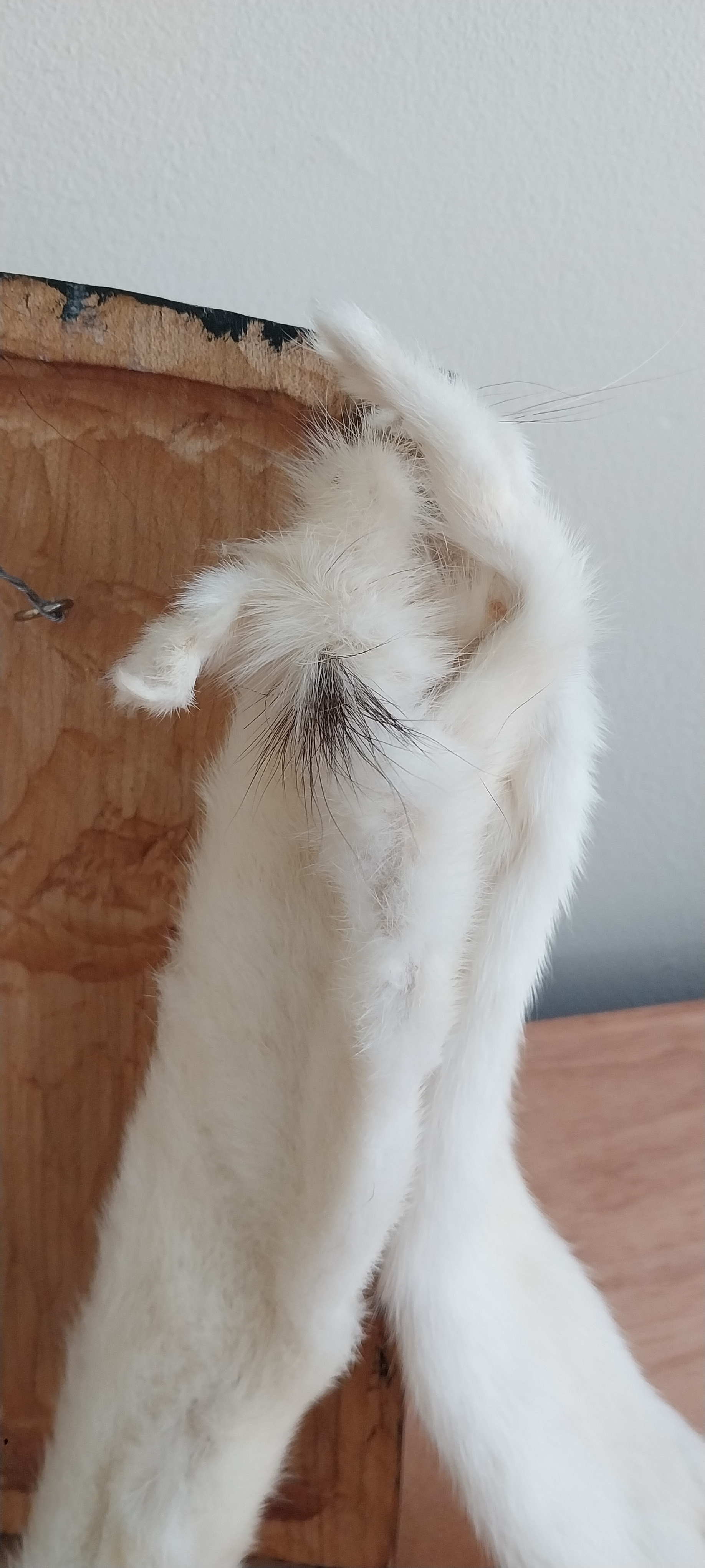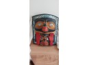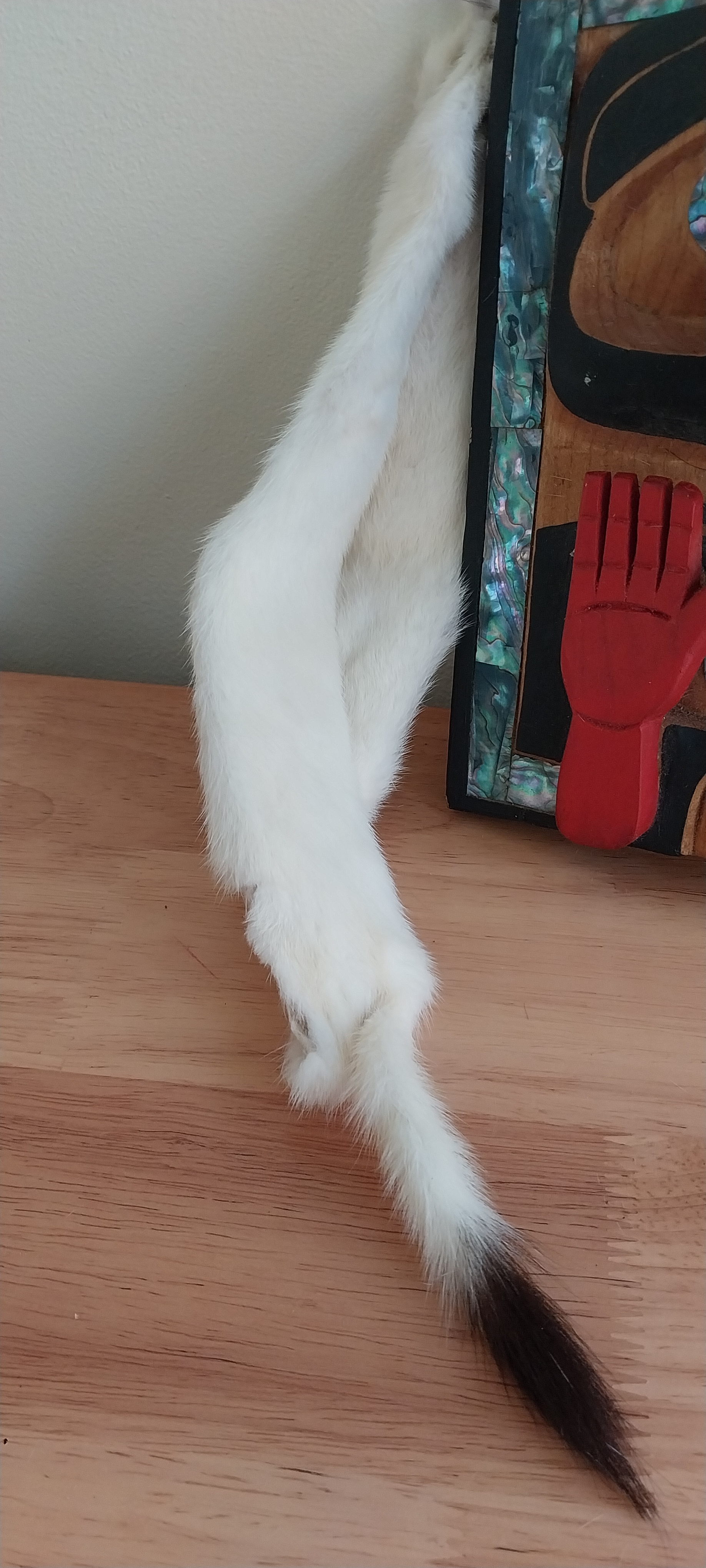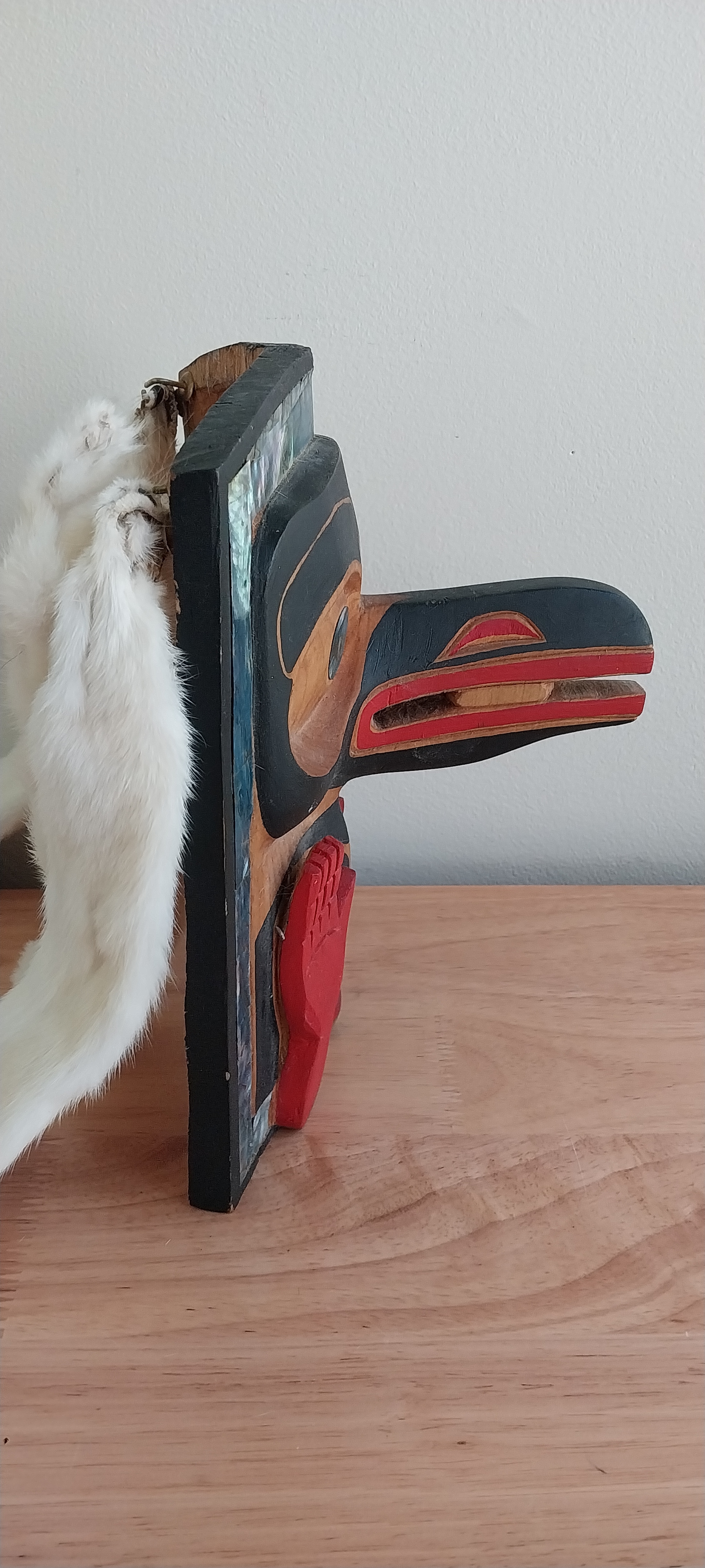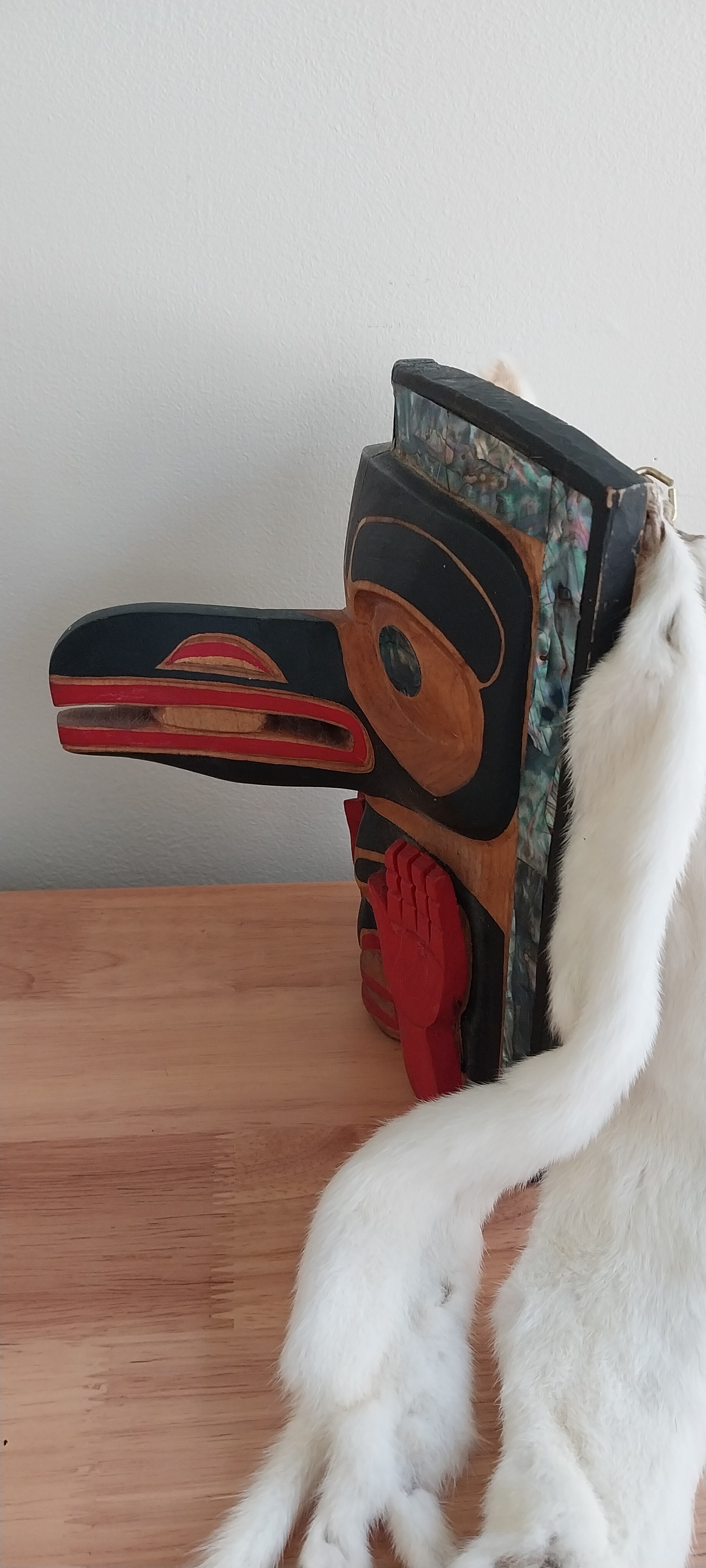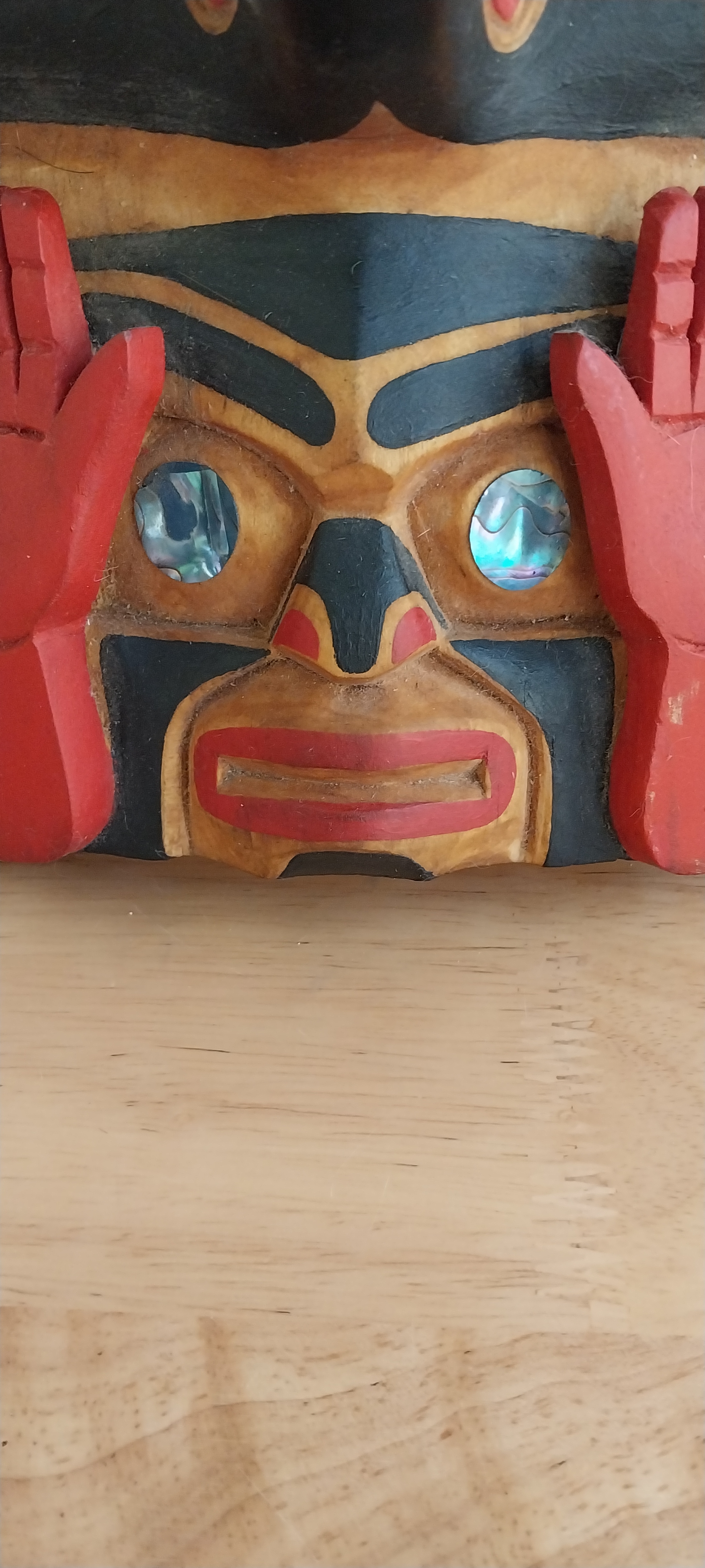 Carved wood with inlay of abalone. Fur pelts hang from both side of the face.
