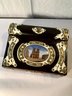 Wooden traveling desk set. Double inkwells, felt lining and hidden storage cabinet. 12" x 9". Brass overlay with a few missing pieces. Inset is of a European square with people.