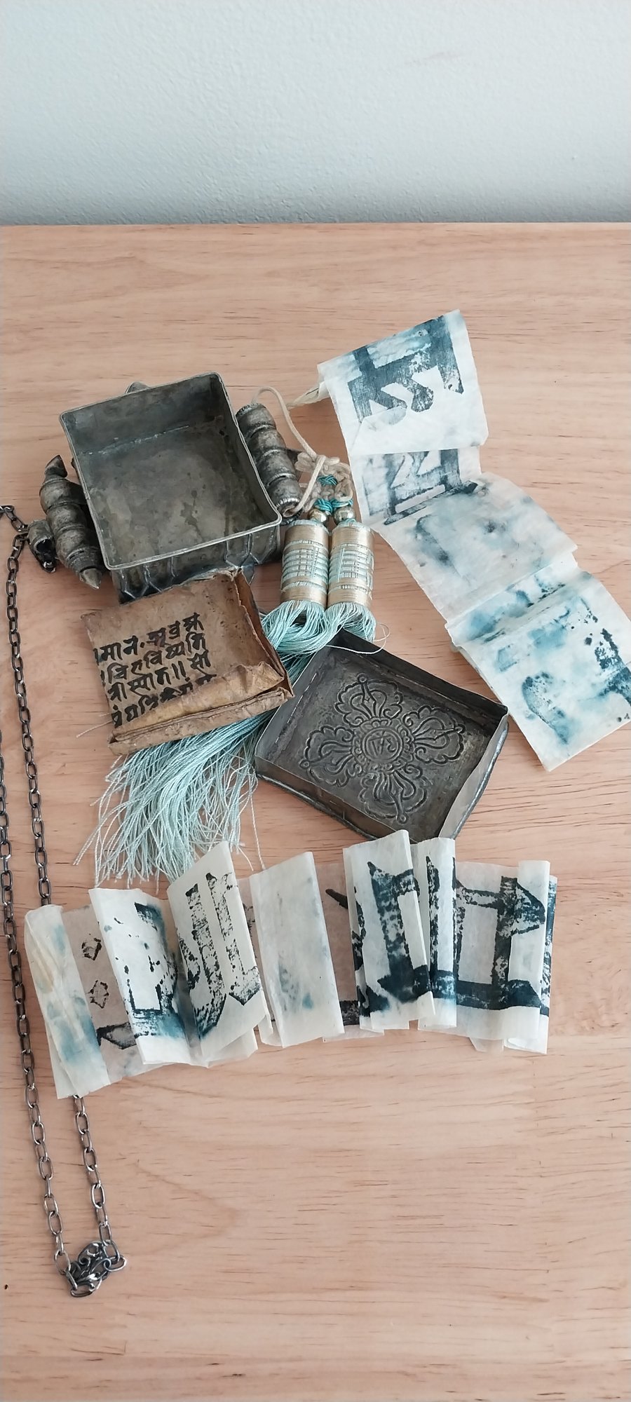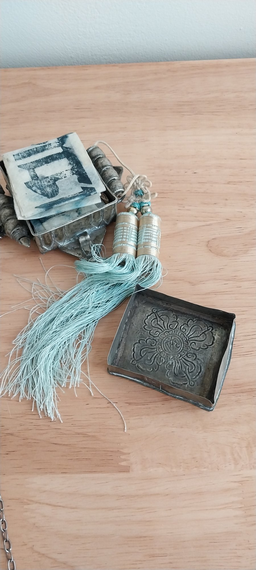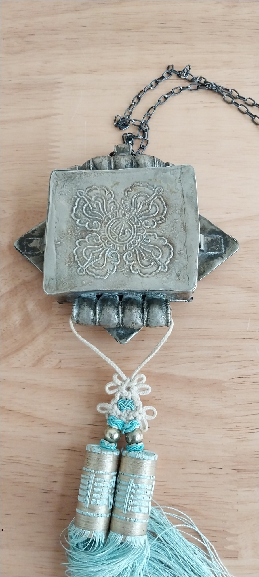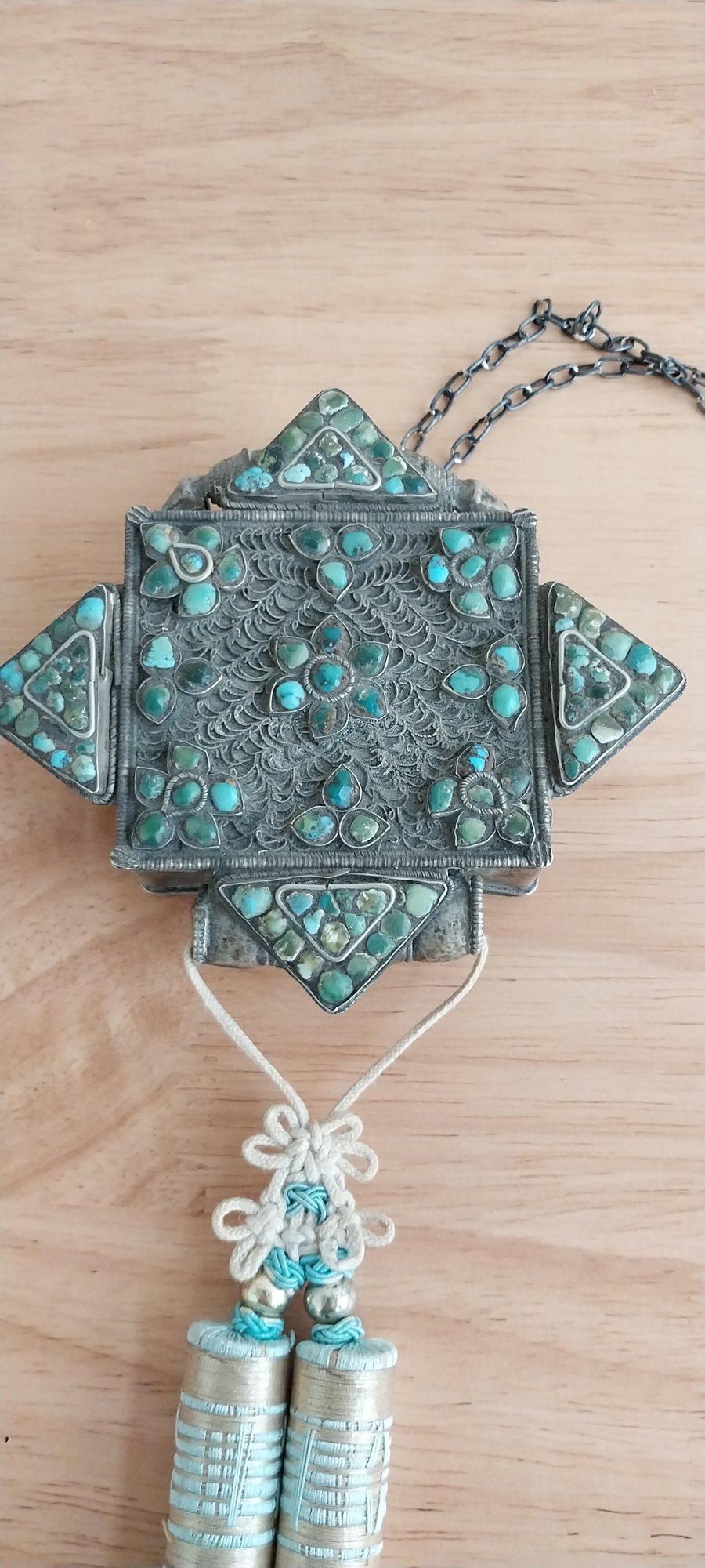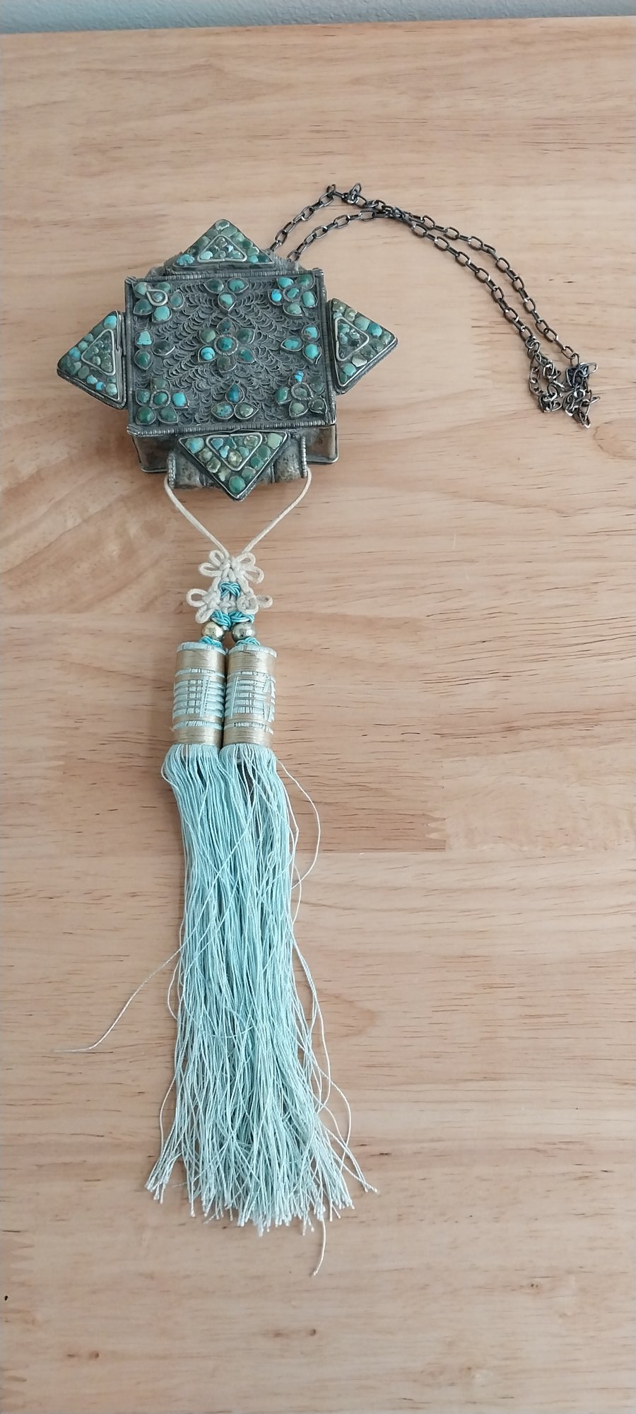 Filagree Tibetan Gua Charmbox with silver detailing and turquoise tassels.