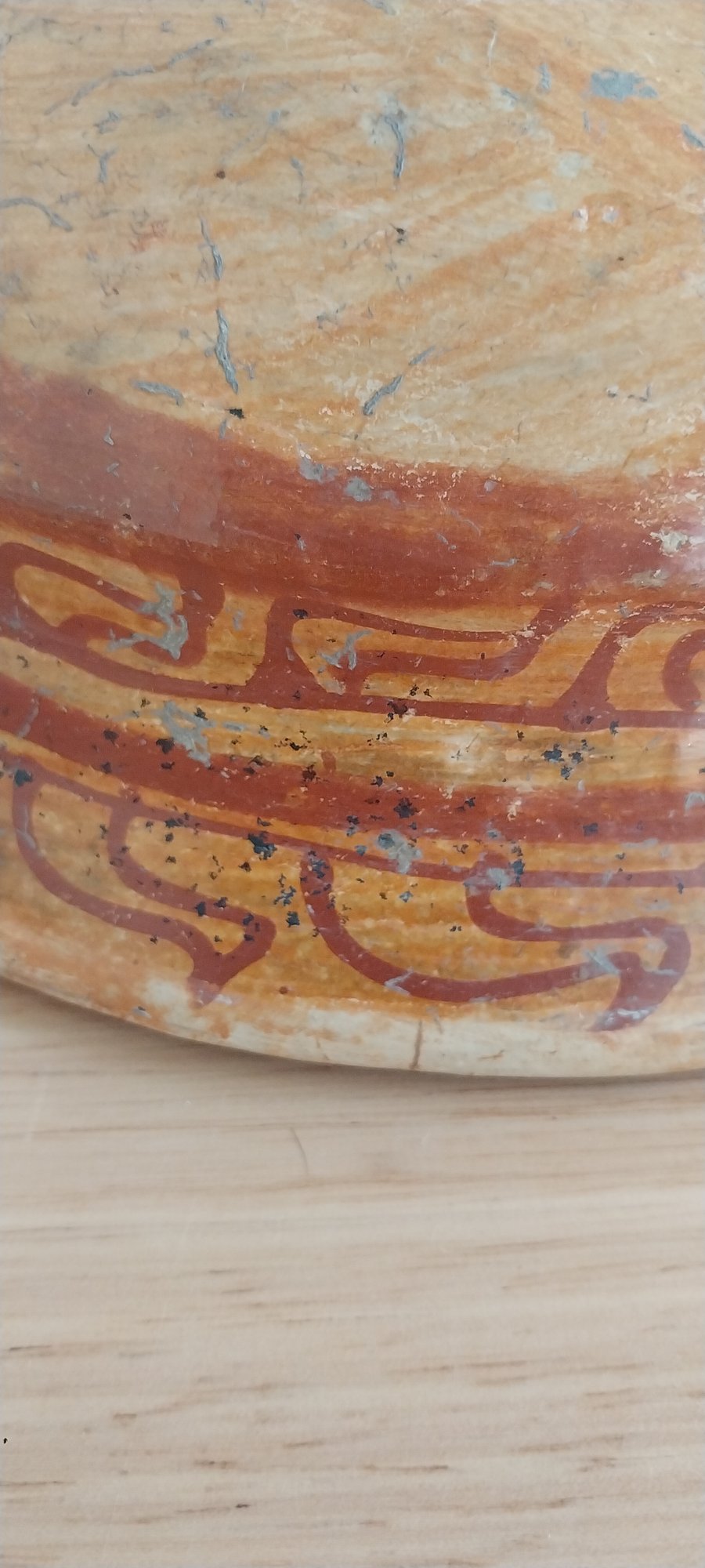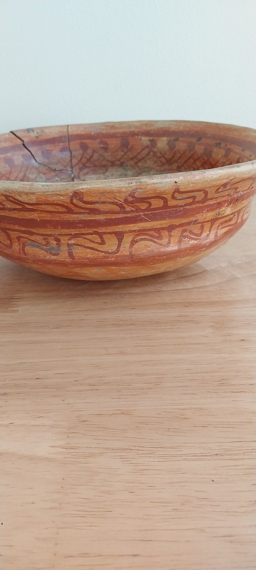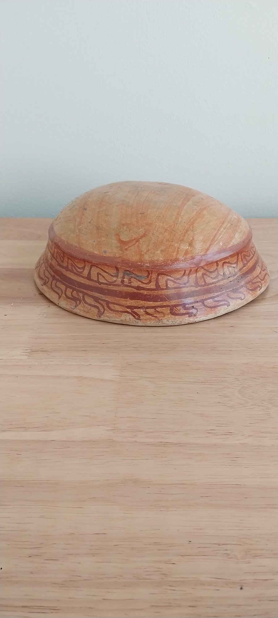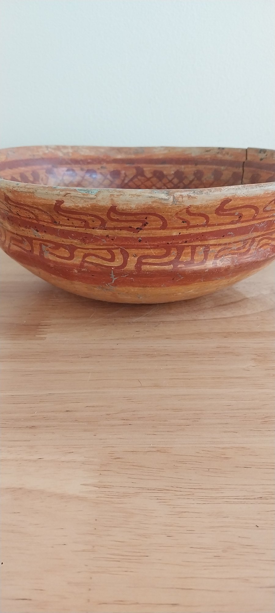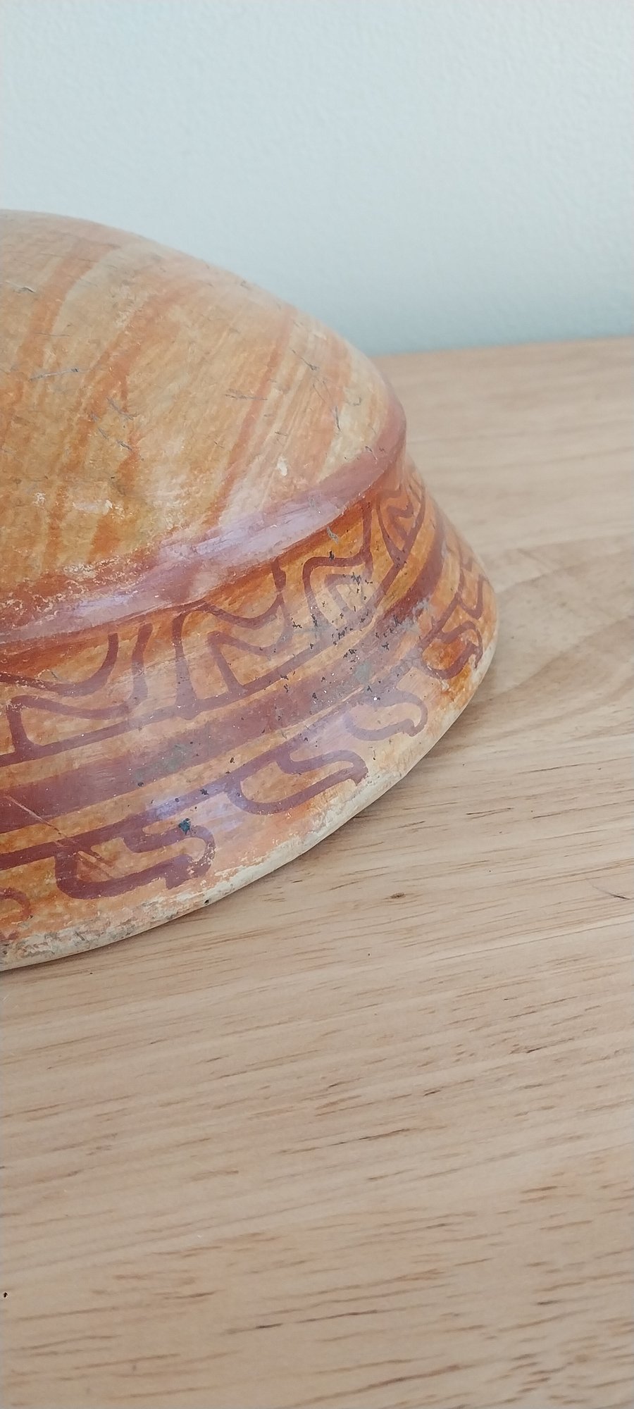 Mayan Copador bowl with abstract design. Ploychrome pigment, rounded bottom and beveled edge.