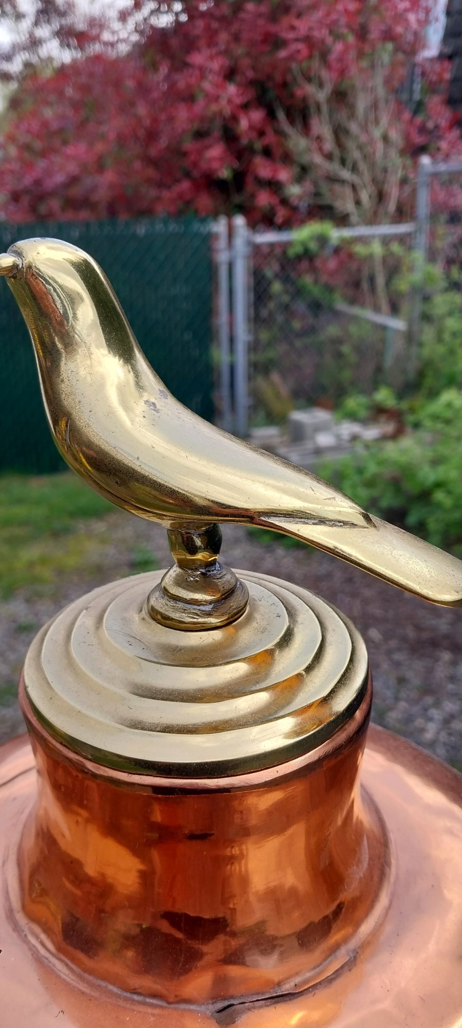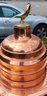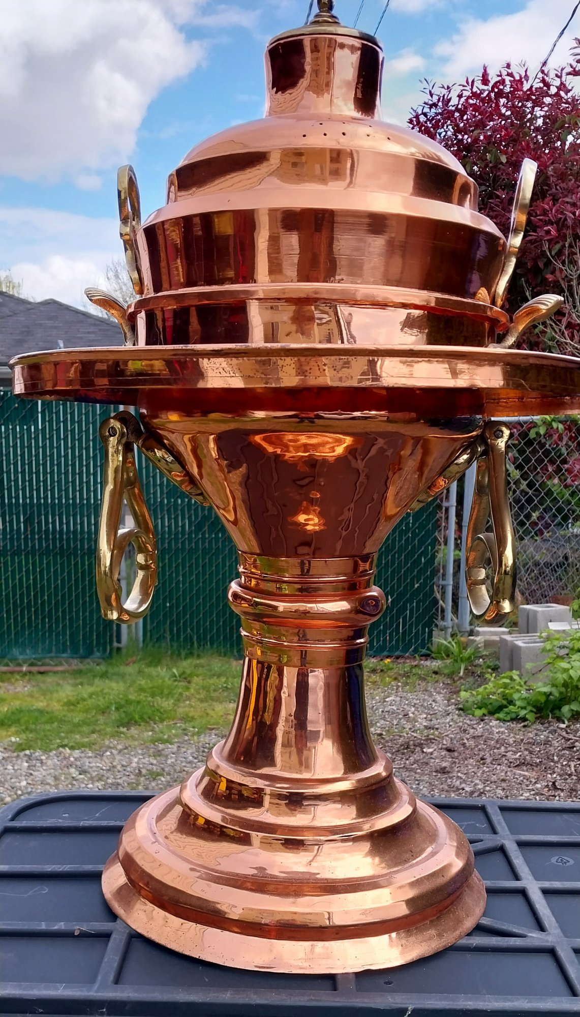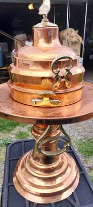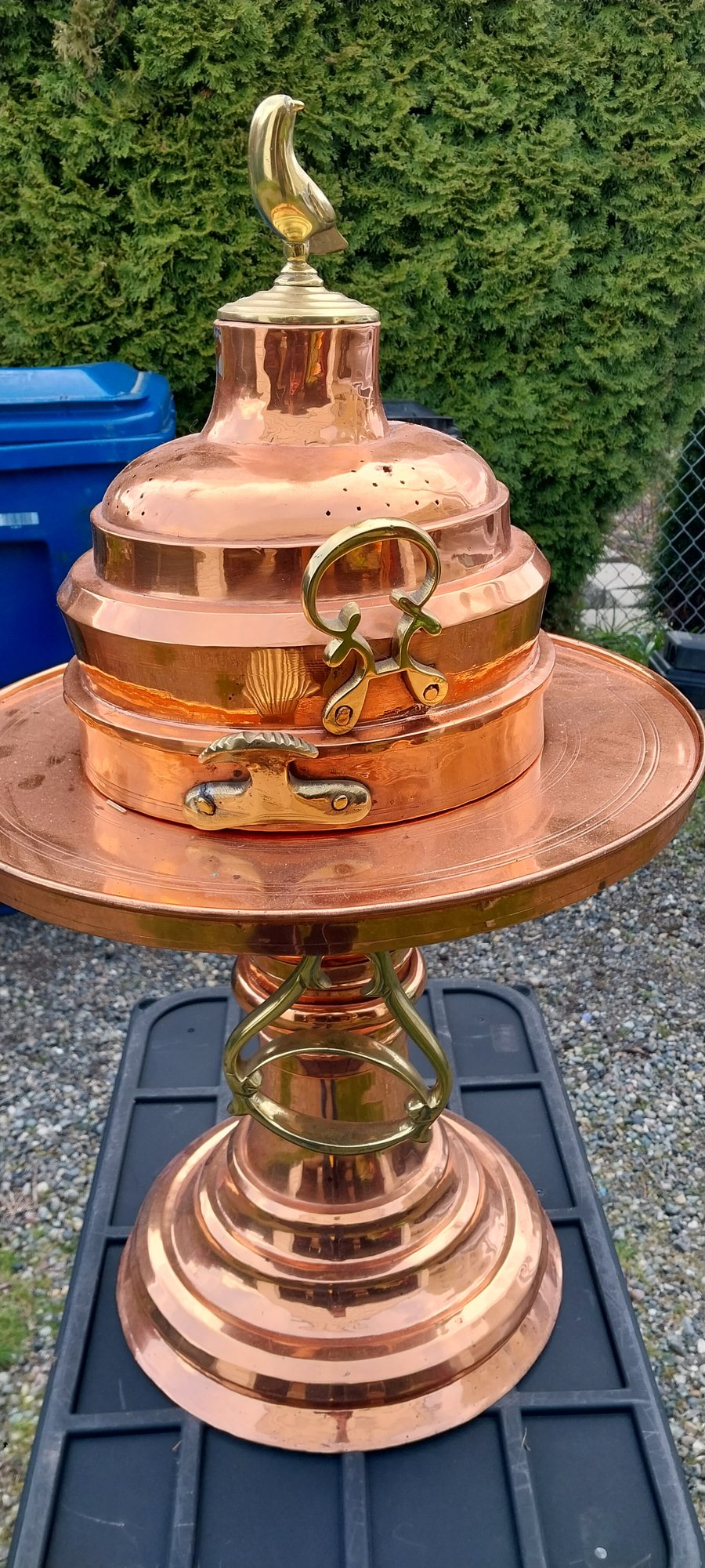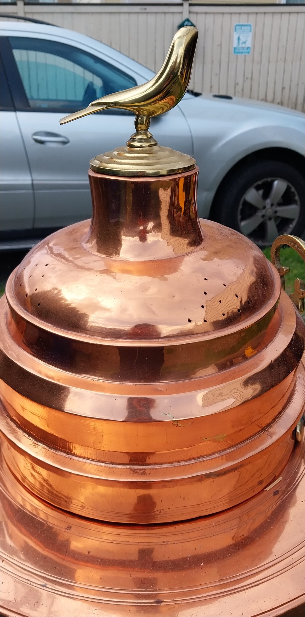 Middle eastern vintage brazier/fire pit. Made of polished brass and copper. Fine example of Turkish (Ottoman) craftsmanship. Brass bird finial, middle piece with shell form handles and lower stand with hanging handles.