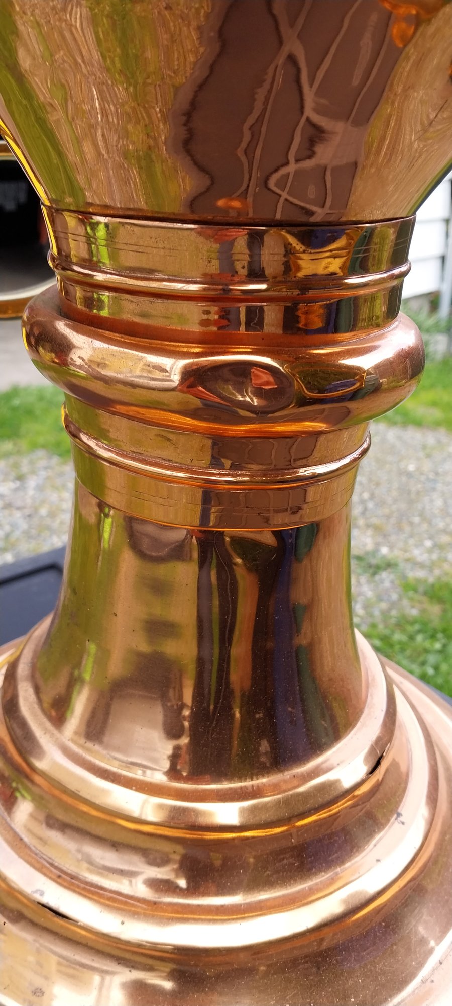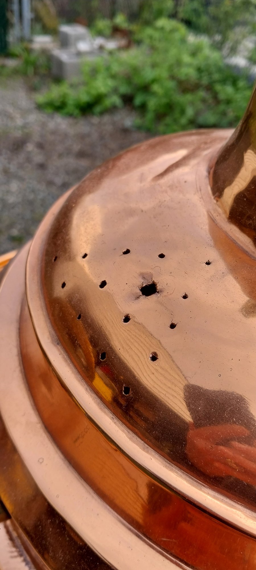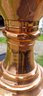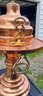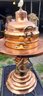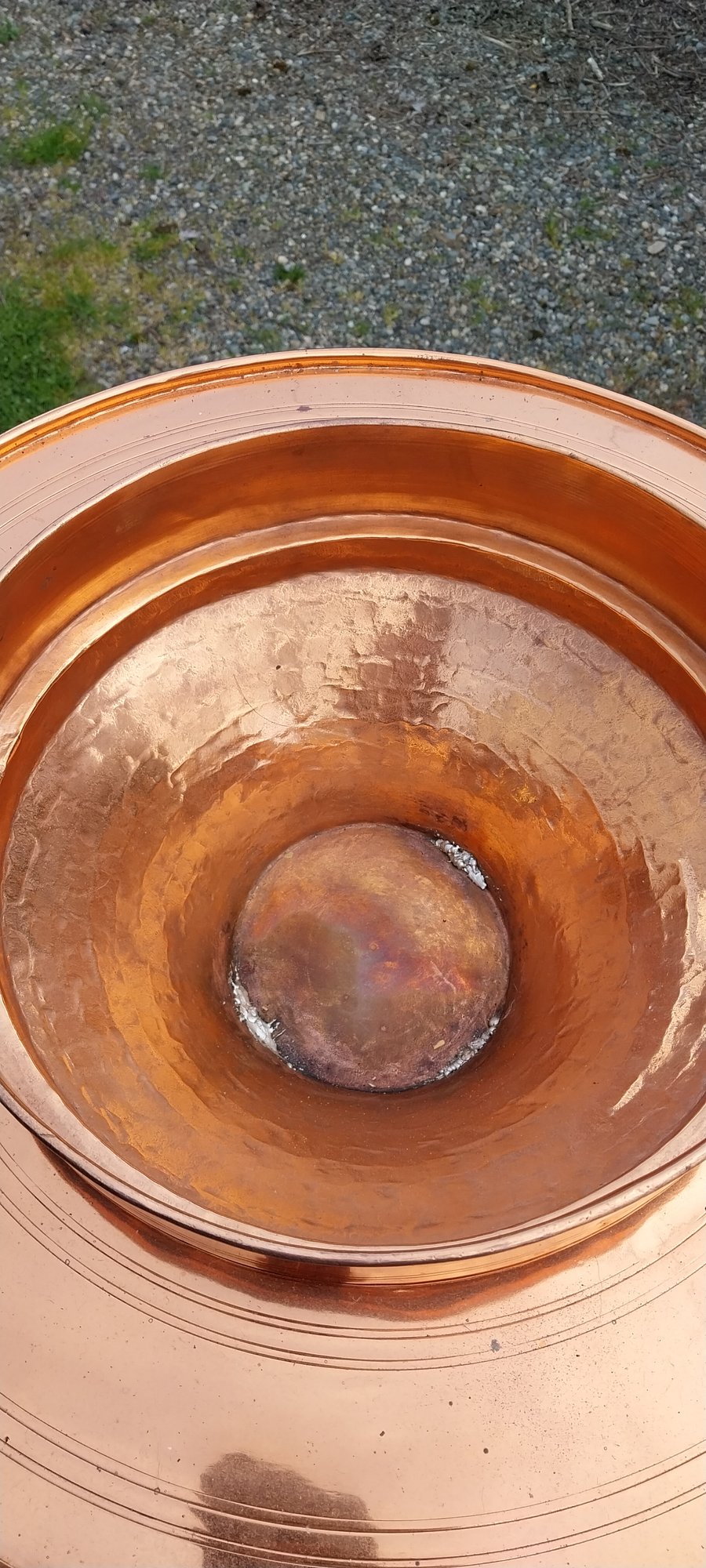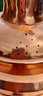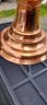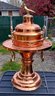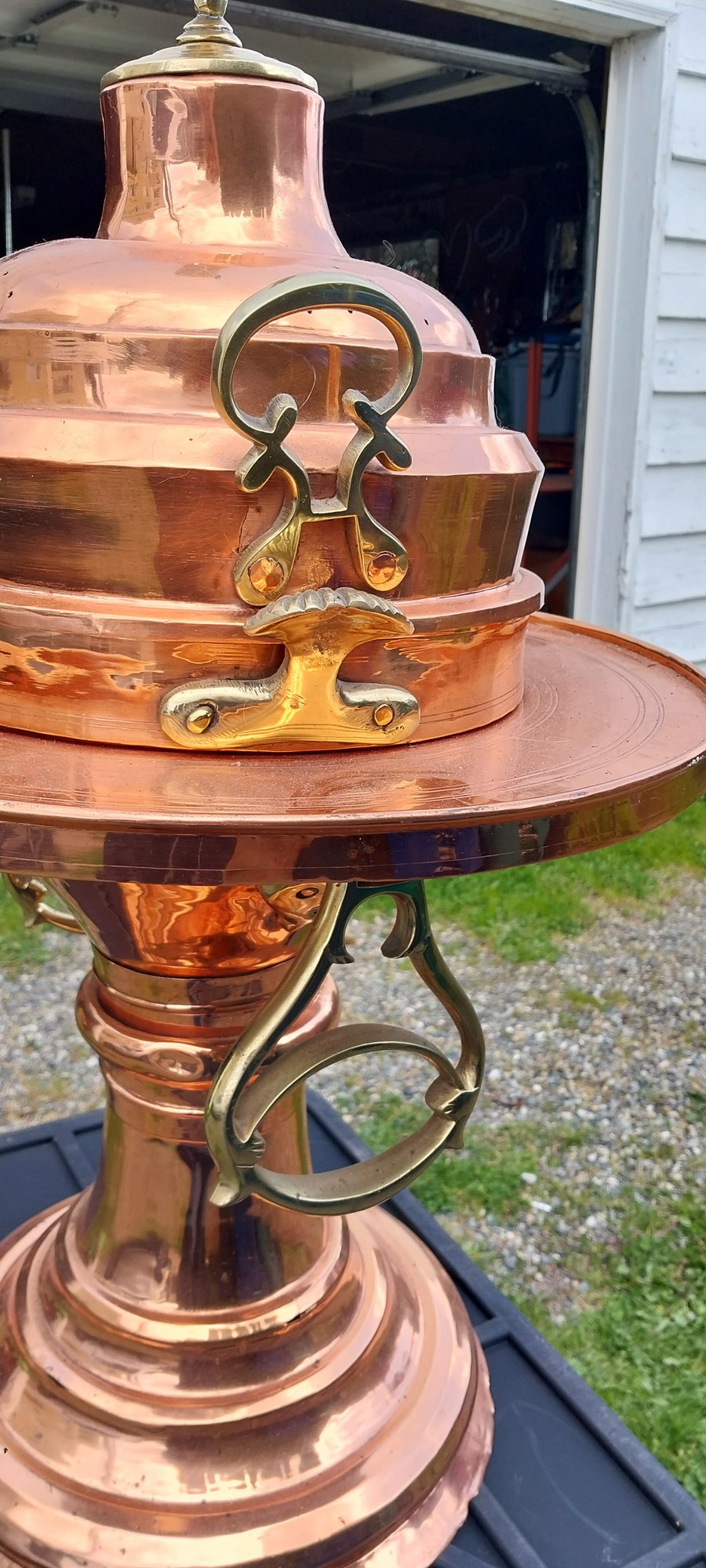 Middle eastern vintage brazier/fire pit. Made of polished brass and copper. Fine example of Turkish (Ottoman) craftsmanship. Brass bird finial, middle piece with shell form handles and lower stand with hanging handles.