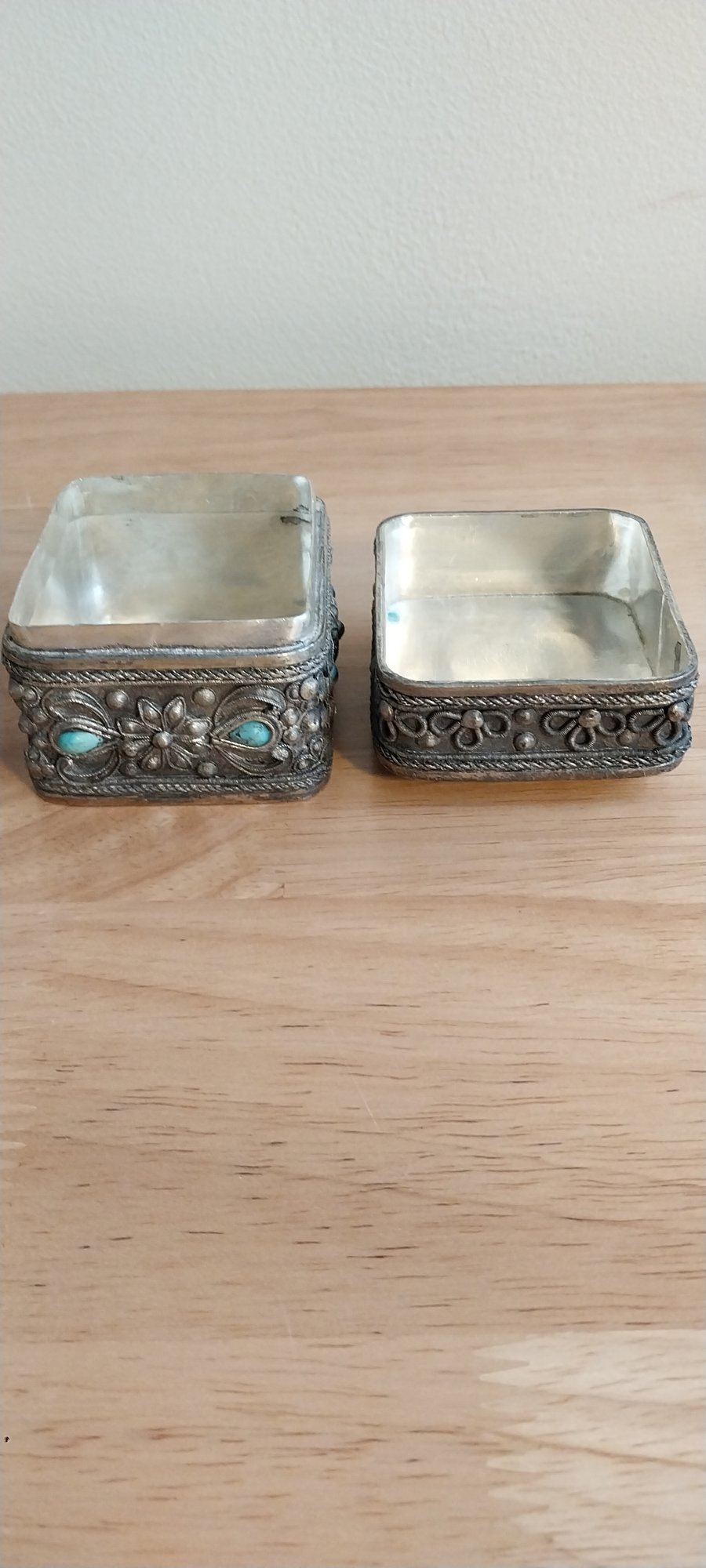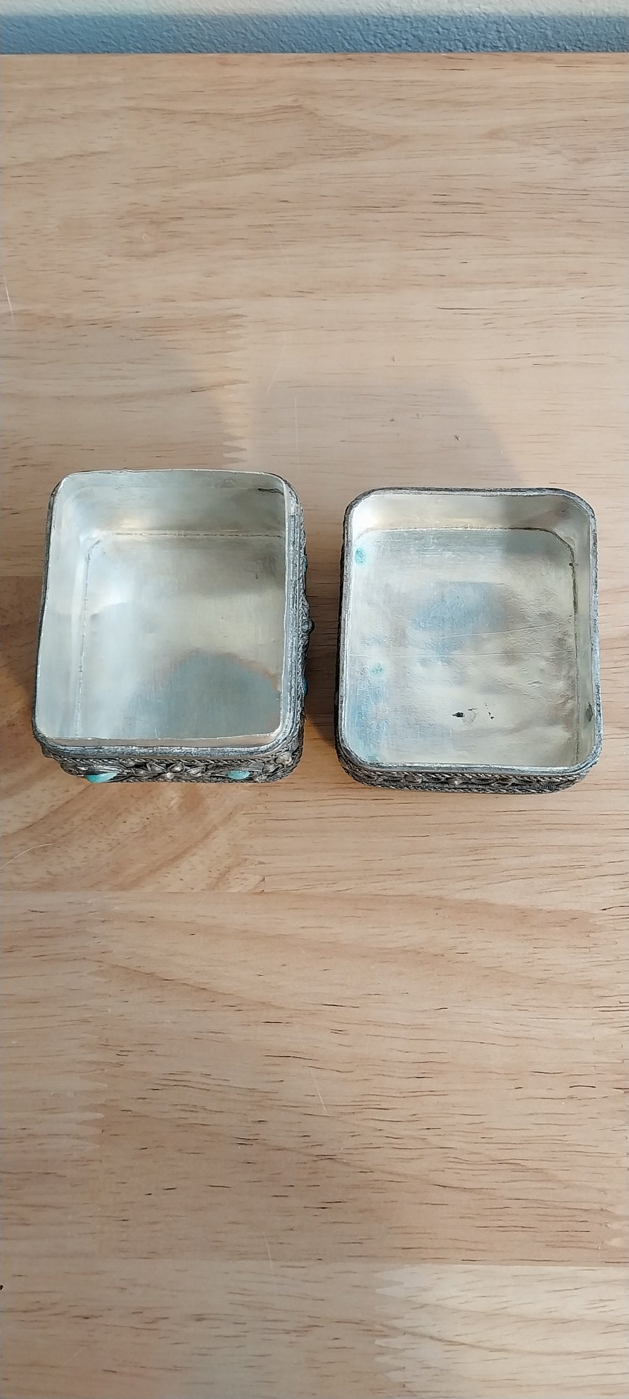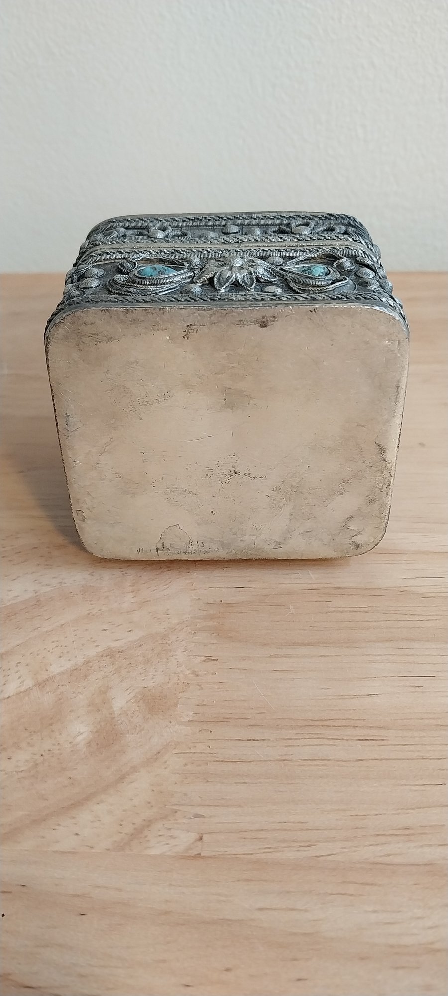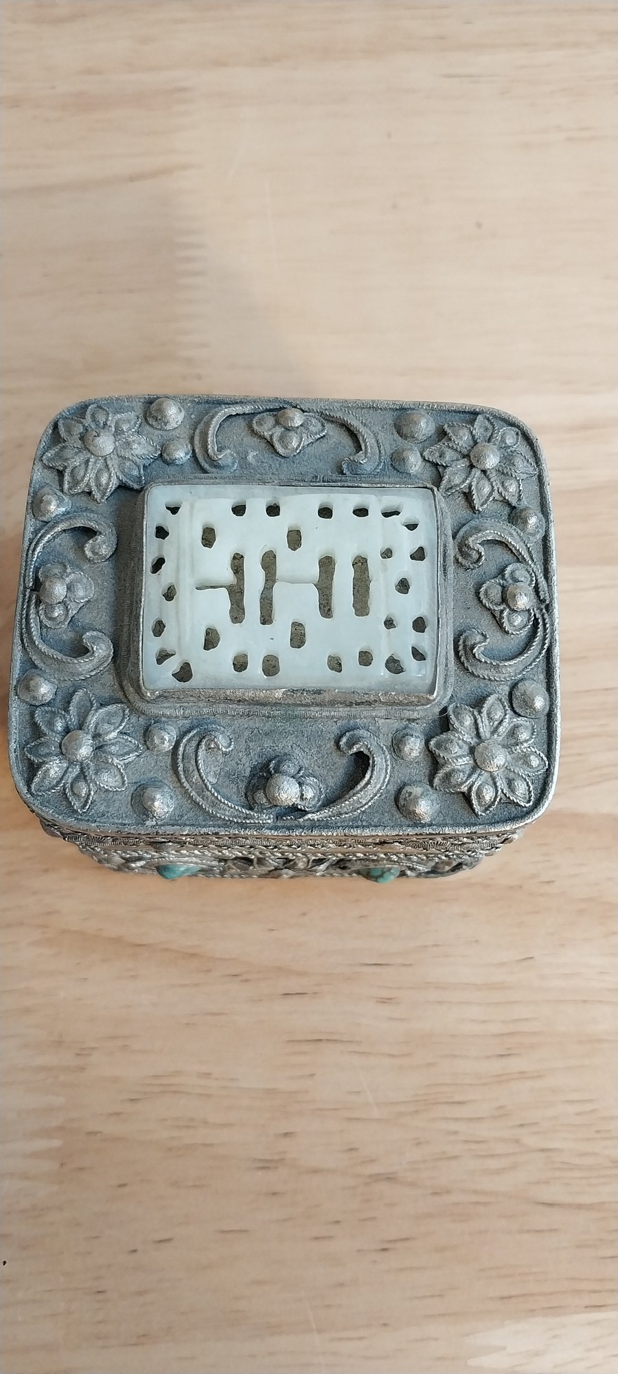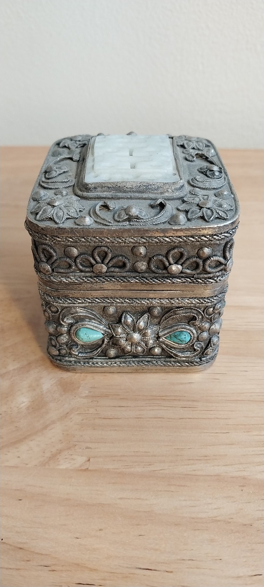 Ornate silver filigree Box with Turquoise and "Jade" insets