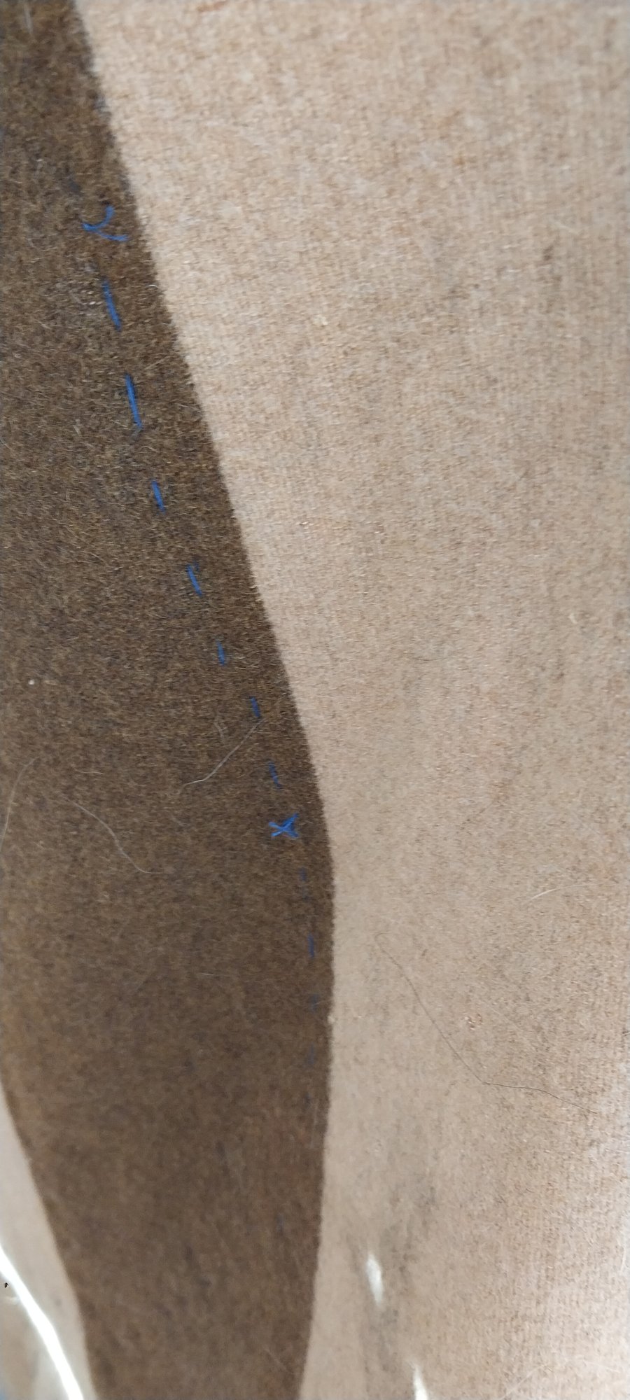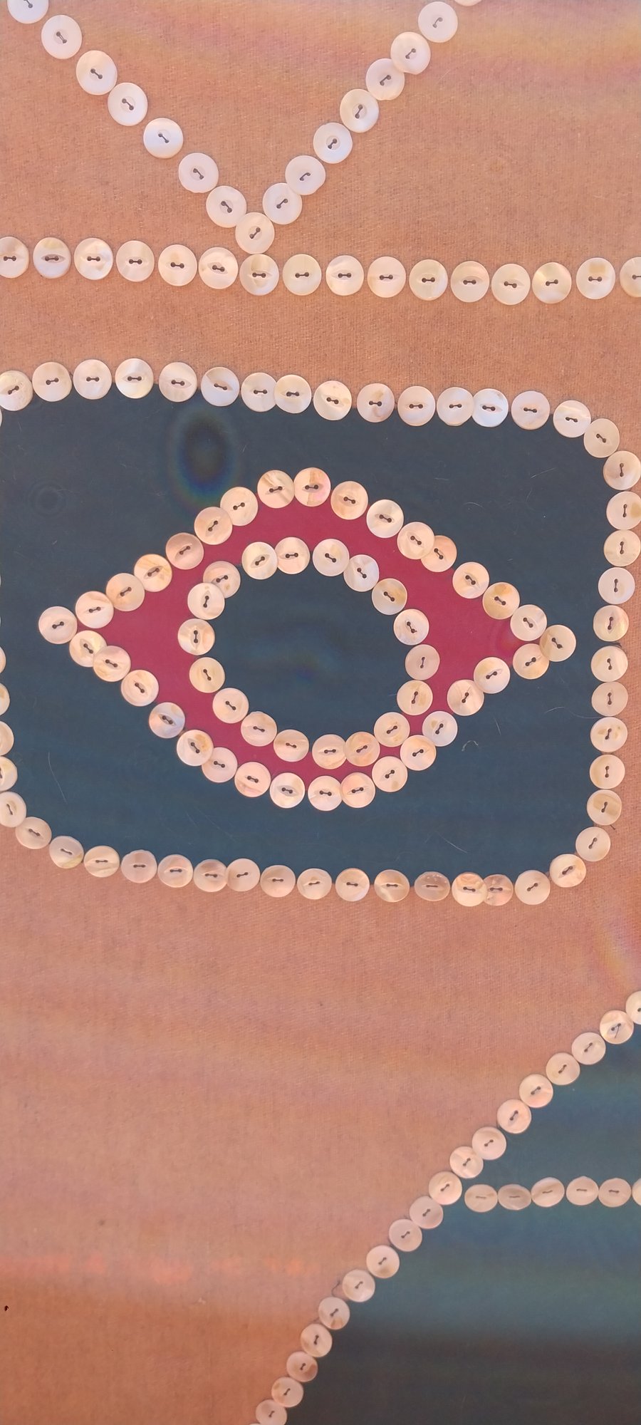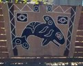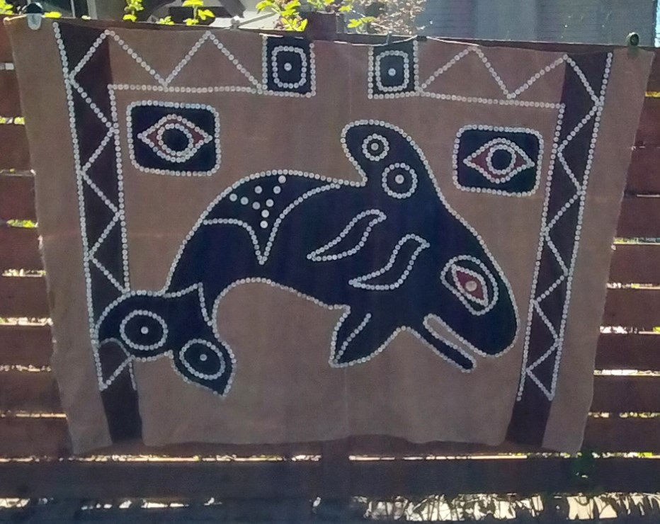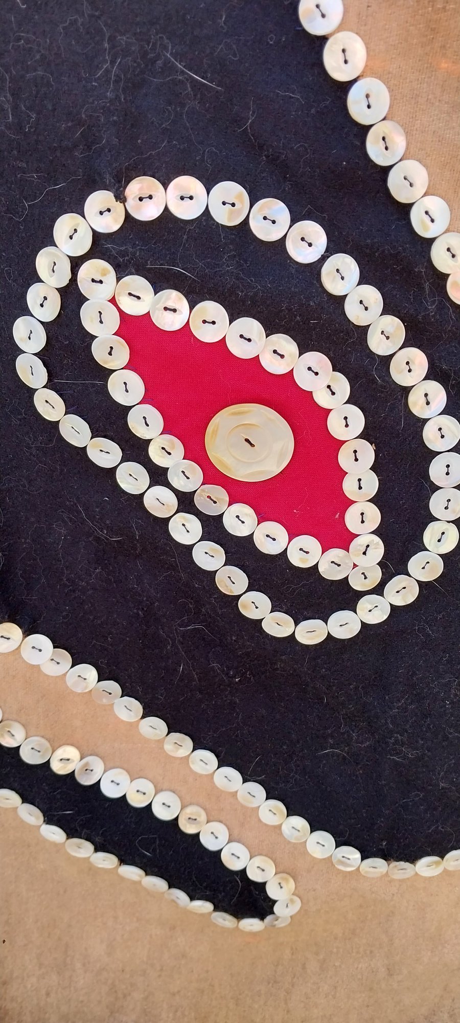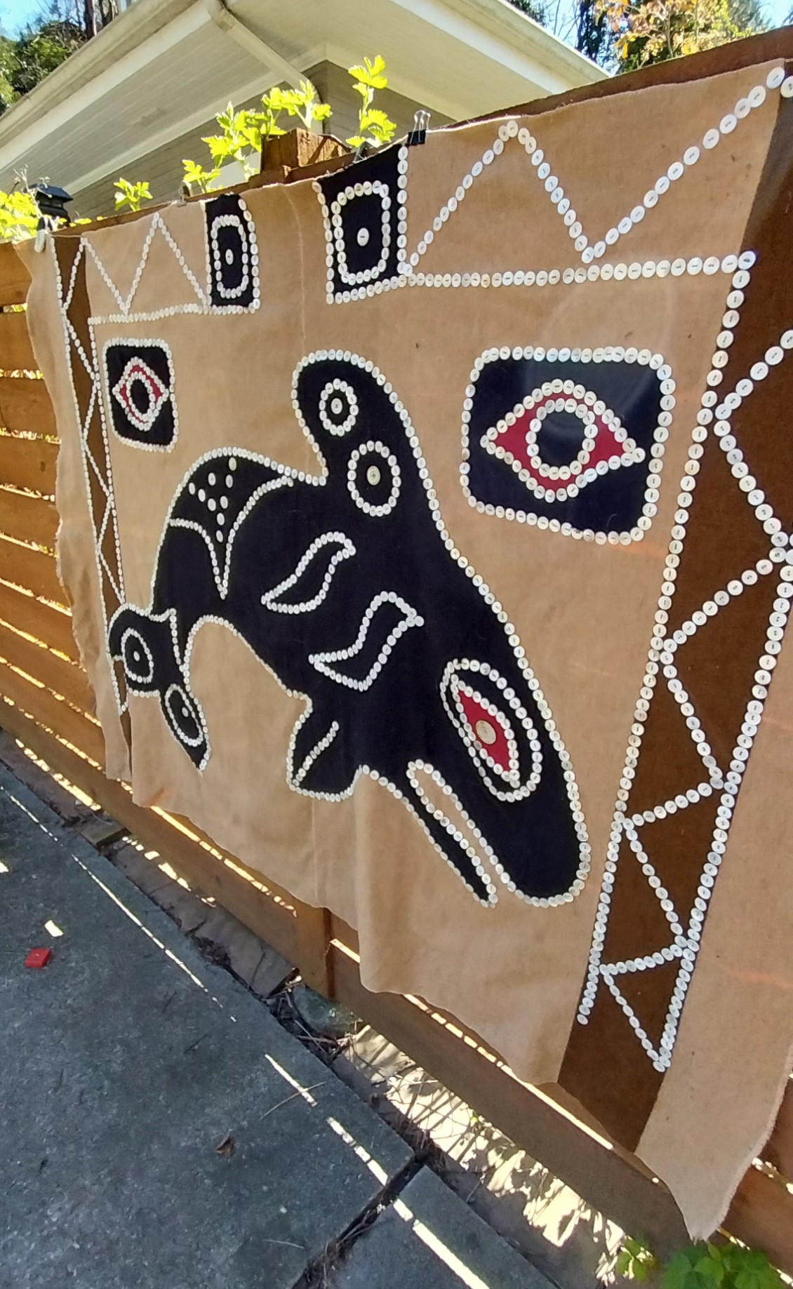 No maker's mark. Depicts an Orca. Wool trade cloth, felted wood applique, mother of pearl buttons.