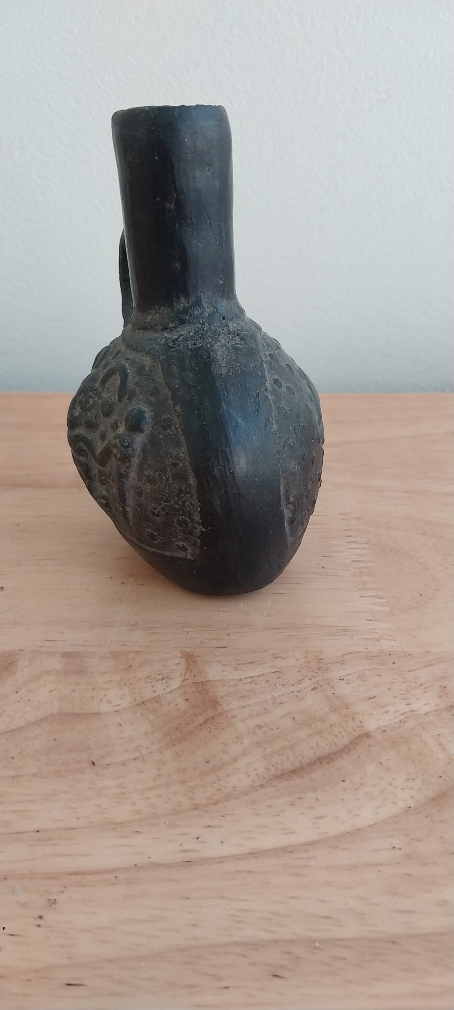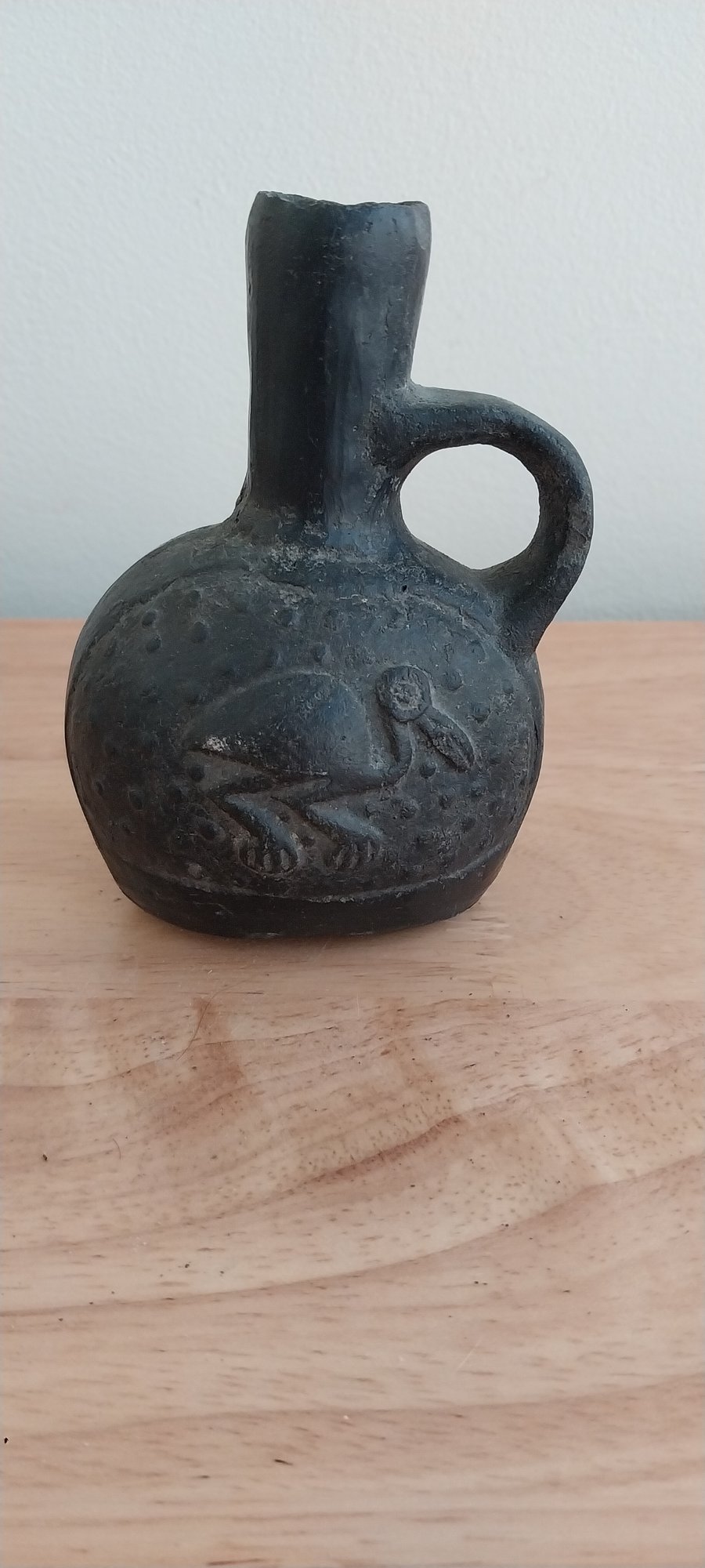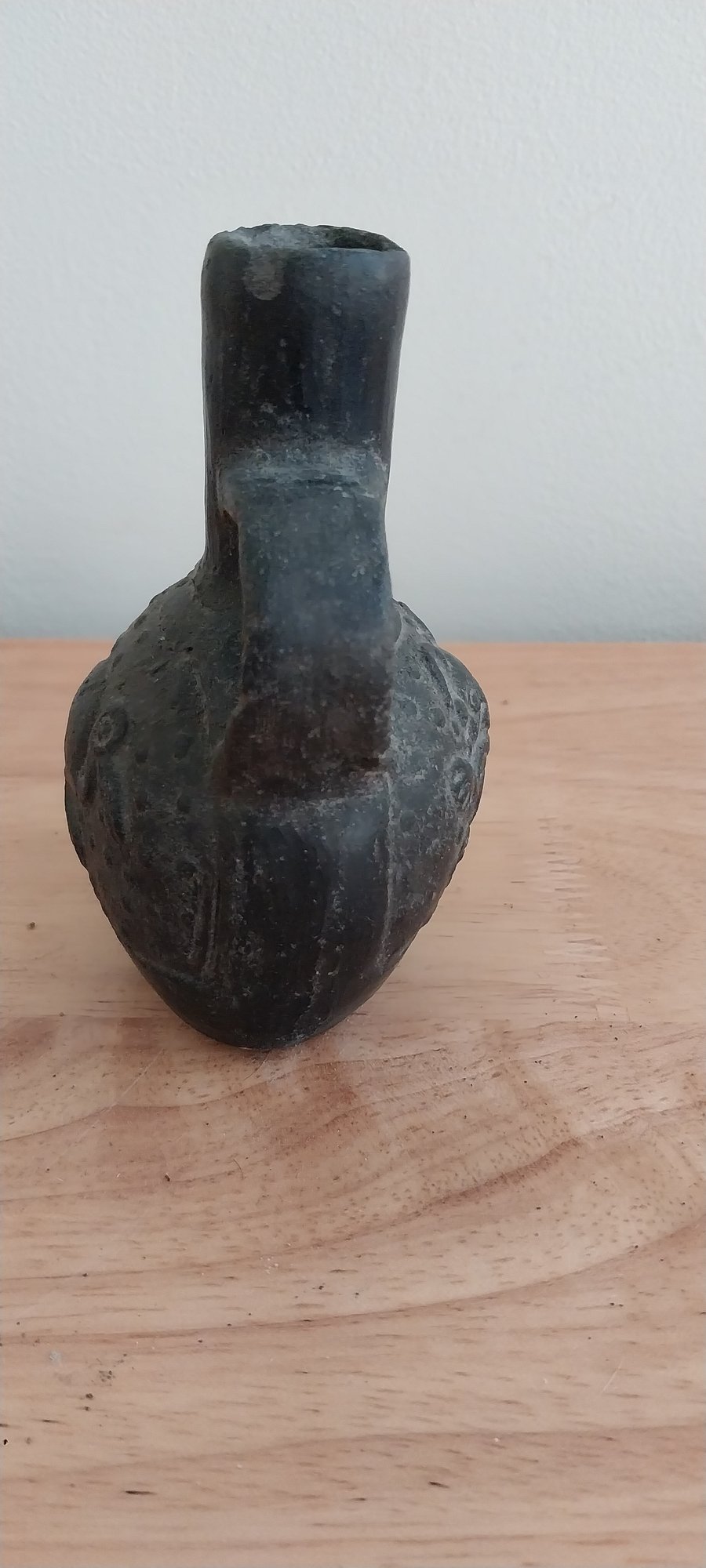 Pre-Columbian Chimu Vessel with avian and figural detailing. Stirrup spout.