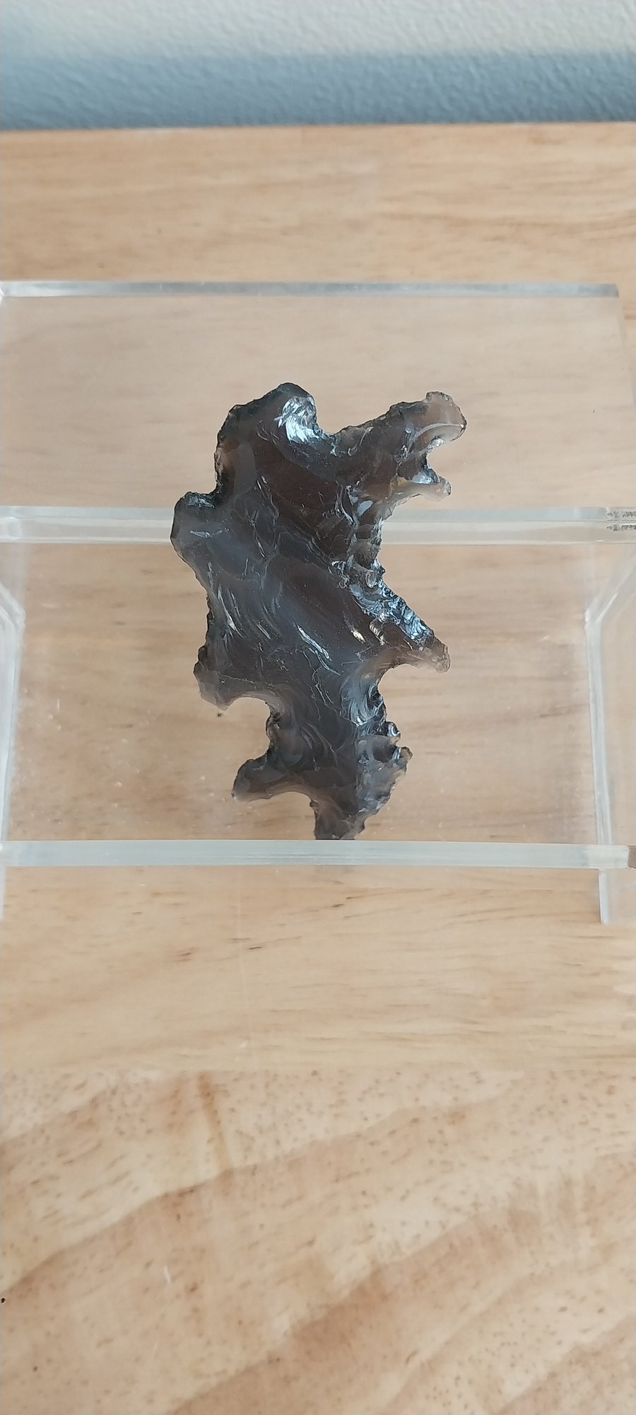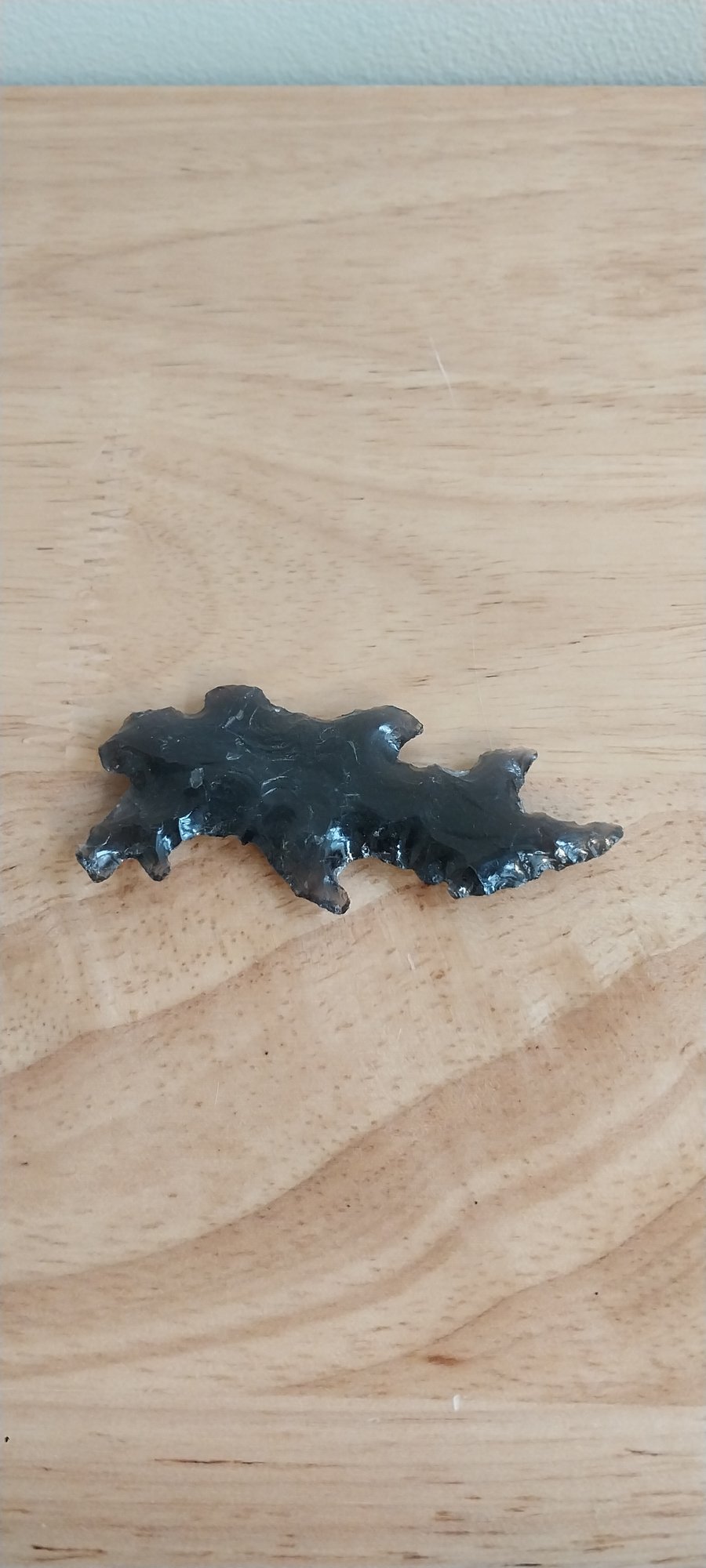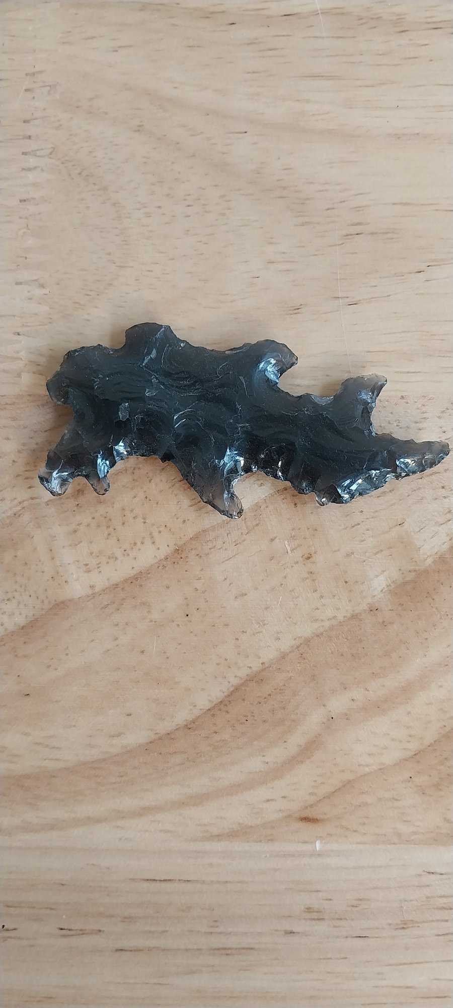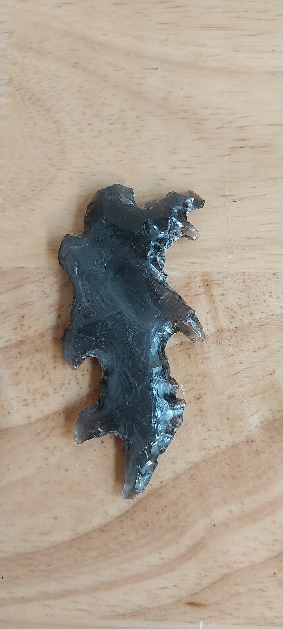 2.75" long this is a serrated Mayan eccentric obsidian knife blade/dagger point