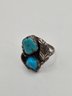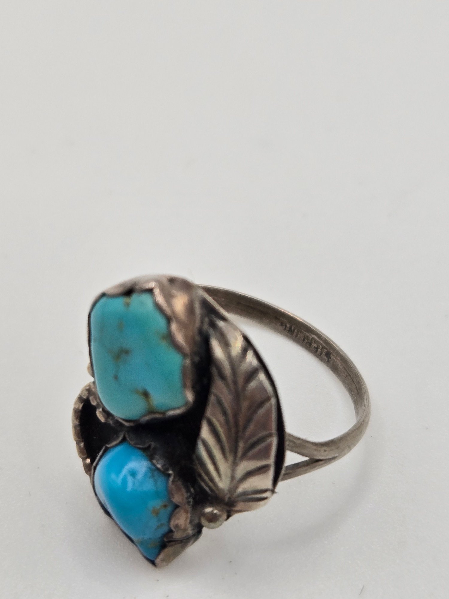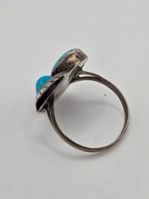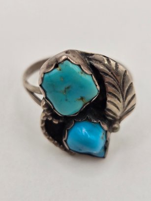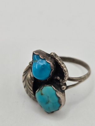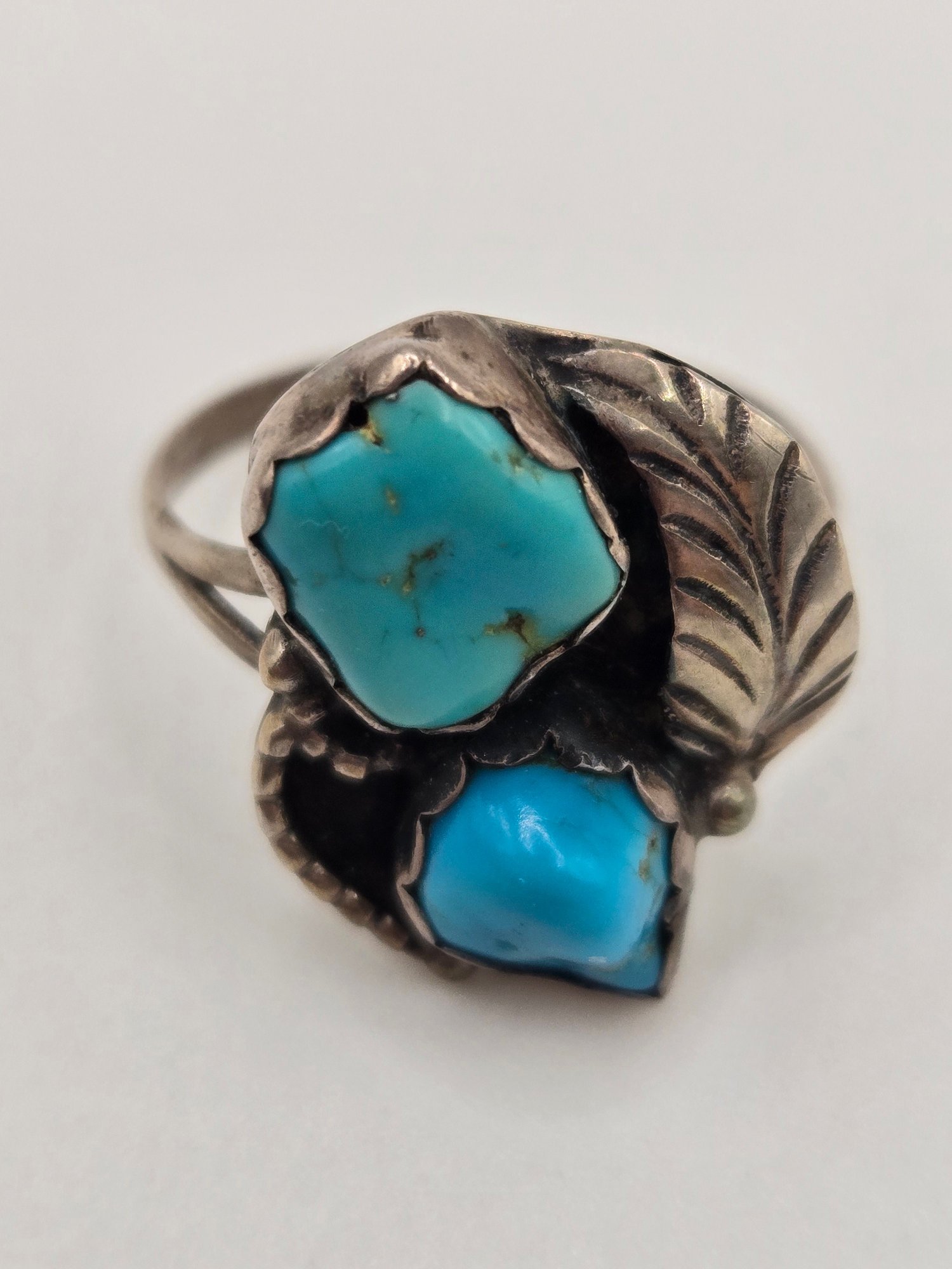 Sterling and turquoise Navajo ring. Two pieces of turquoise set into a sterling leaf motif.