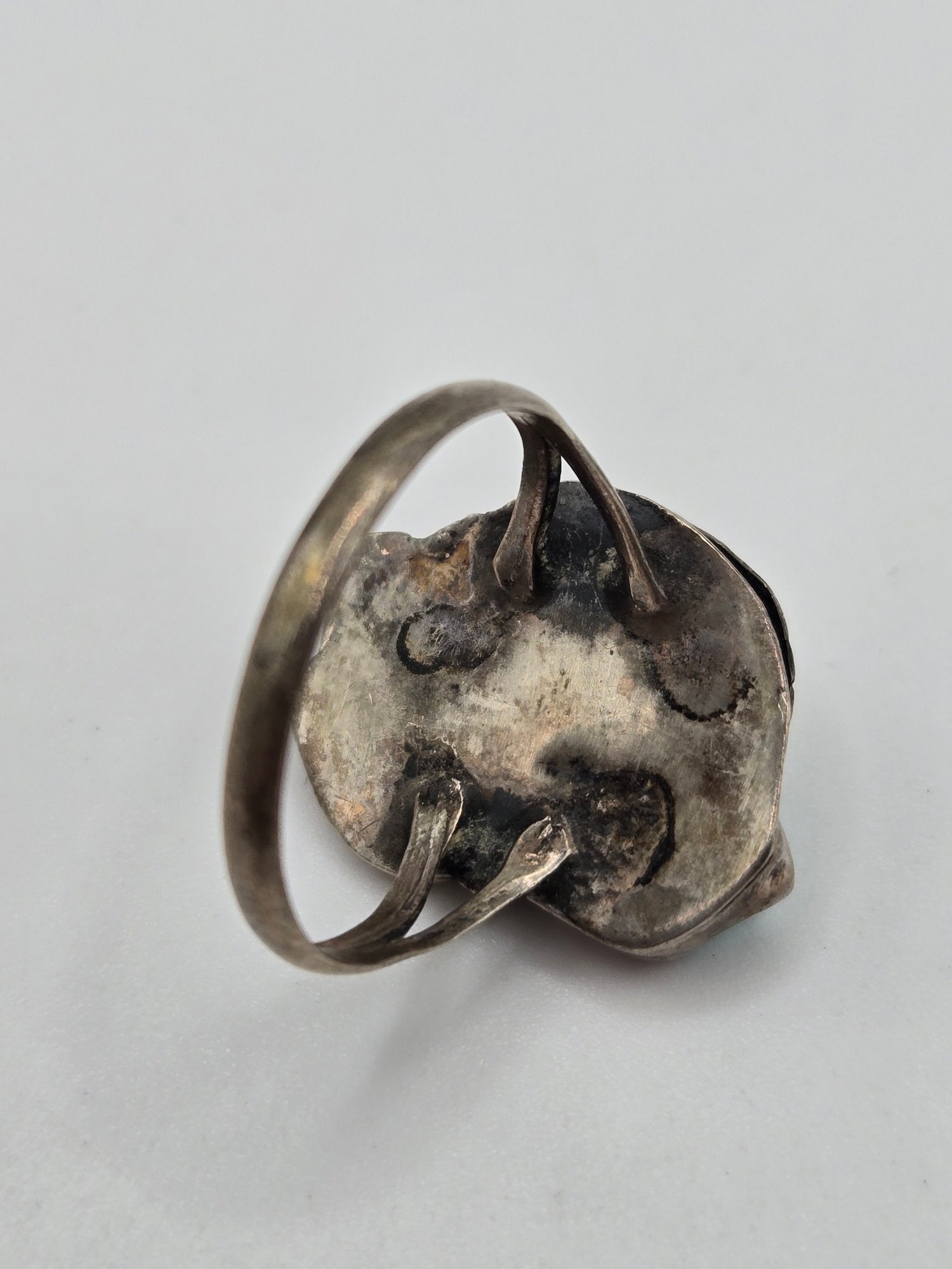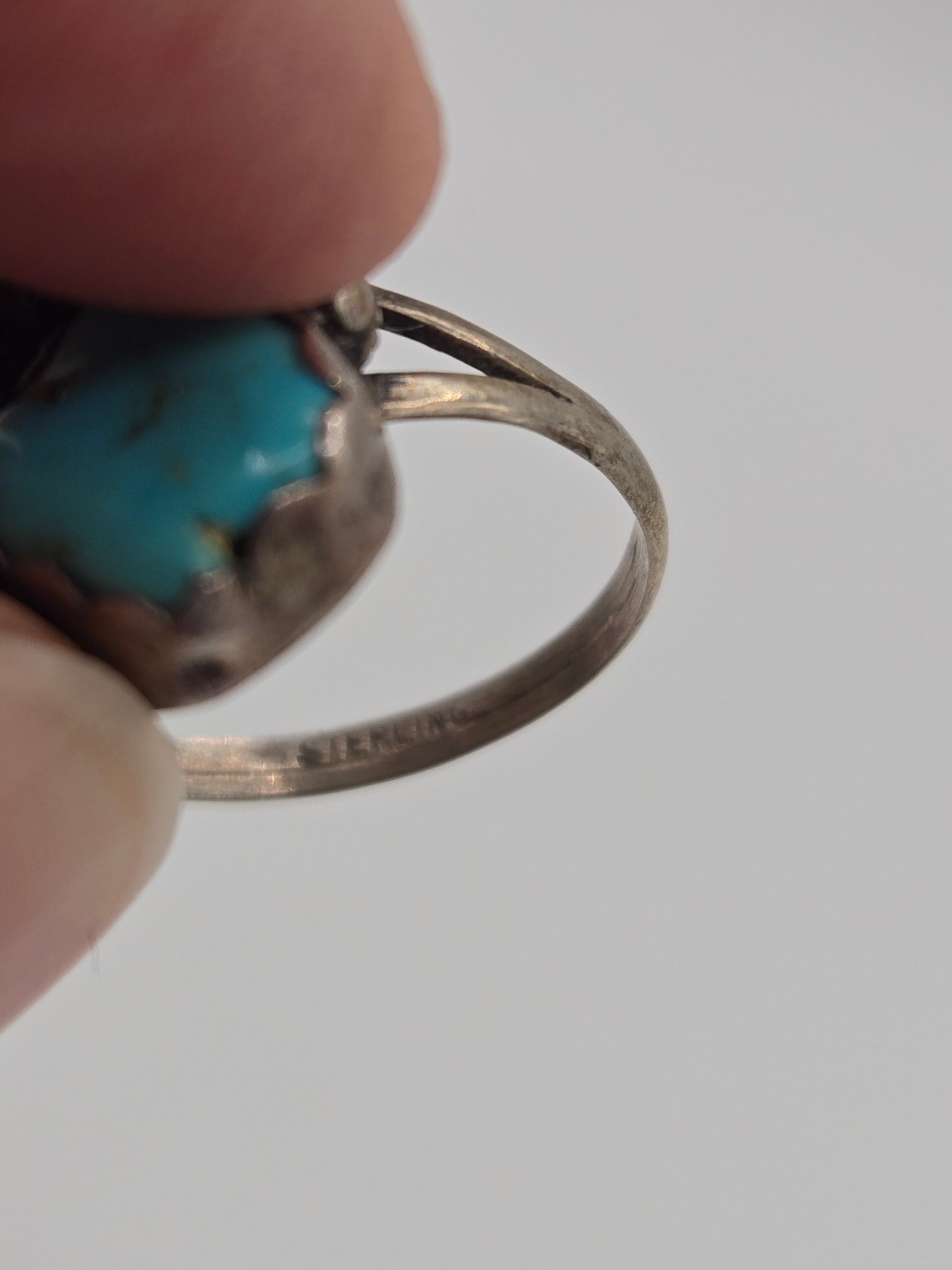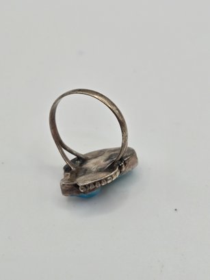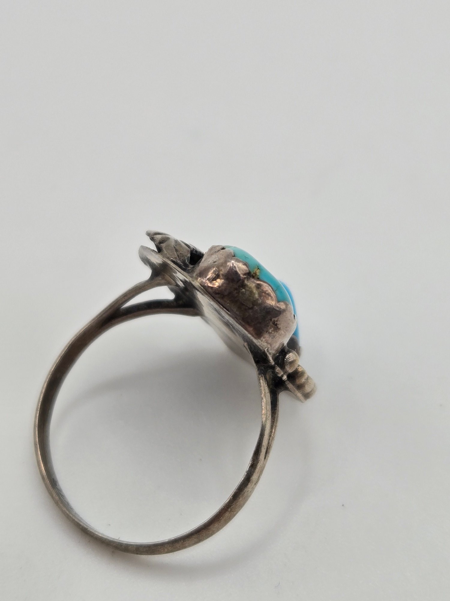 Sterling and turquoise Navajo ring. Two pieces of turquoise set into a sterling leaf motif.