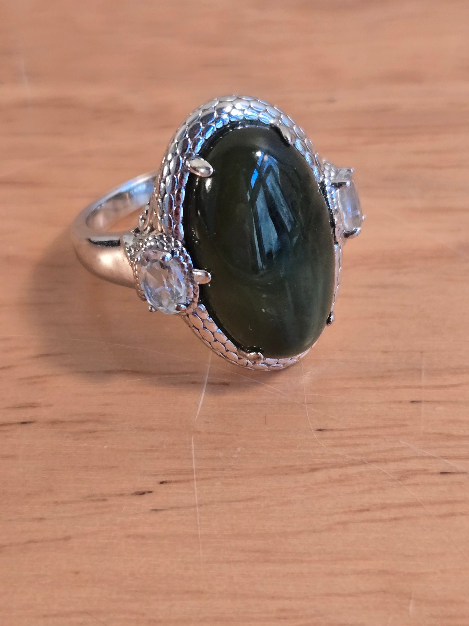 Sterling Silver and Green Mexican Agate Ring with Crystals on both sides