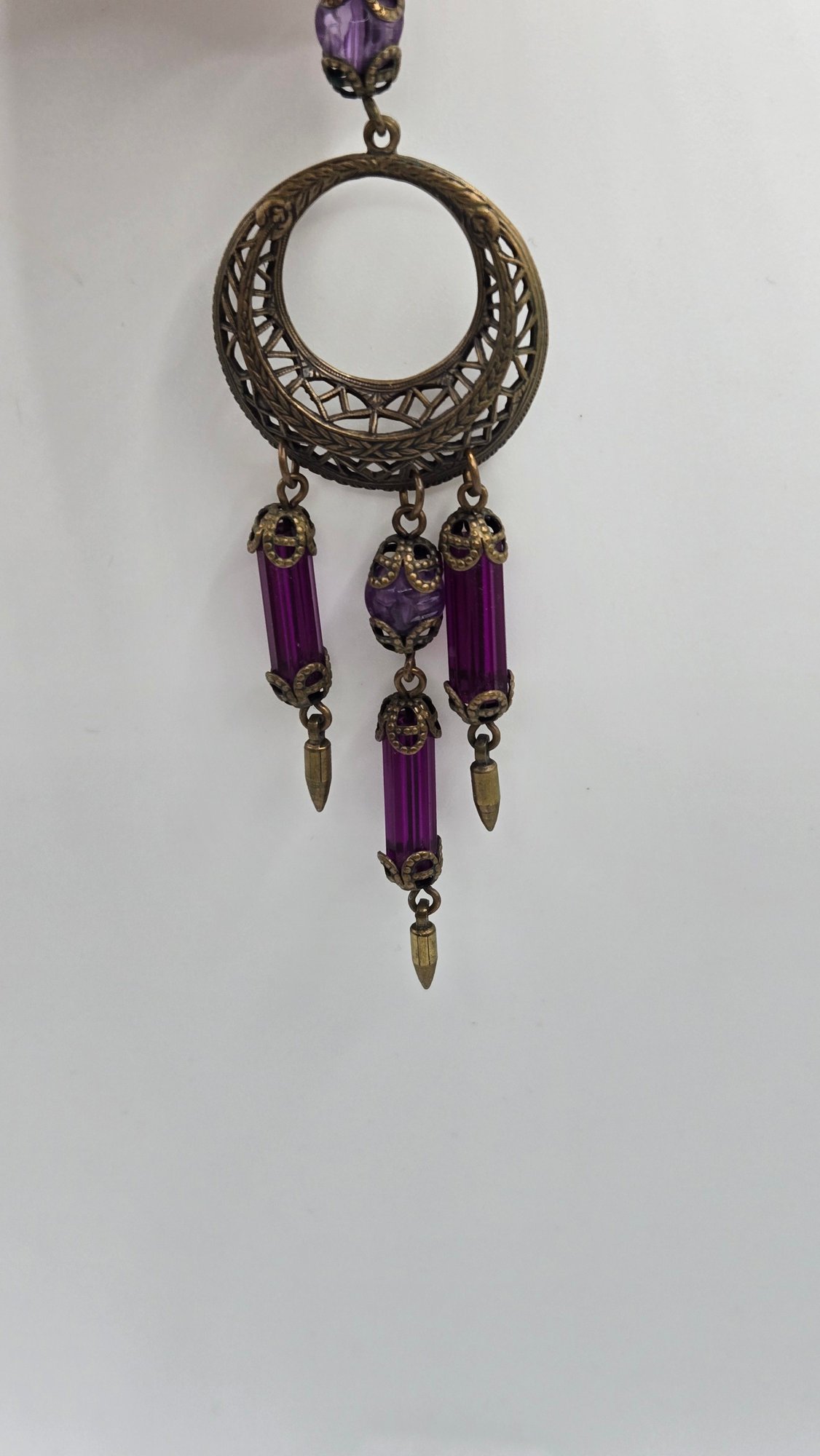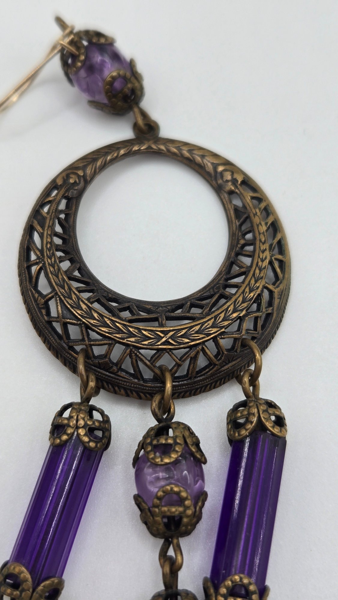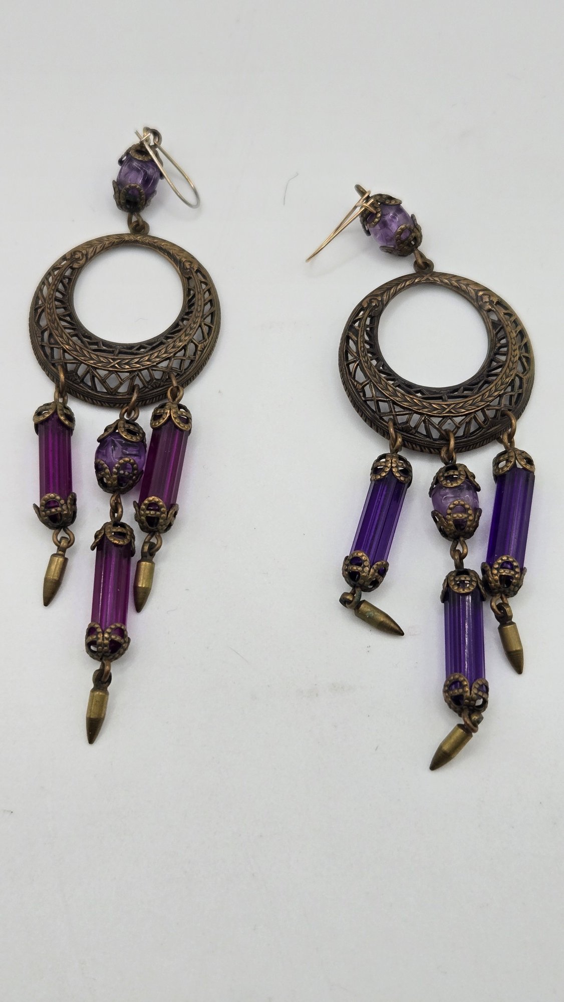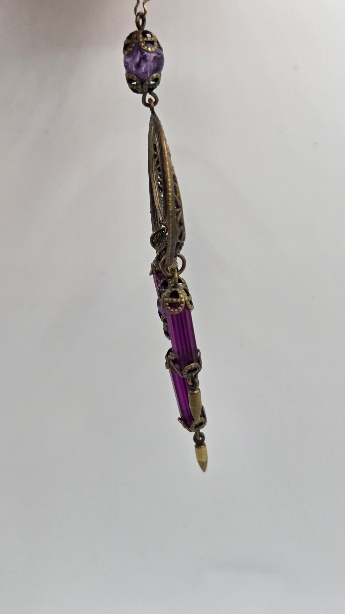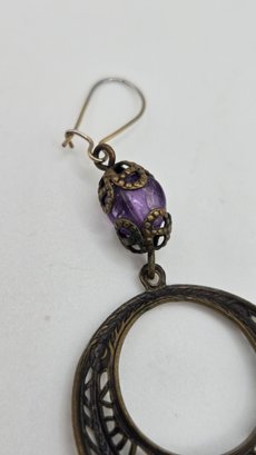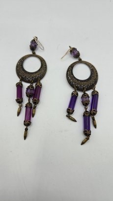 Art Nouveau long purple Bohemian glass chandelier earrings. Beveled glass and filigree