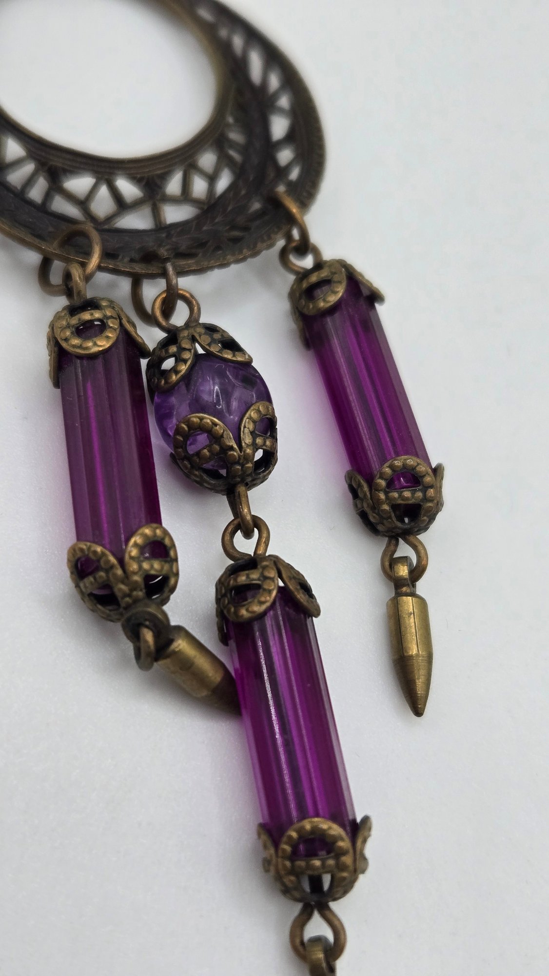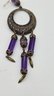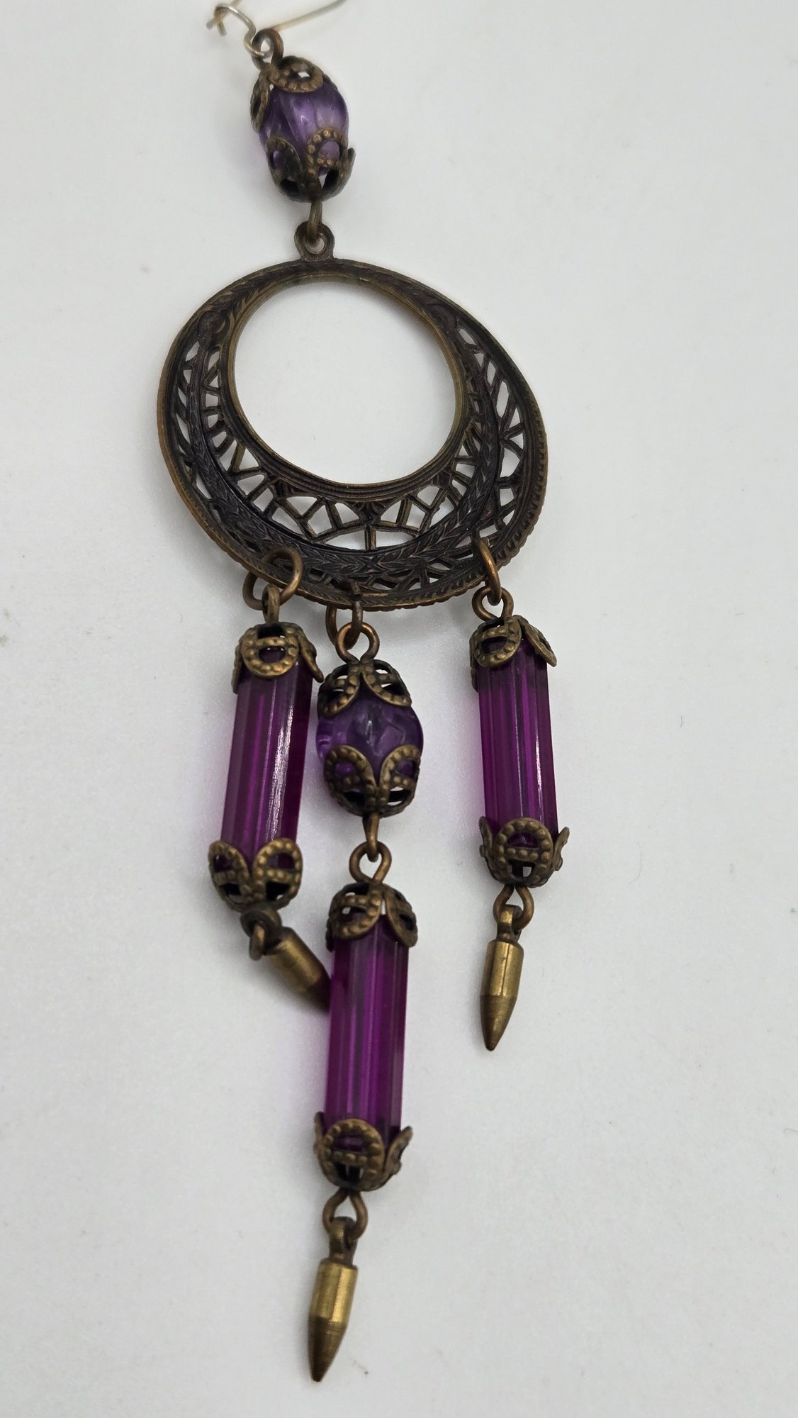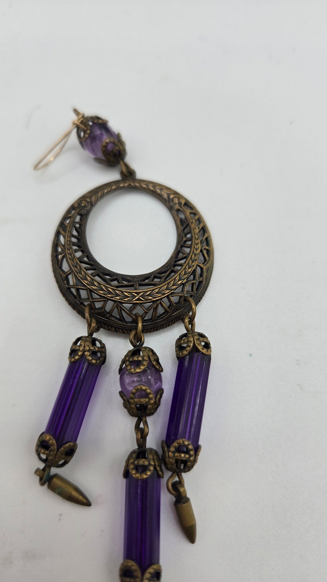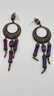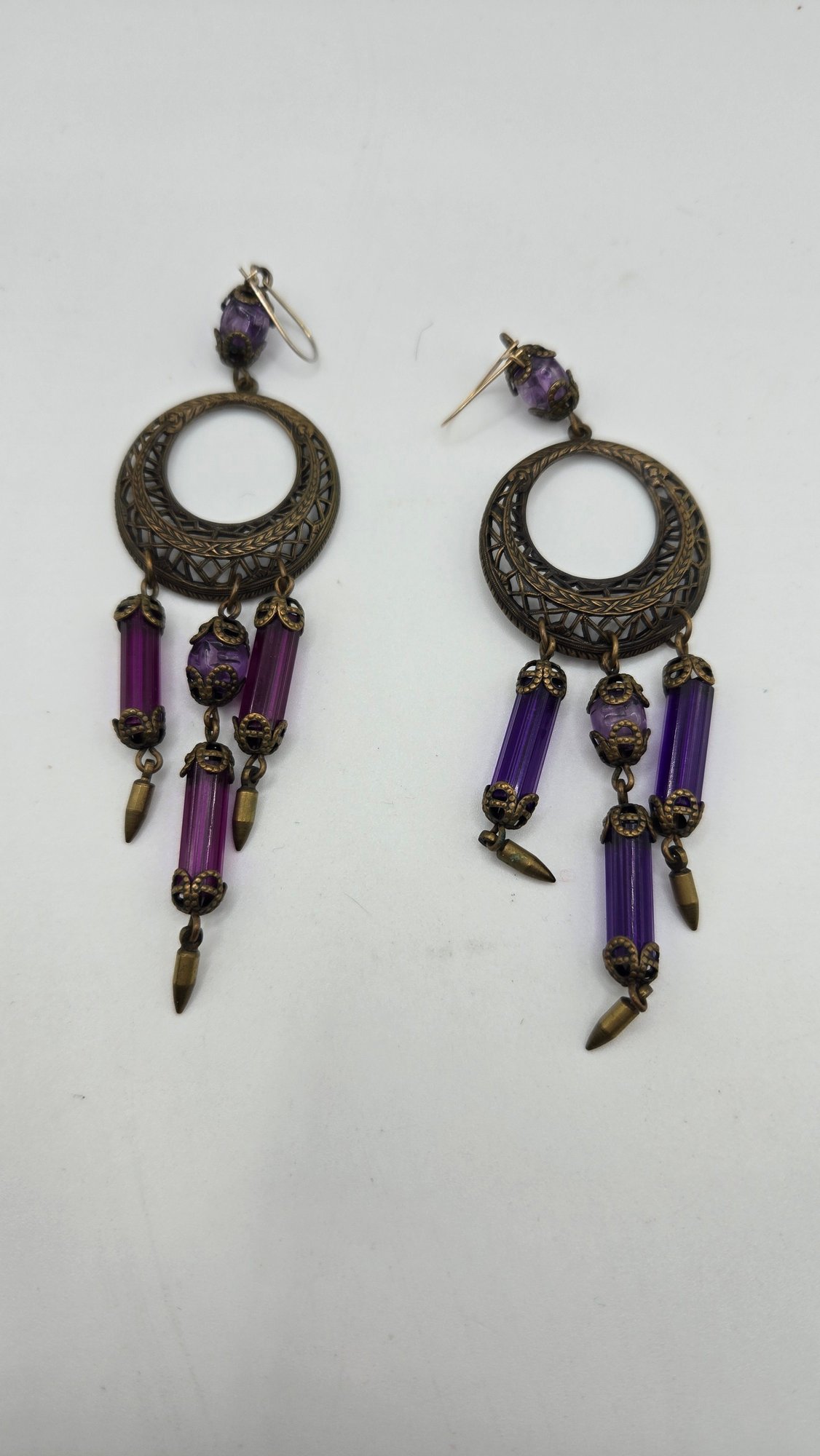 Art Nouveau long purple Bohemian glass chandelier earrings. Beveled glass and filigree