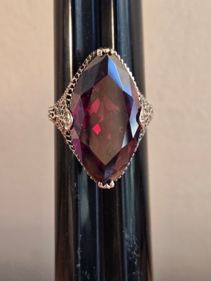 Antique reproduction ring in sterling silver. Simulated marquise cut ruby gem stone.