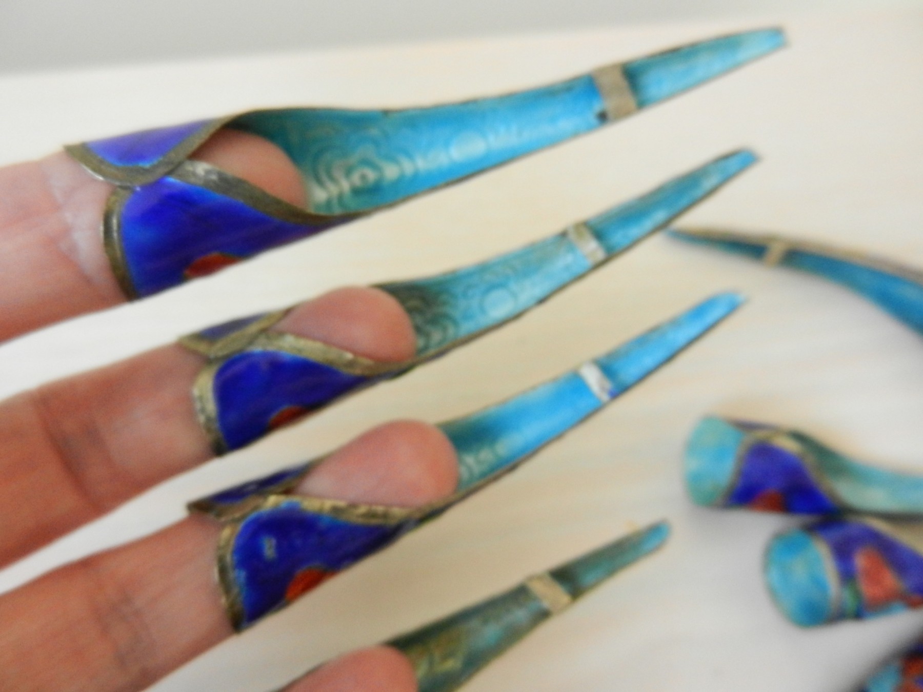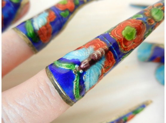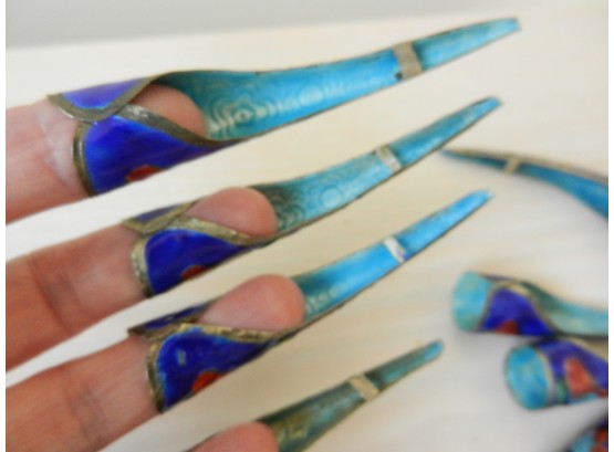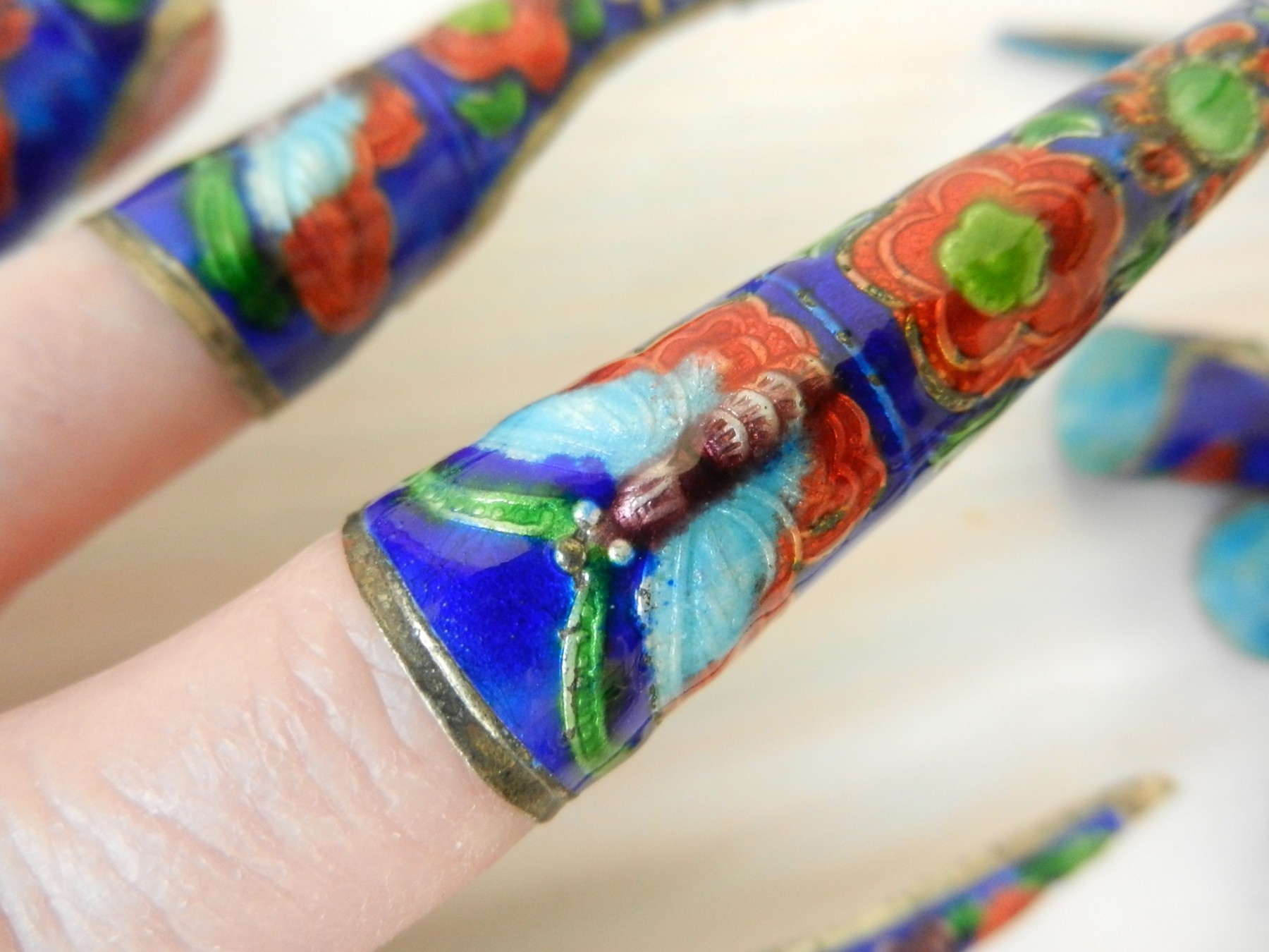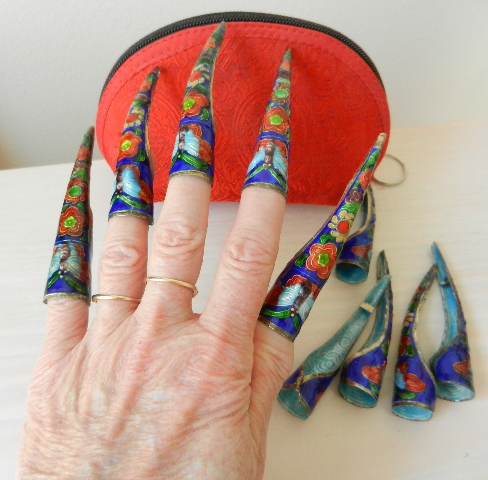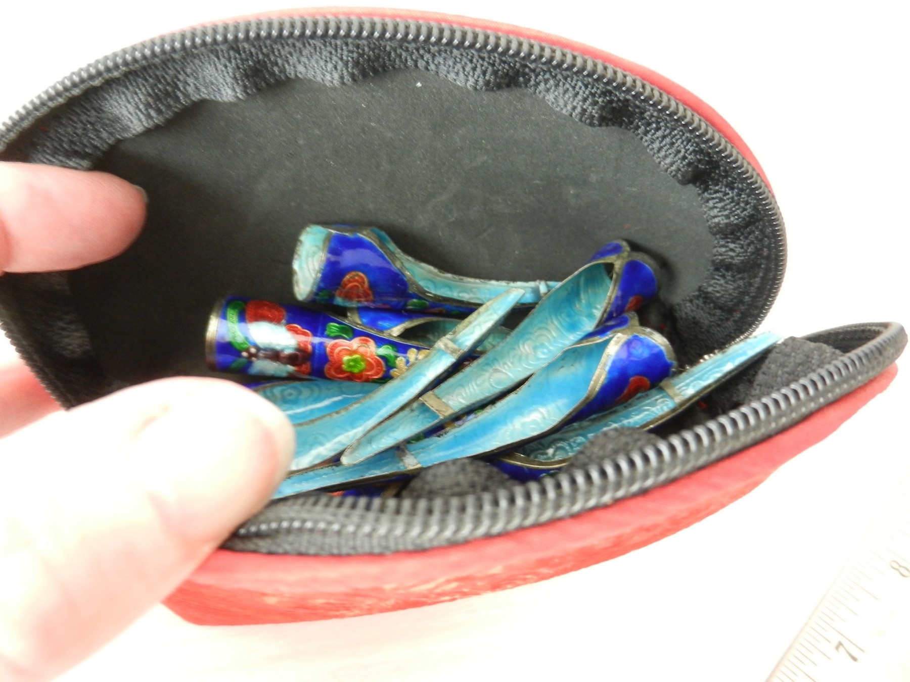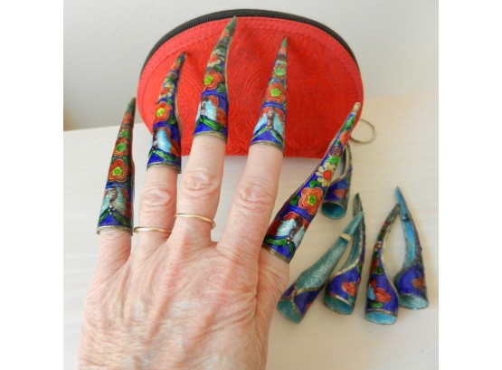 Vintage 10 enamel nail guard protectors in red satin zip bag (DP67)