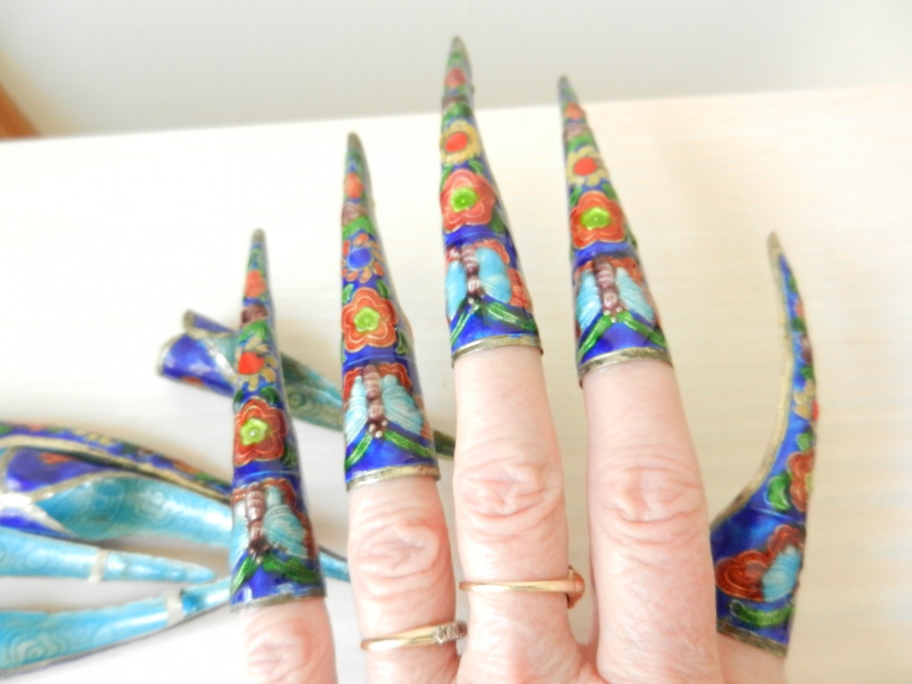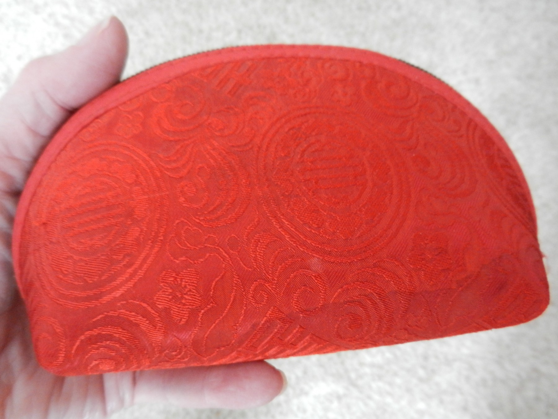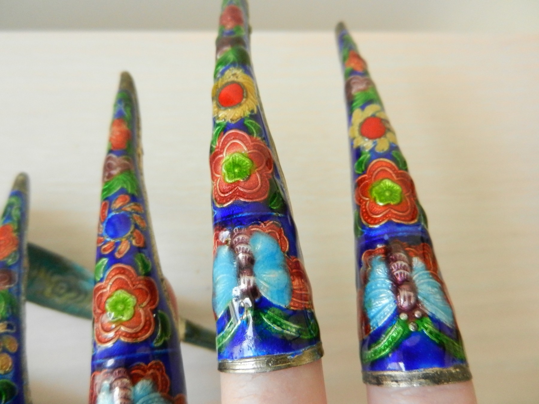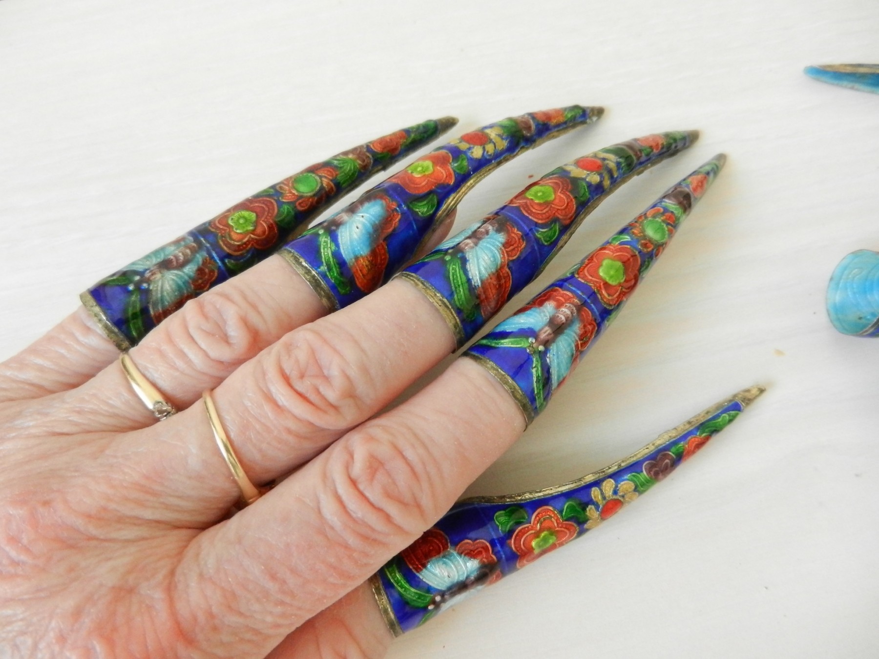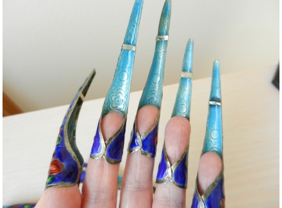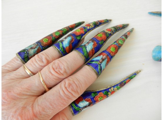 Vintage 10 enamel nail guard protectors in red satin zip bag (DP67)
