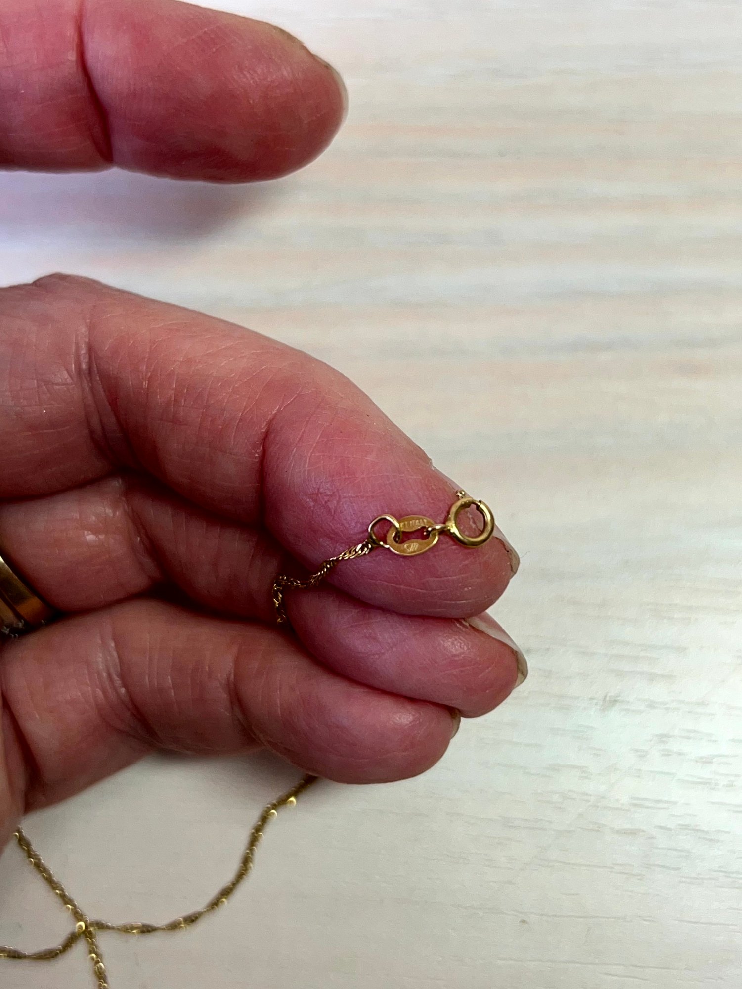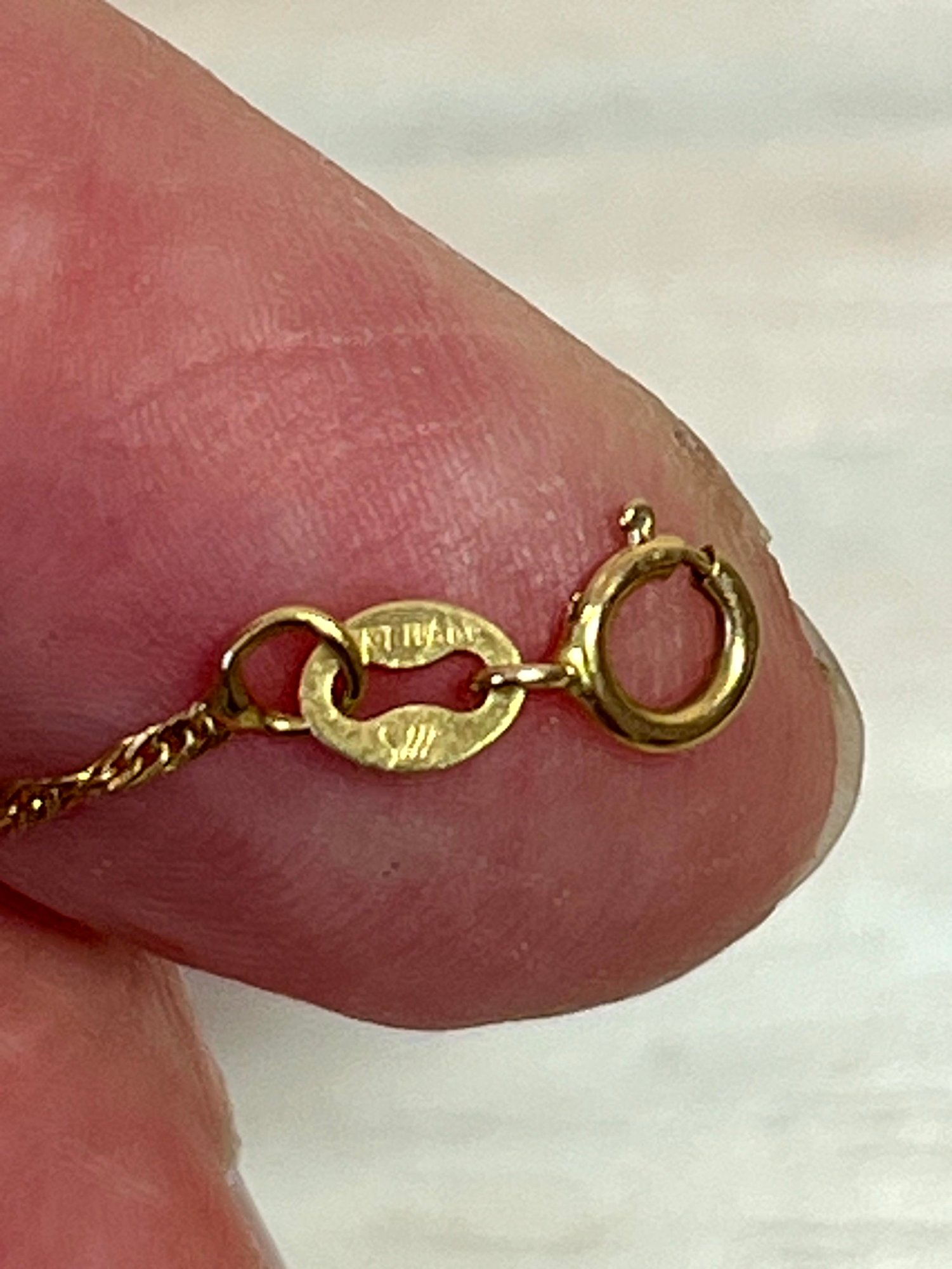 Marked 585 on the clasp and 14kt Italy with BB and a three heart symbol on the lozenge.